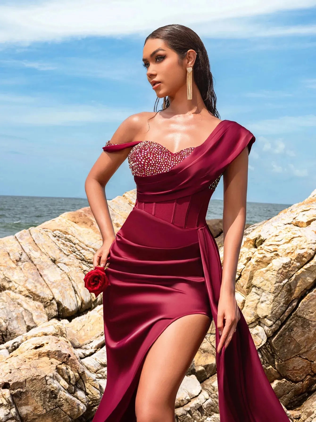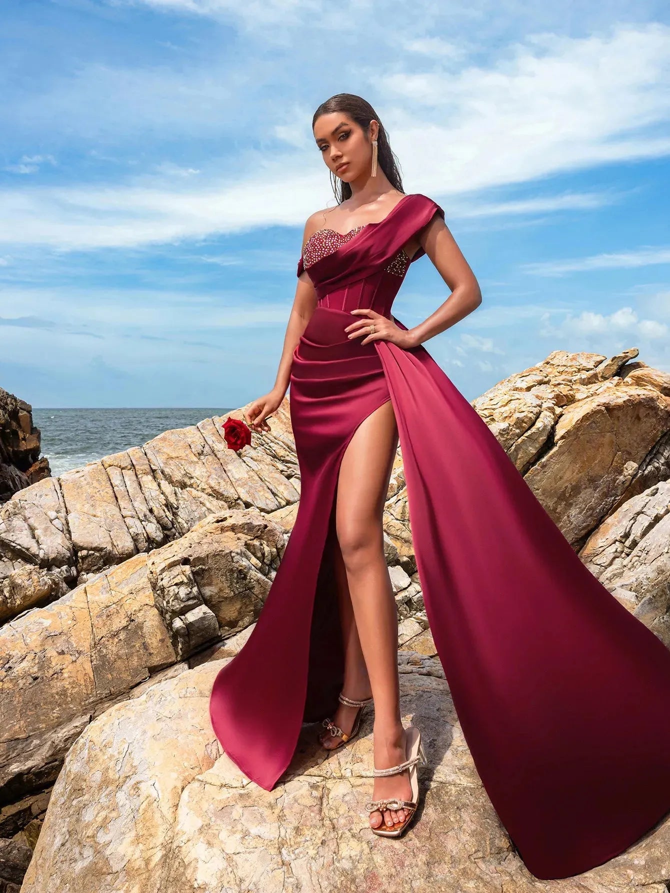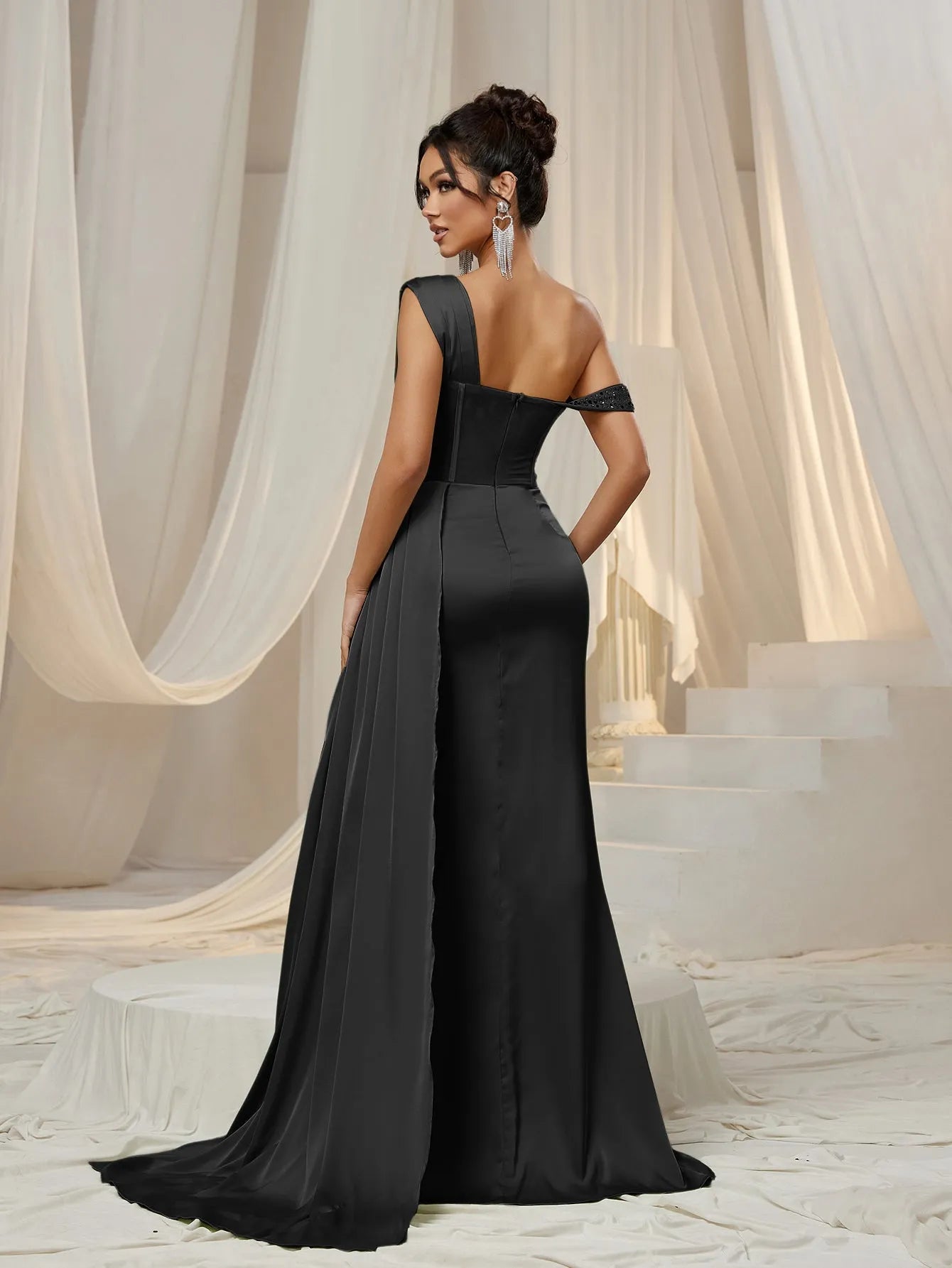 • Design: One-shoulder neckline with a fitted bodice, intricate sequins, dramatic thigh-high slit, and flowing draped panel