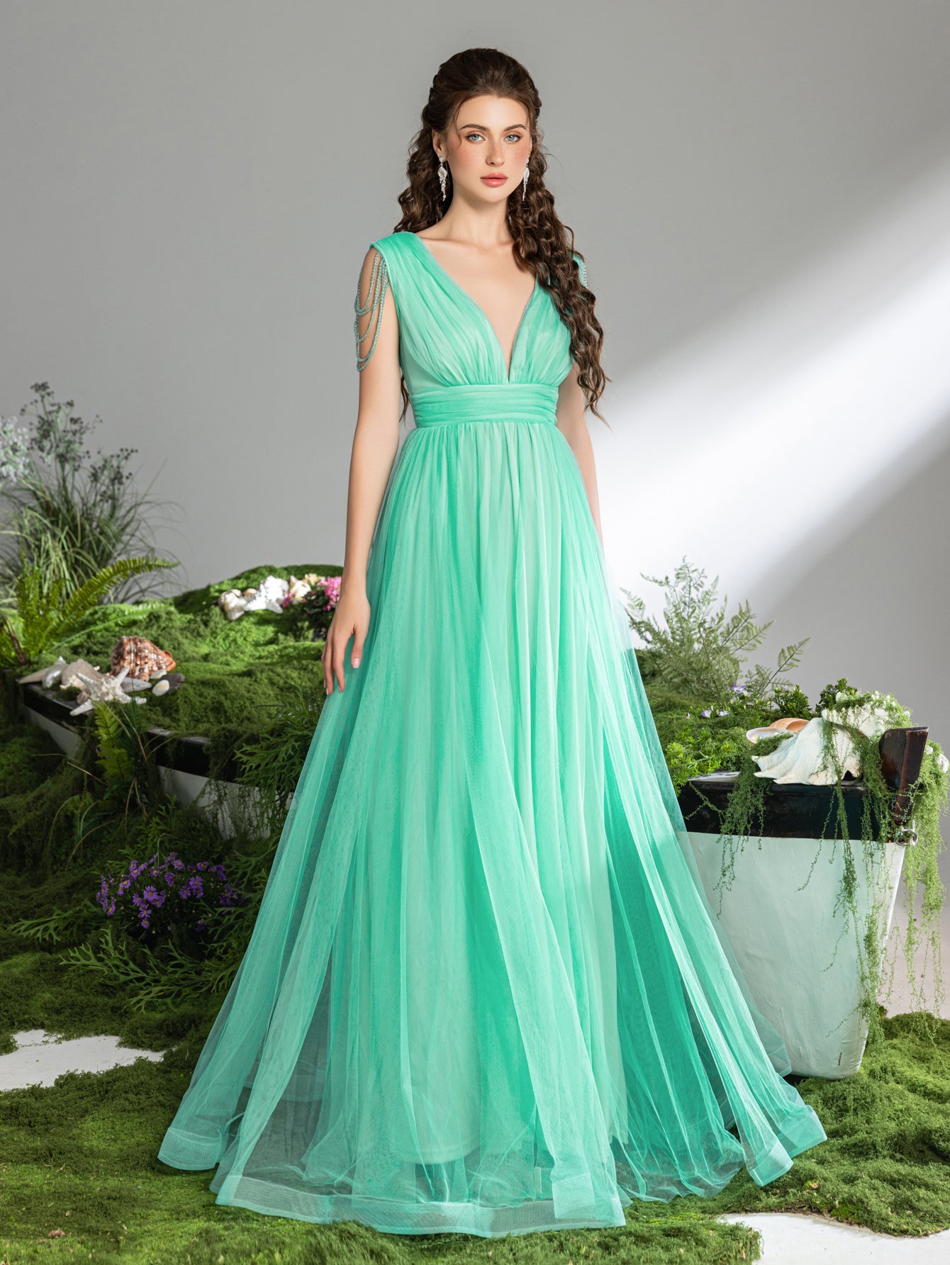 Grace every occasion with our Ethereal Tulle A-Line Gown. A vision of classic elegance, this gown boasts a plunging V-neckline complemented by a gracefully cinched waist and a full, flowing skirt that cascades to the ground in soft folds. Delicate shoulder beading adds a touch of sophistication, while the tailored bodice transitions seamlessly into a voluminous skirt, creating a universally flattering silhouette. Crafted for versatility, this dress is perfect for bridesmaids, proms, and elegant evening affairs, easily adapting to any color to match the theme of your event.