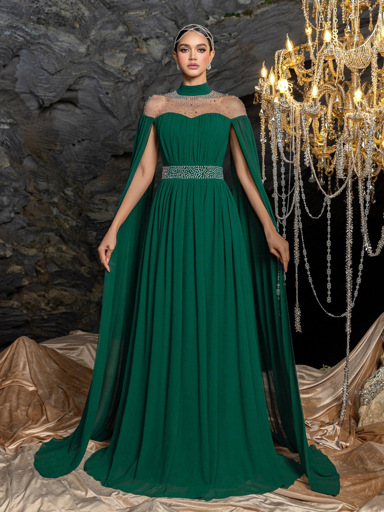 Dramatic Cape Evening Dress | High Neck Chiffon with Rhinestone Details