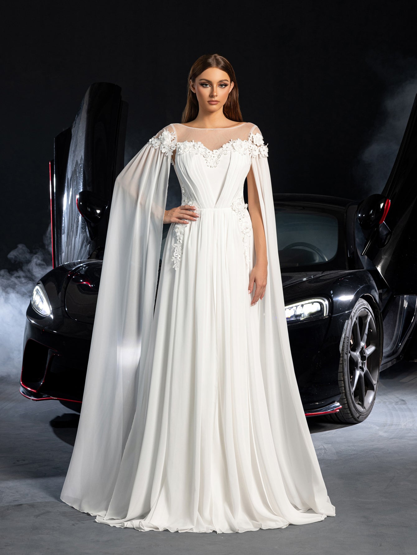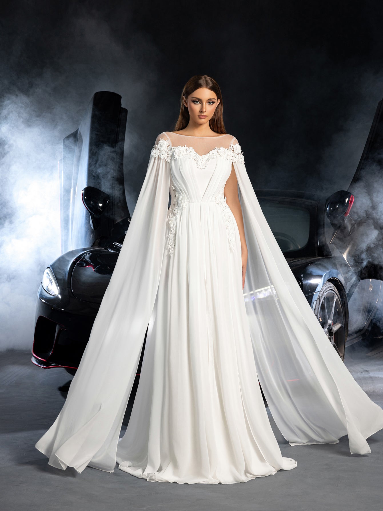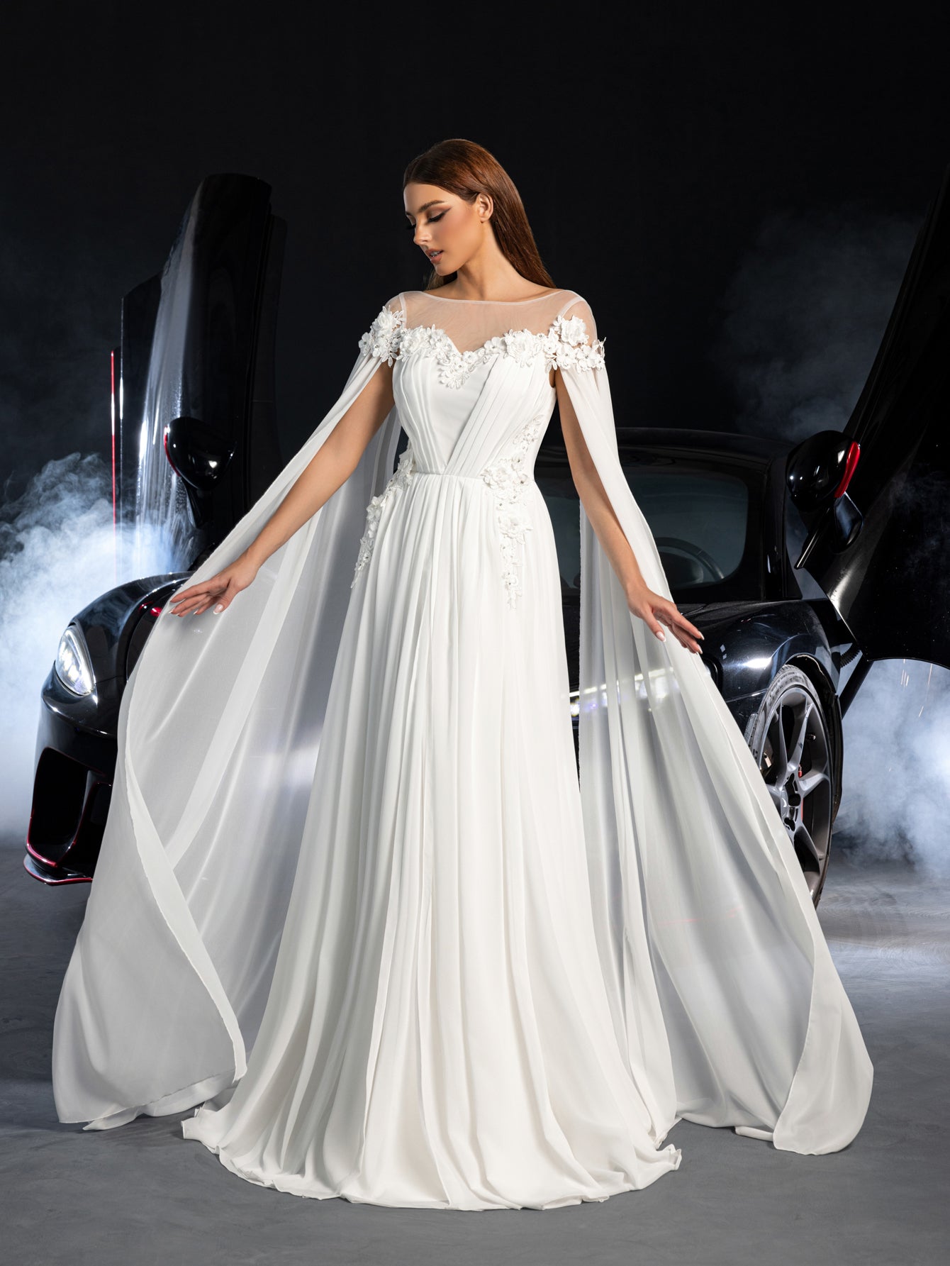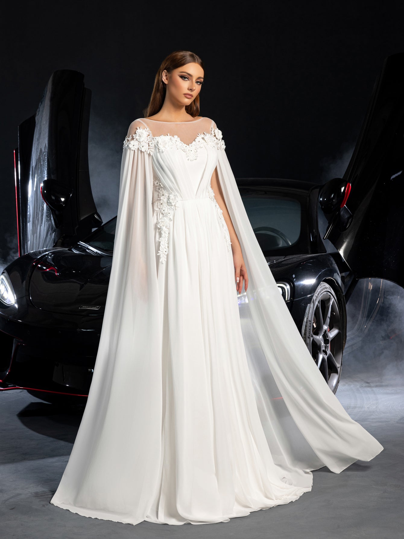 Elegant Applique Detail Boat Neck Ruched Front Cape Sleeves Chiffon Wedding Dress