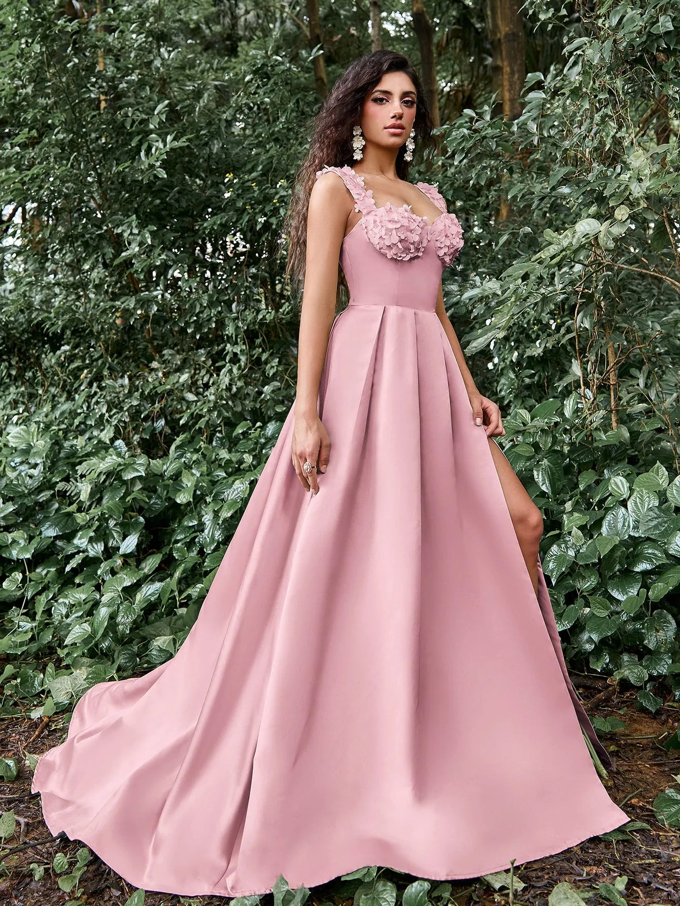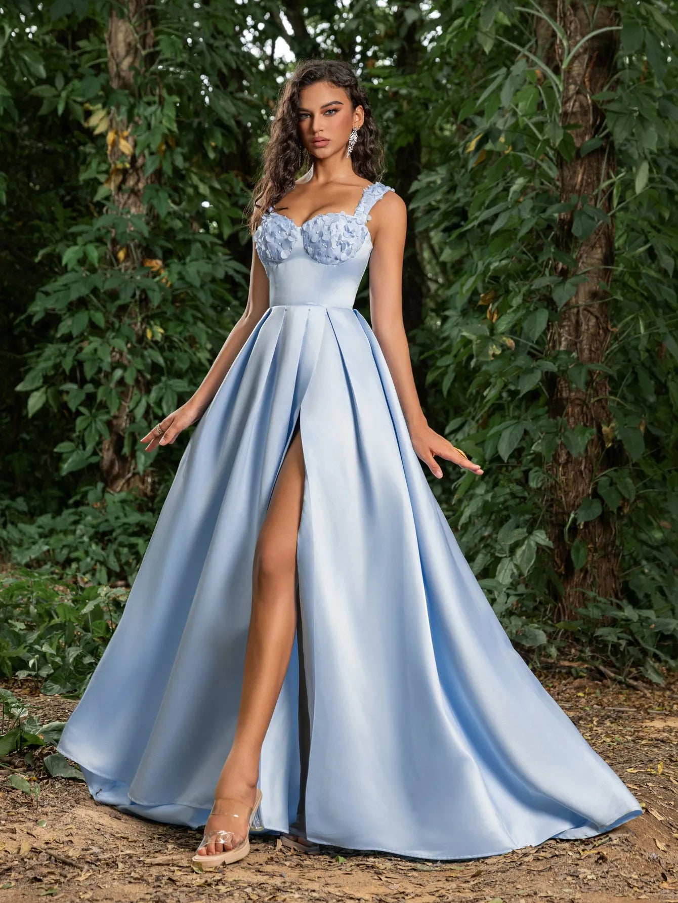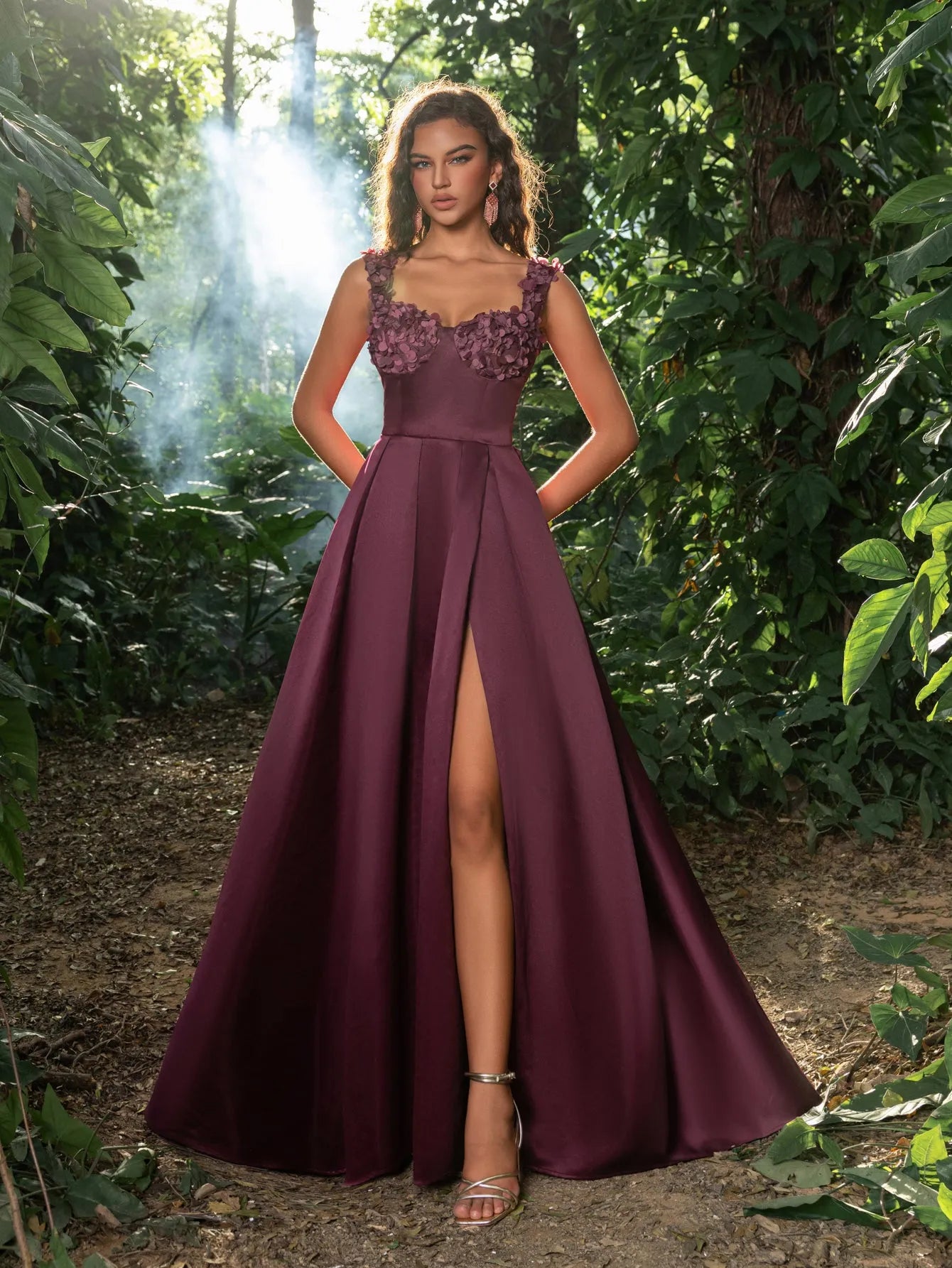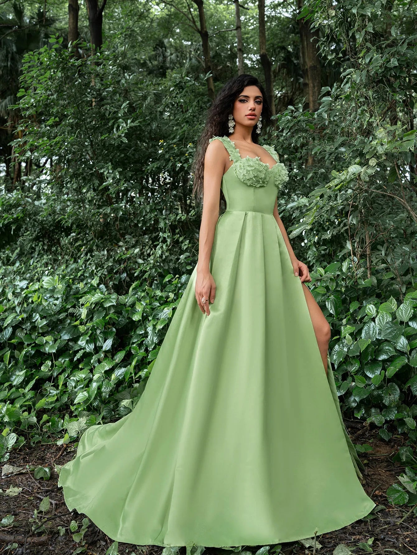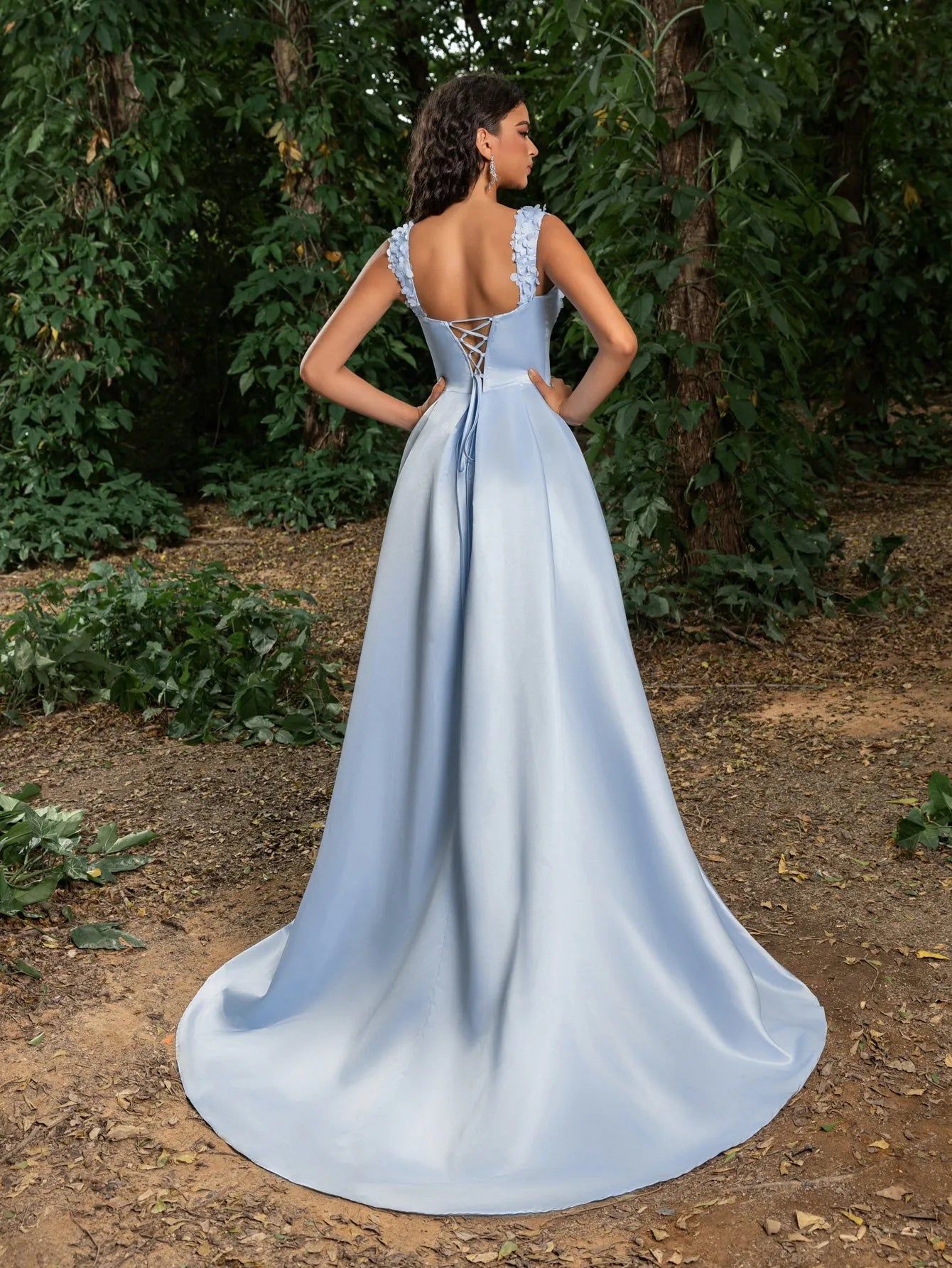 Make a stunning statement with our graceful gown, perfect for your next formal event or special occasion. This gown features a square neckline and intricate floral embellishments along the bust, giving it a romantic yet modern edge. The fitted bodice includes a lace-up corset back, ensuring both comfort and a custom fit, while the sweeping skirt flows into a captivating high slit for a touch of allure.