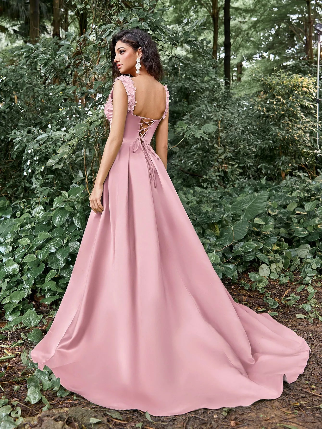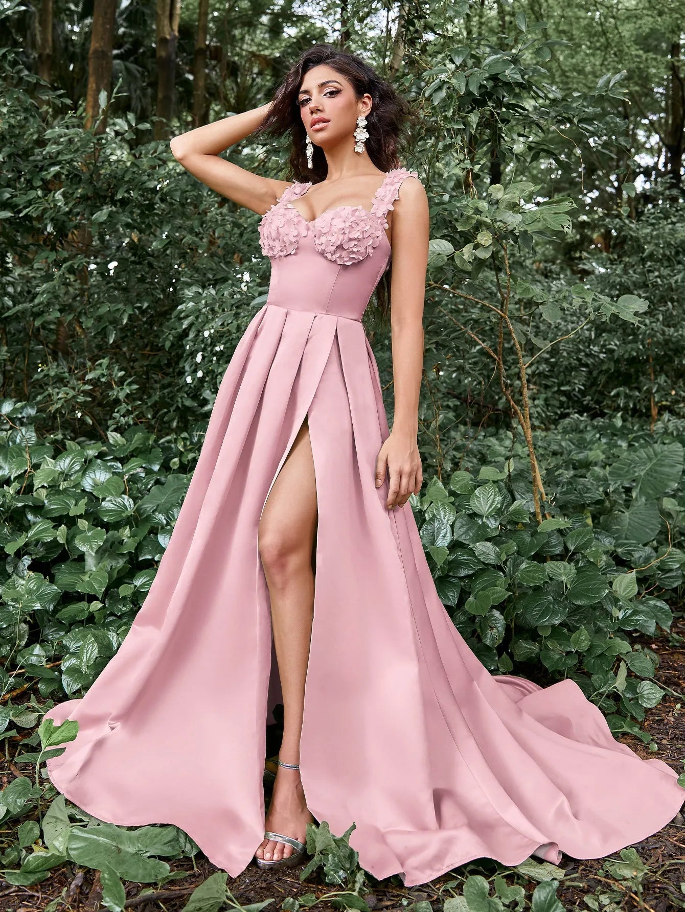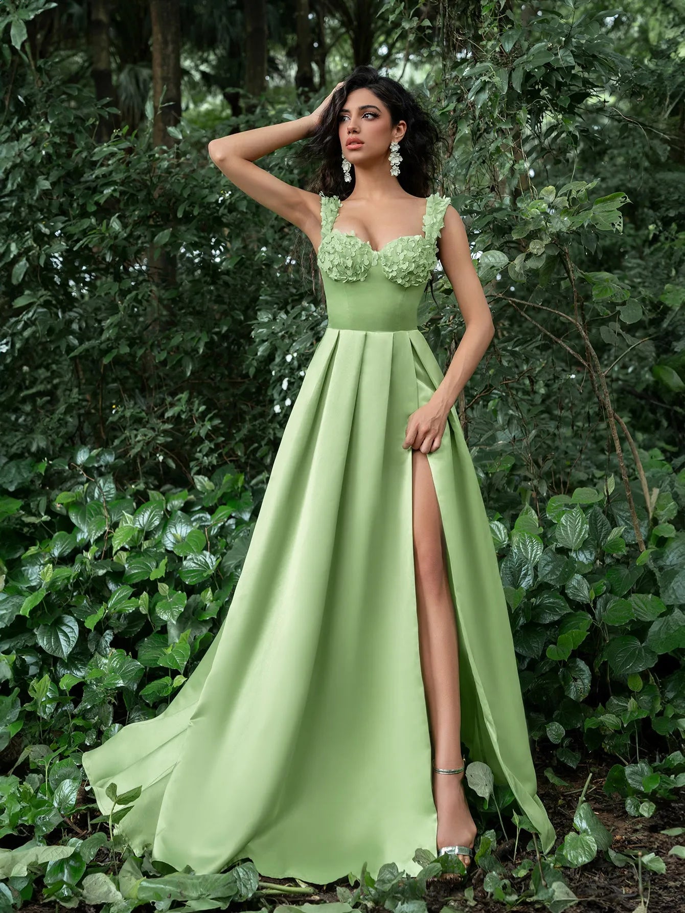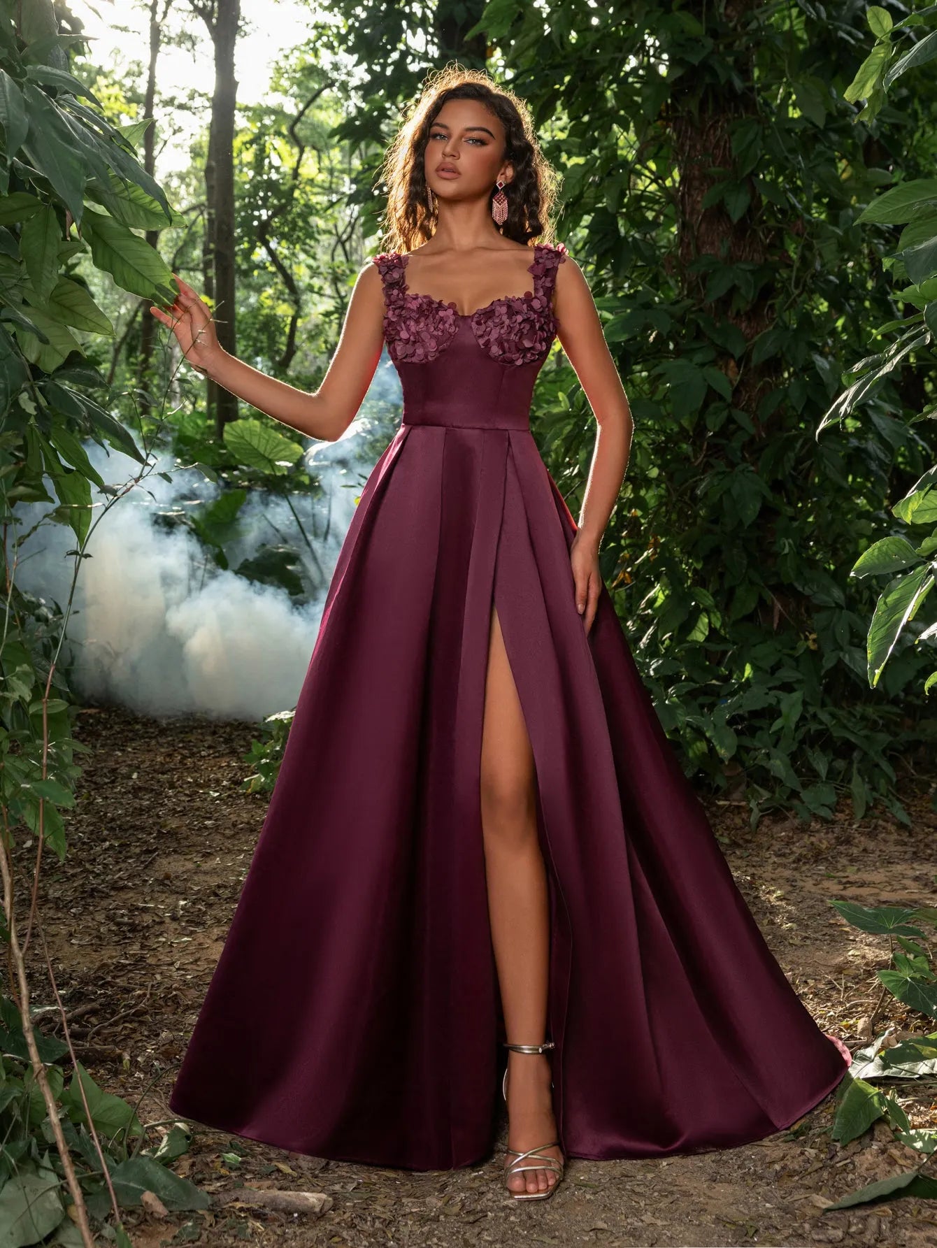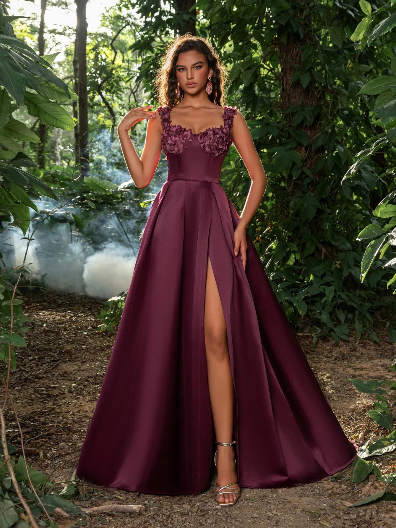 Make a stunning statement with our graceful gown, perfect for your next formal event or special occasion. This gown features a square neckline and intricate floral embellishments along the bust, giving it a romantic yet modern edge. The fitted bodice includes a lace-up corset back, ensuring both comfort and a custom fit, while the sweeping skirt flows into a captivating high slit for a touch of allure.