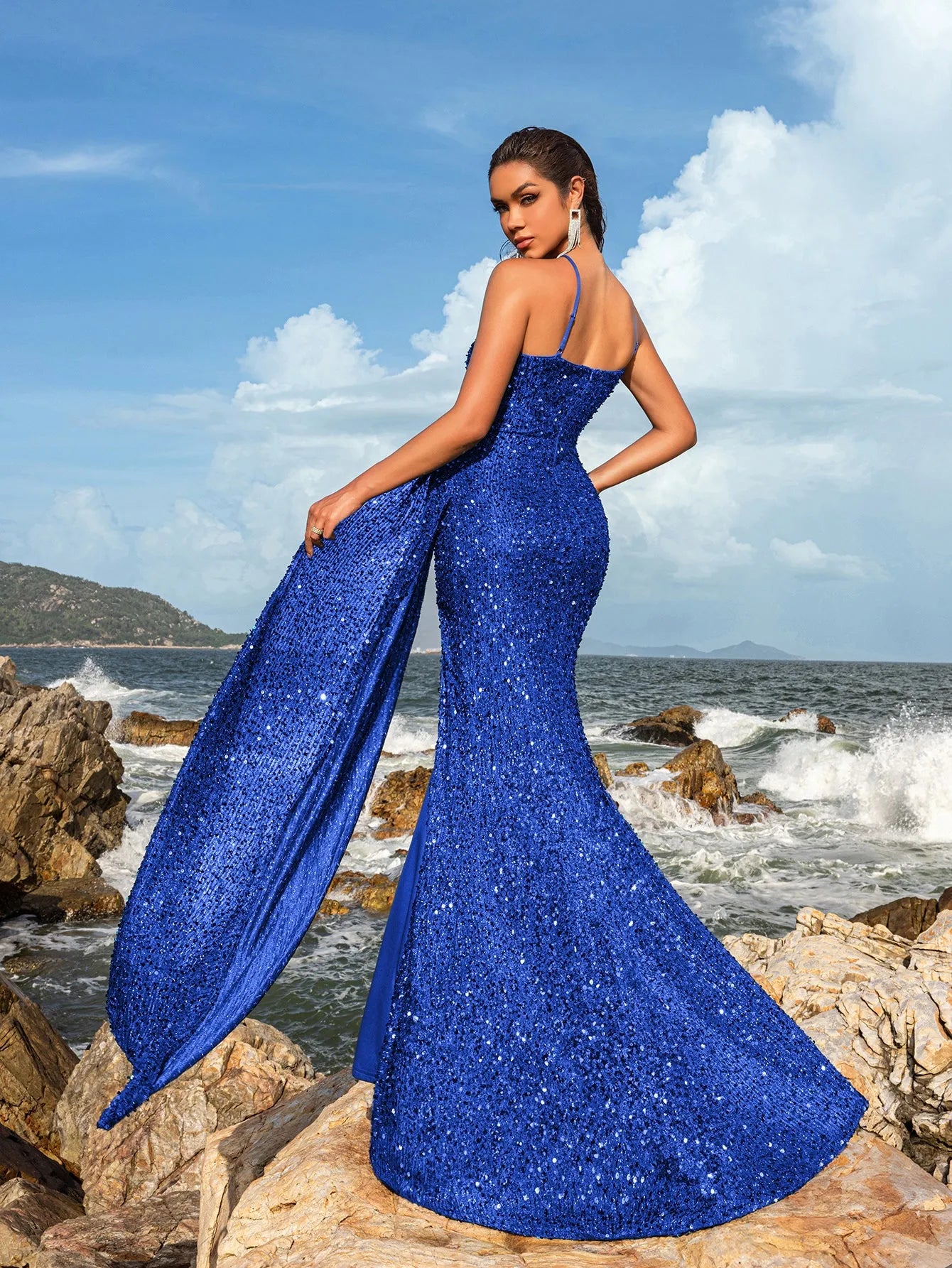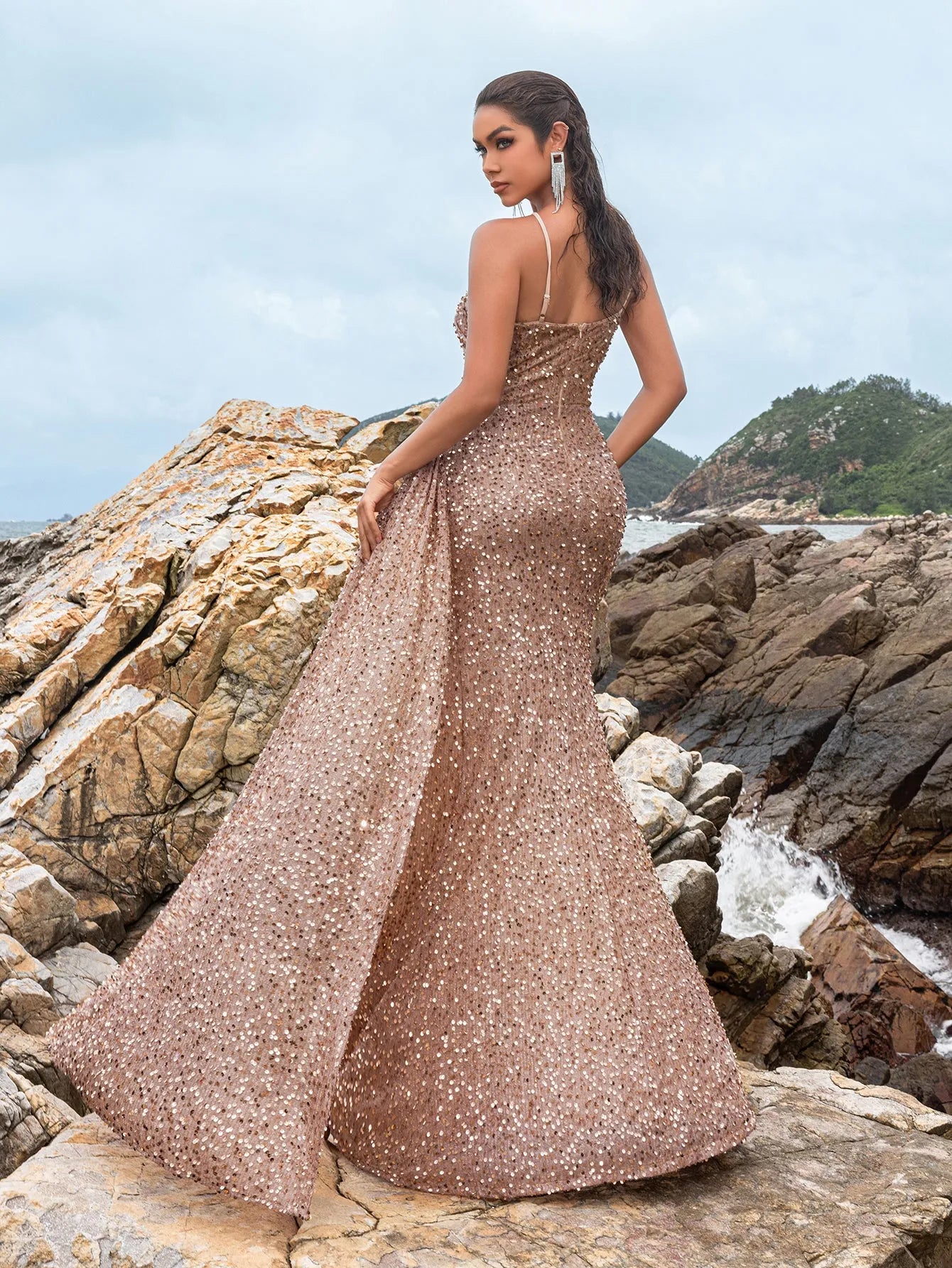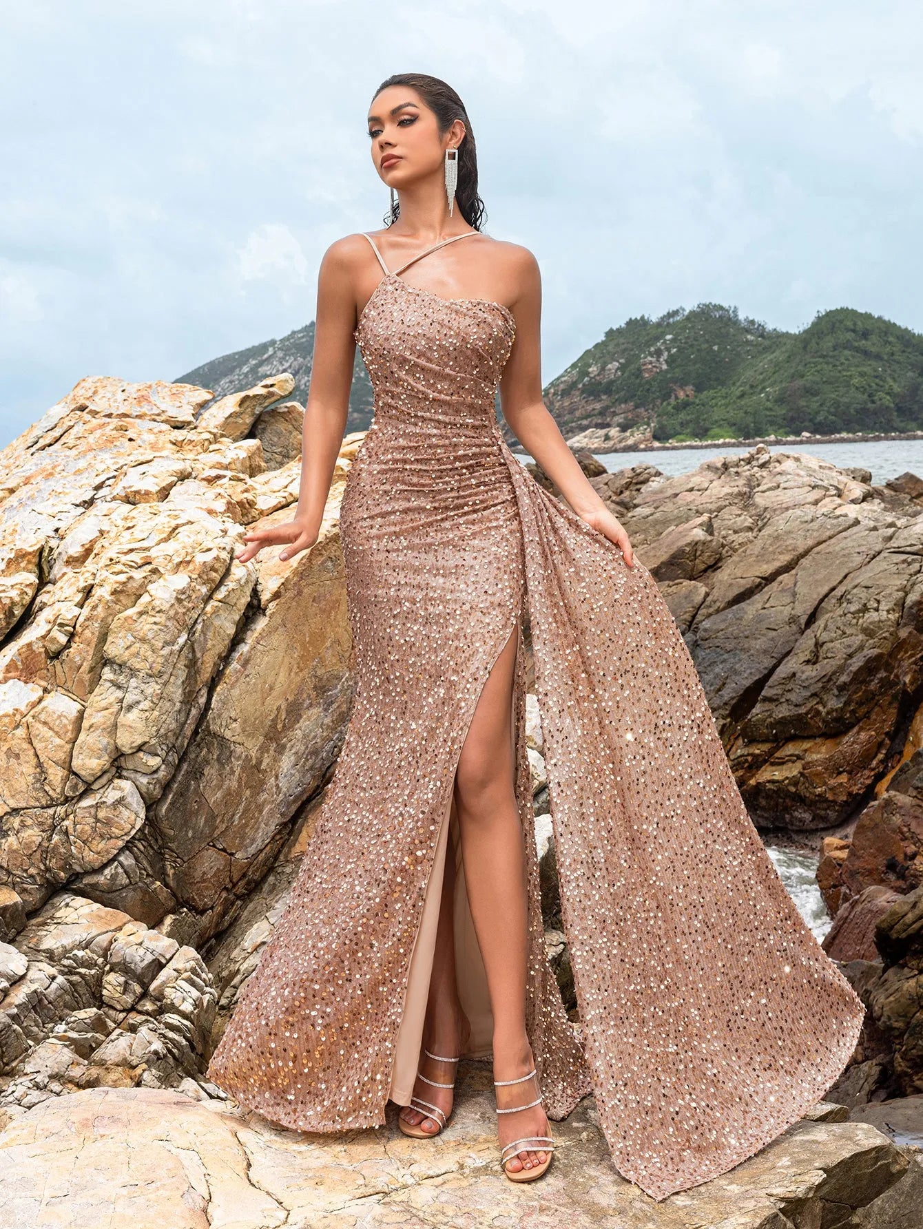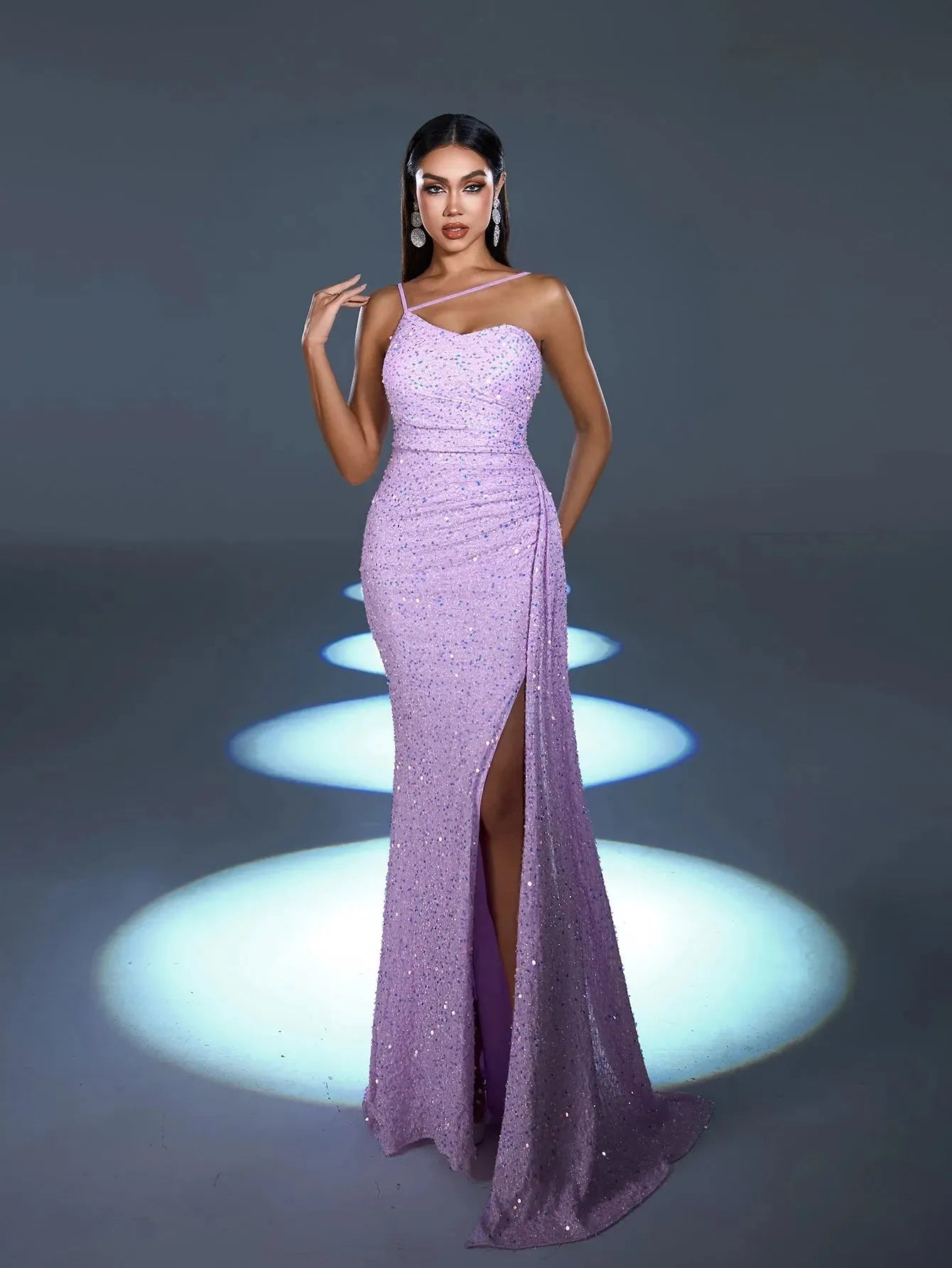 Shine bright in our exquisite sequin gown, designed for those who love to dazzle. This stunning dress features a fitted silhouette adorned with shimmering sequins that catch the light with every move. The spaghetti straps and sweetheart neckline create a delicate and feminine look, while the high slit adds a touch of allure. The gown's elegant drape and floor-length design ensure you make a lasting impression.
