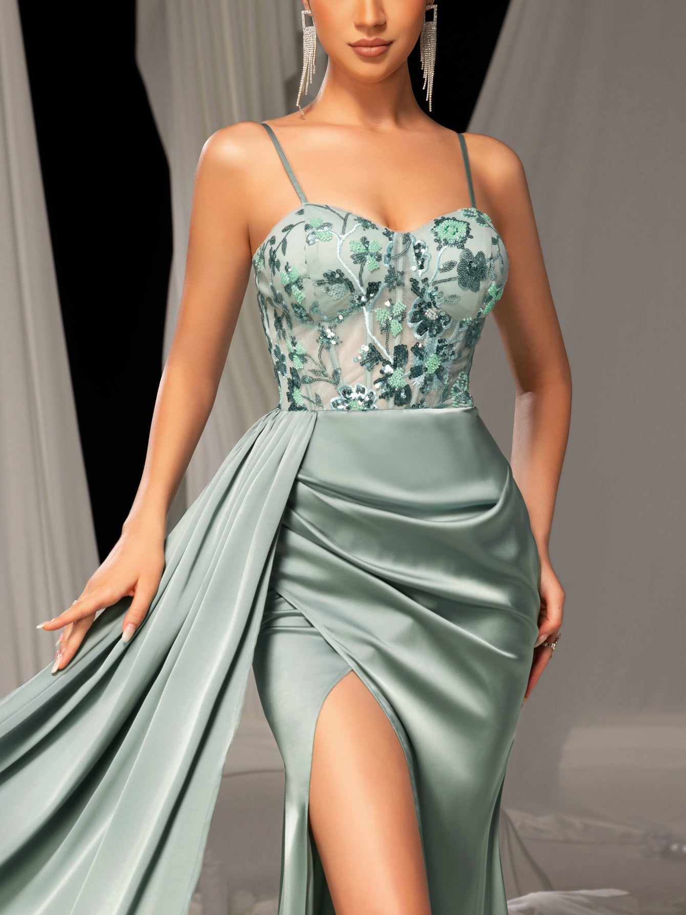 Elegant Cami Evening Gown with Sweetheart Neckline & Floral Sequin Embroidery – High Slit Mermaid Silhouette for Luxury Weddings or Garden Parties, XS-XL