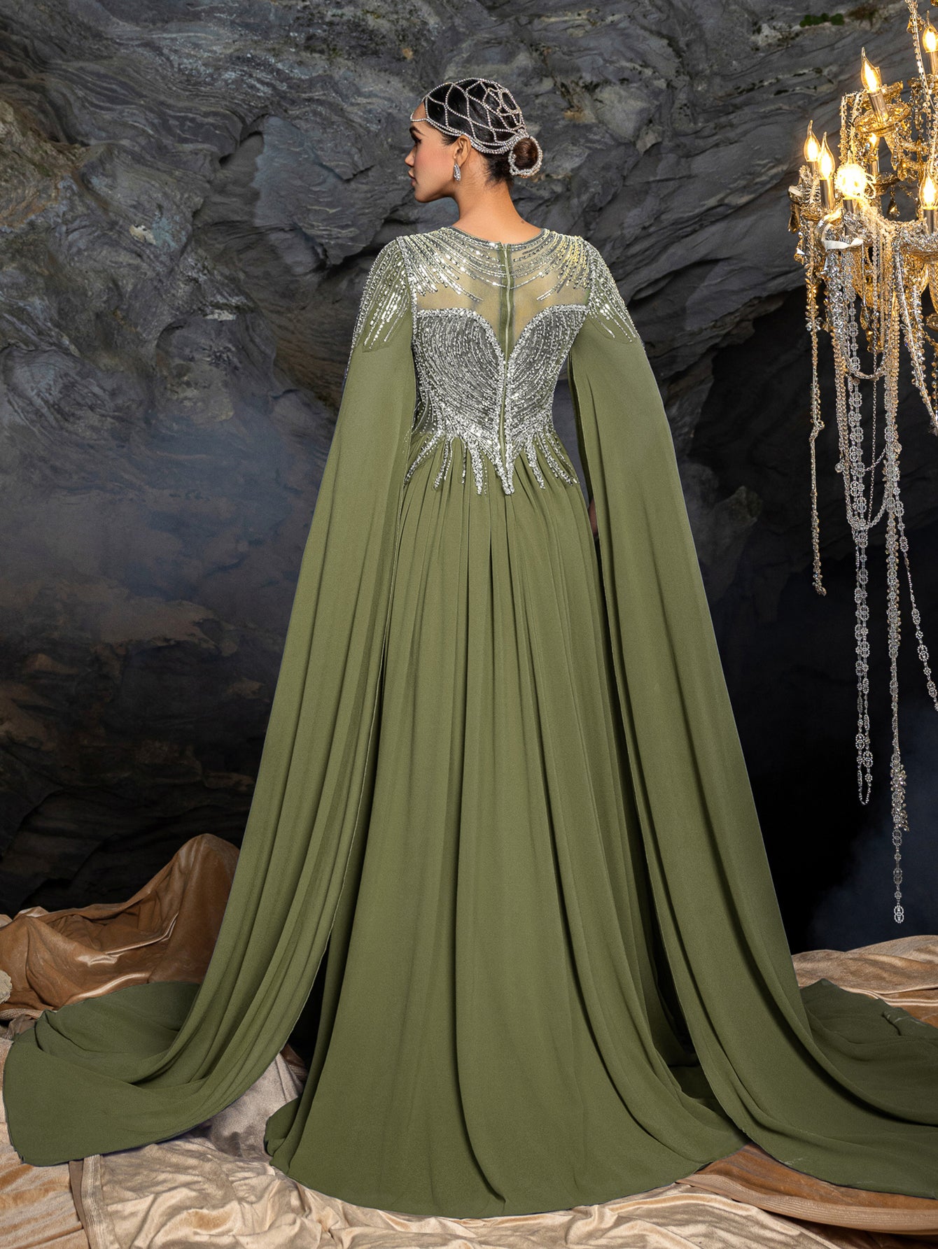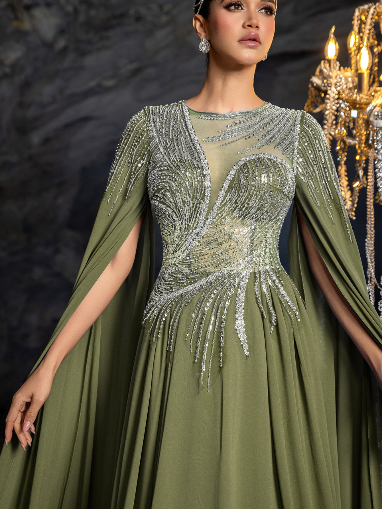 The long, chiffon sleeves drape effortlessly from the shoulders, enhancing the gown’s fluid silhouette, while the back showcases delicate embroidery radiating outward for a captivating focal point. The skirt flows seamlessly into the train, creating graceful movement and visual intrigue as you walk. Made from soft, lightweight chiffon fabric, it ensures all-night comfort without compromising on luxury.