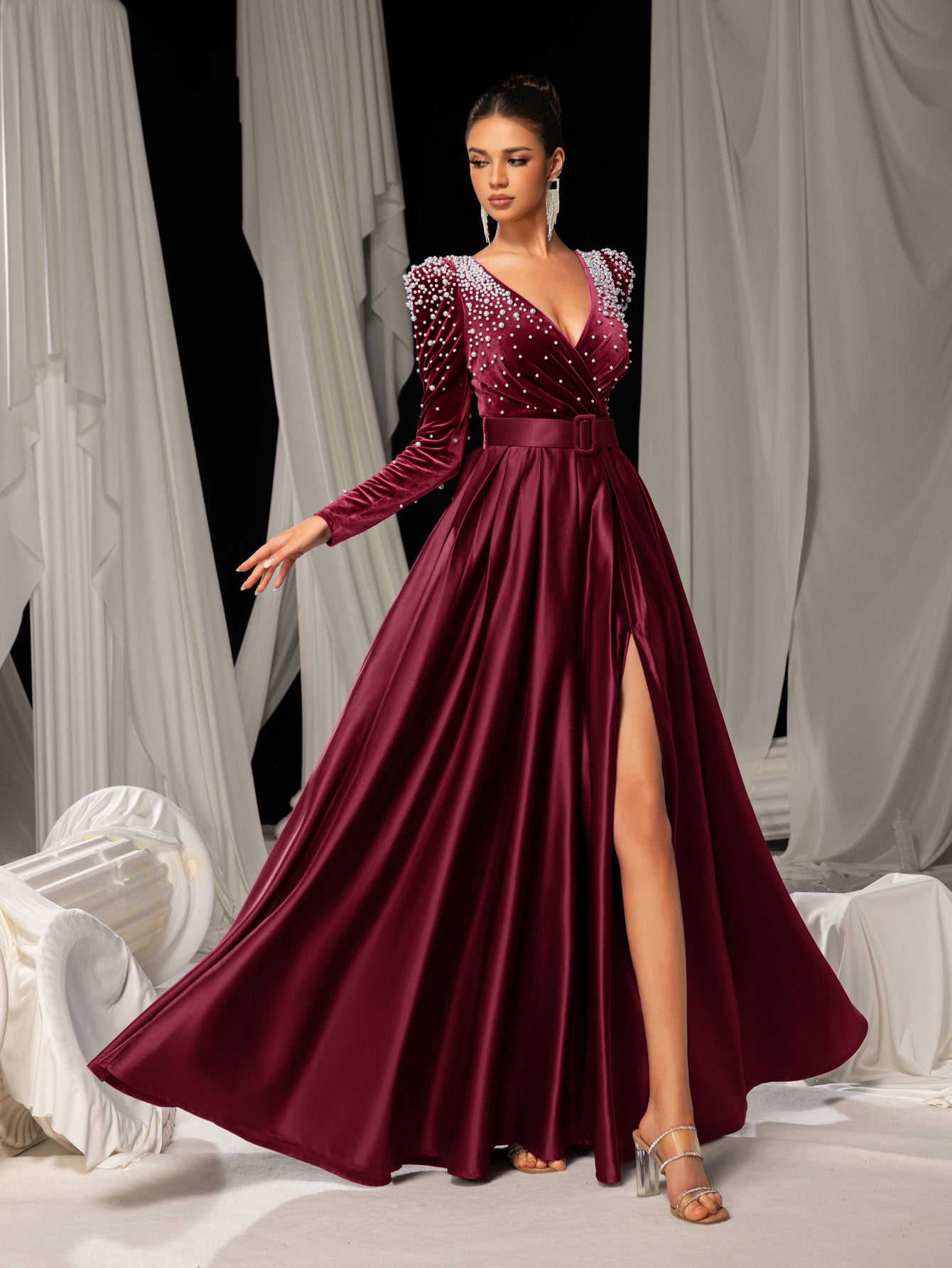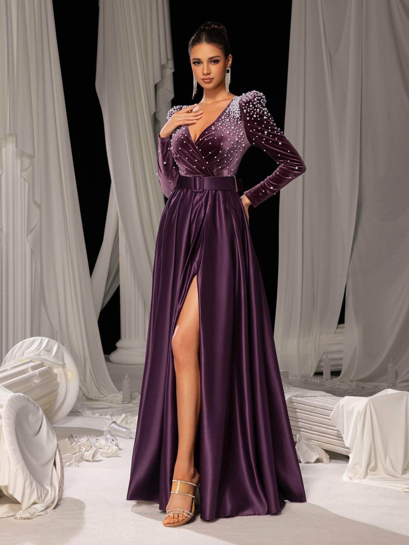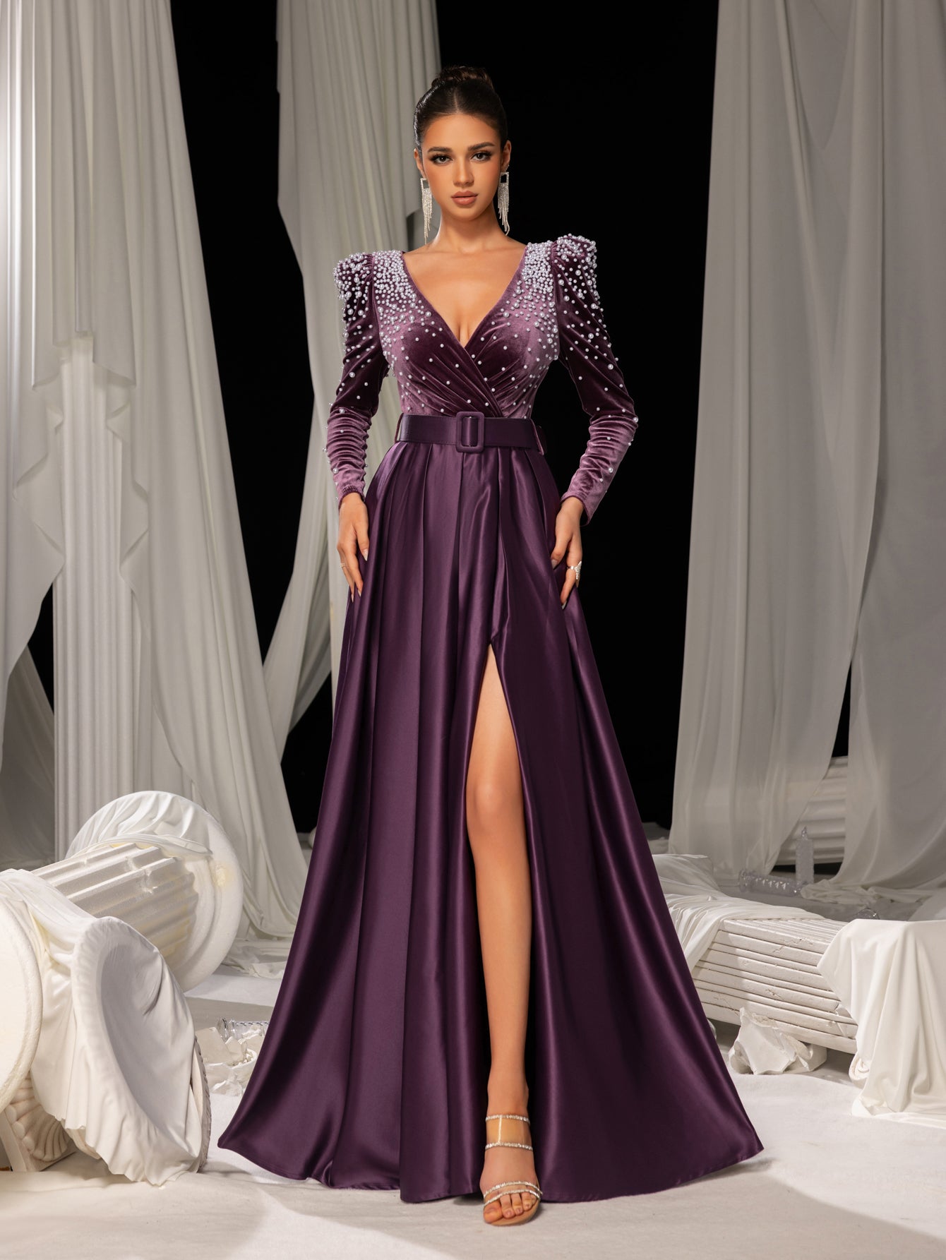 ✨ Timeless Elegance with Bold Details: This evening gown features a deep V-neckline adorned with pearls embellishments, paired with long sleeves and a dramatic side slit for a balance of sophistication and allure. The flowing satin fabric cascades gracefully, creating a silhouette that exudes confidence and luxury.