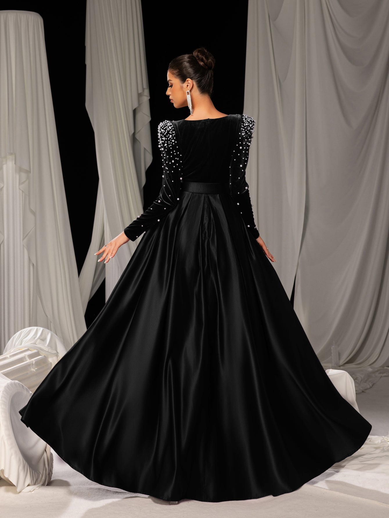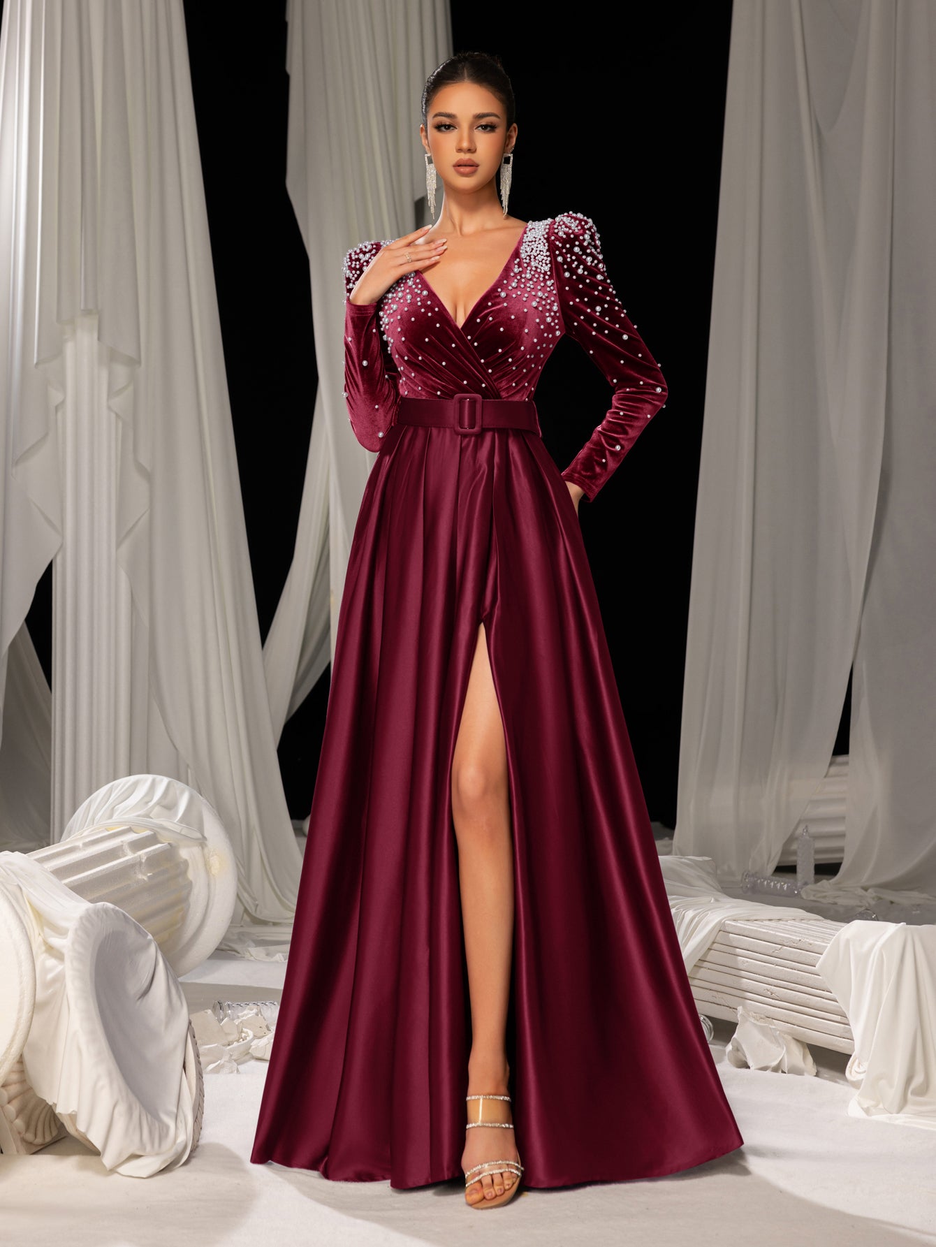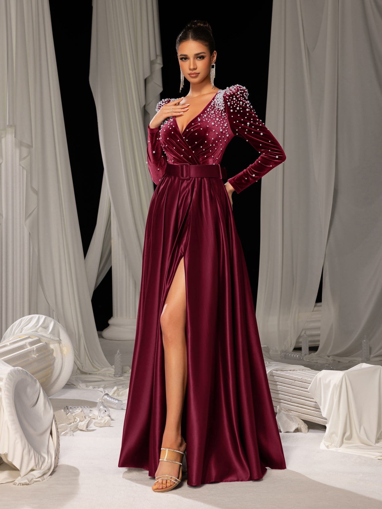 ✨ Timeless Elegance with Bold Details: This evening gown features a deep V-neckline adorned with pearls embellishments, paired with long sleeves and a dramatic side slit for a balance of sophistication and allure. The flowing satin fabric cascades gracefully, creating a silhouette that exudes confidence and luxury.