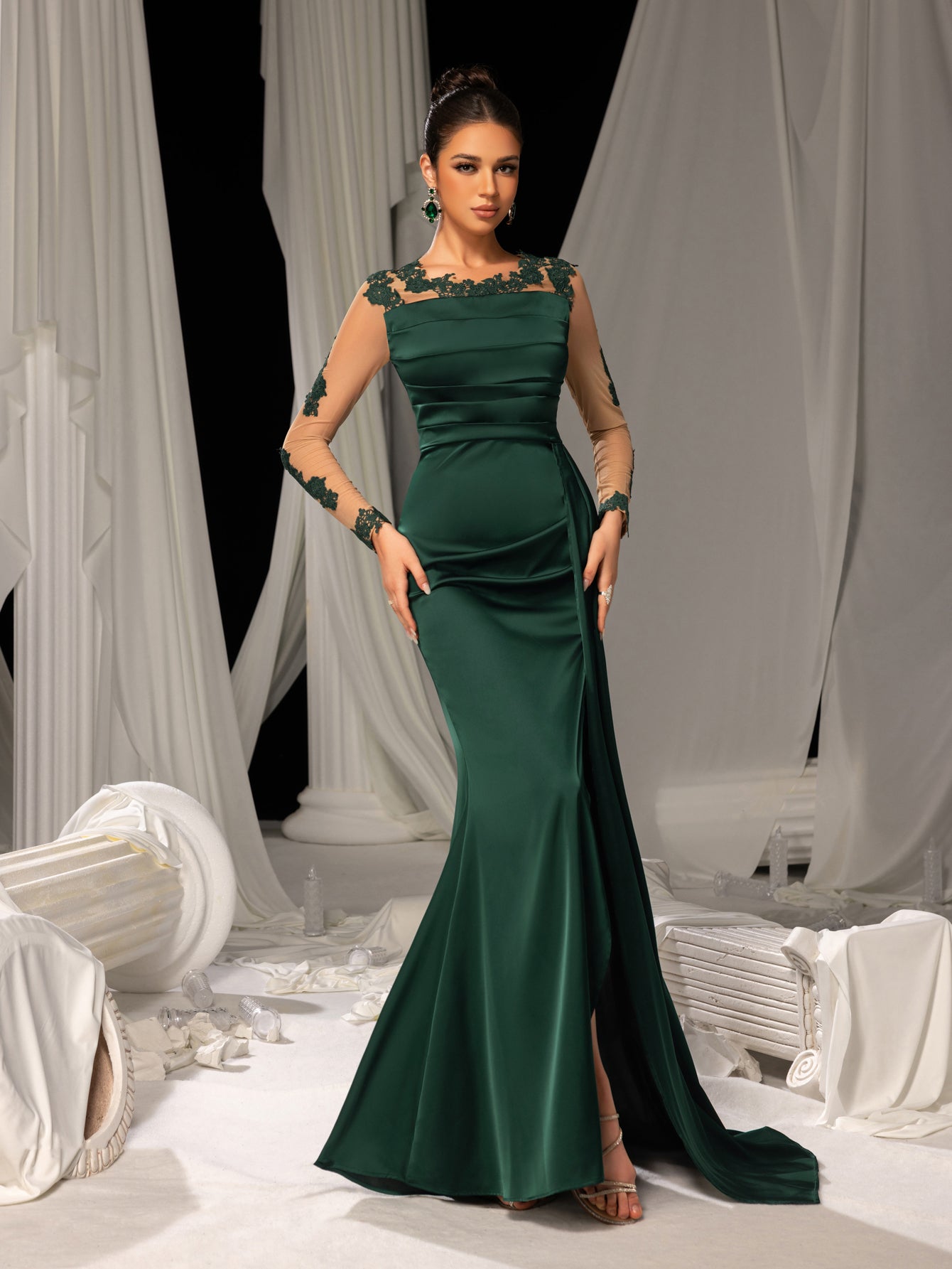 Elegant Evening Gown with Lace Accents & High Slit – Silk Satin Bodycon Dress for Luxury Evenings, XS-XL