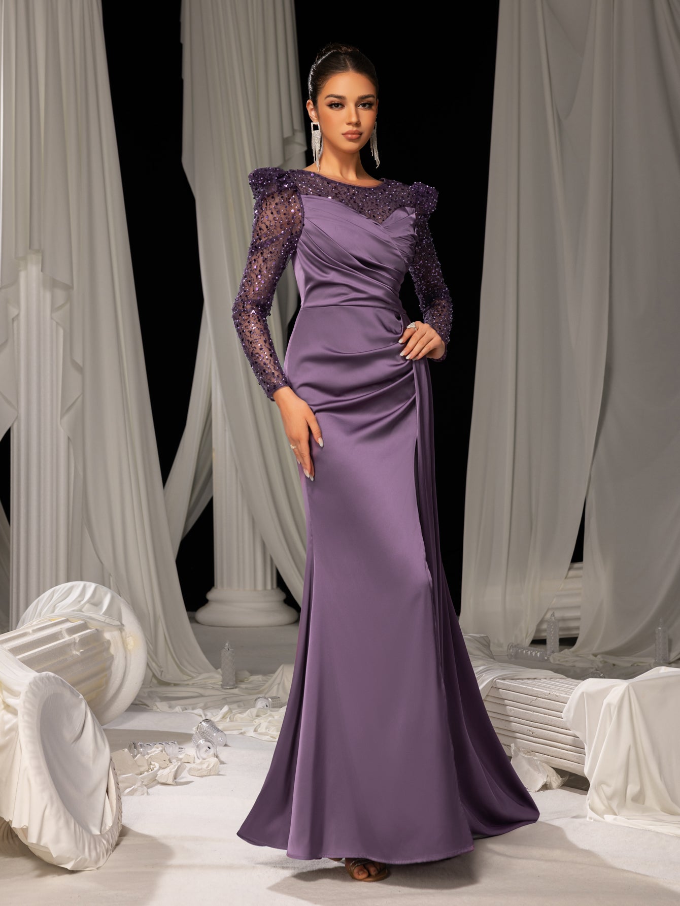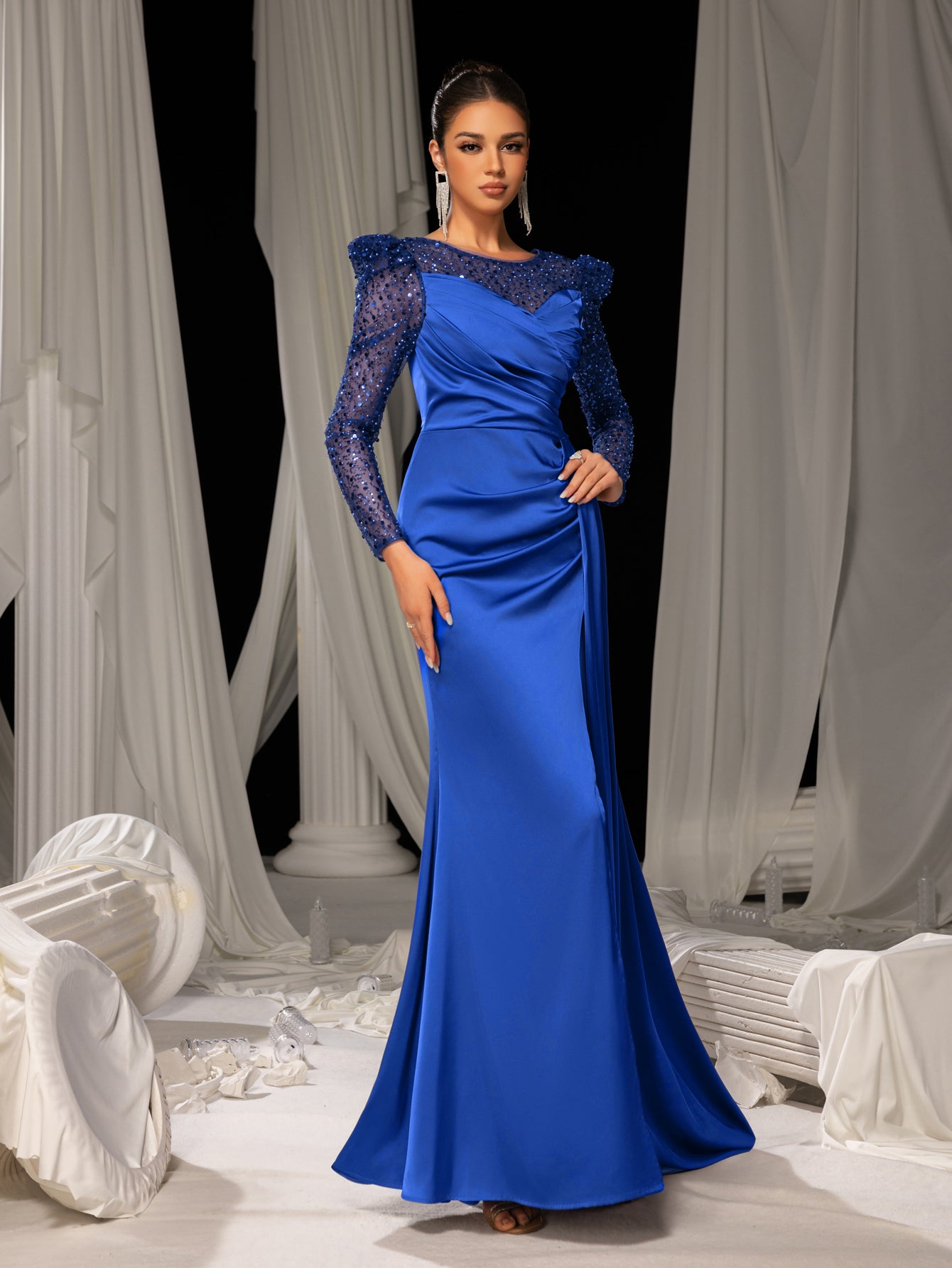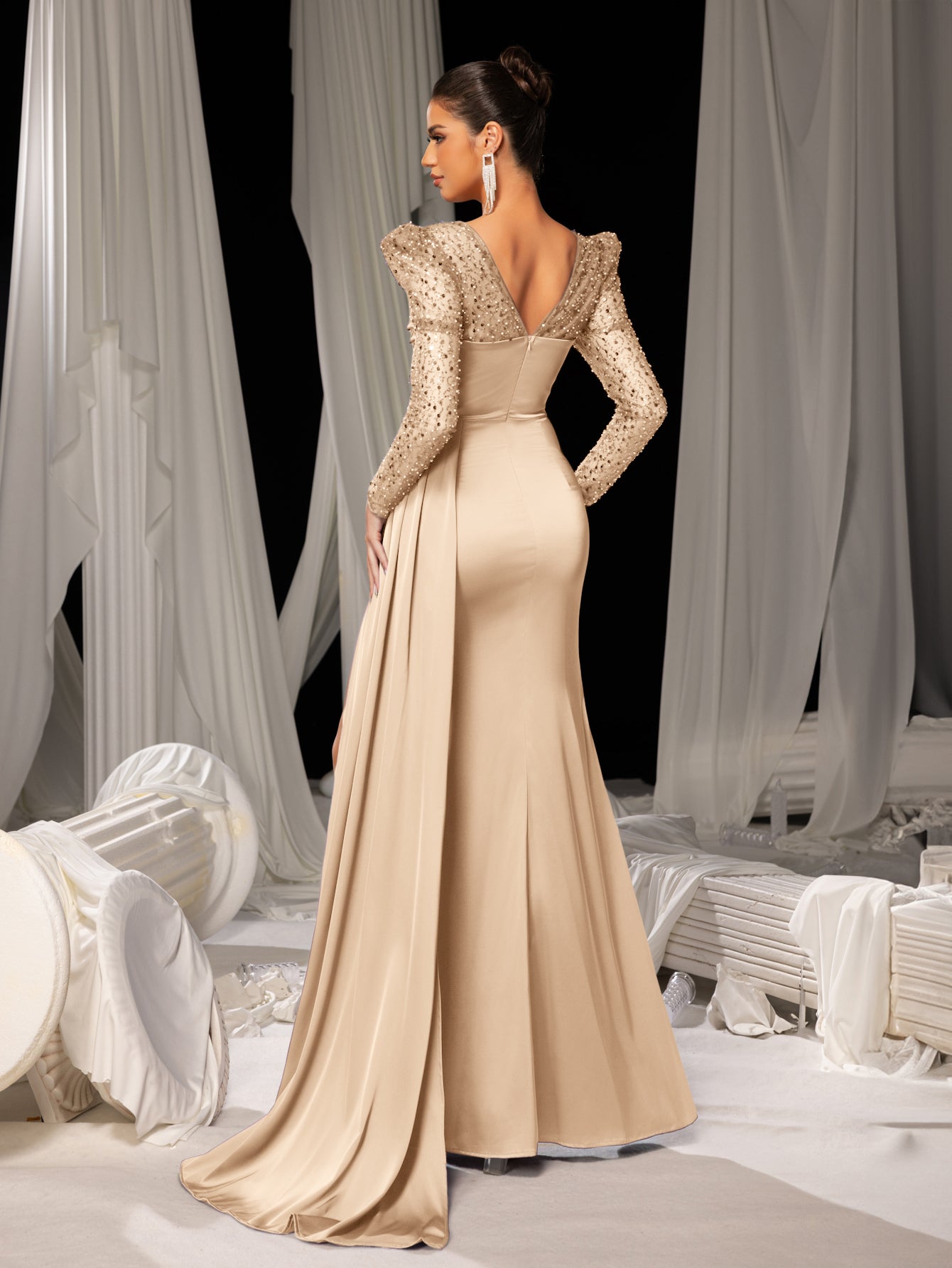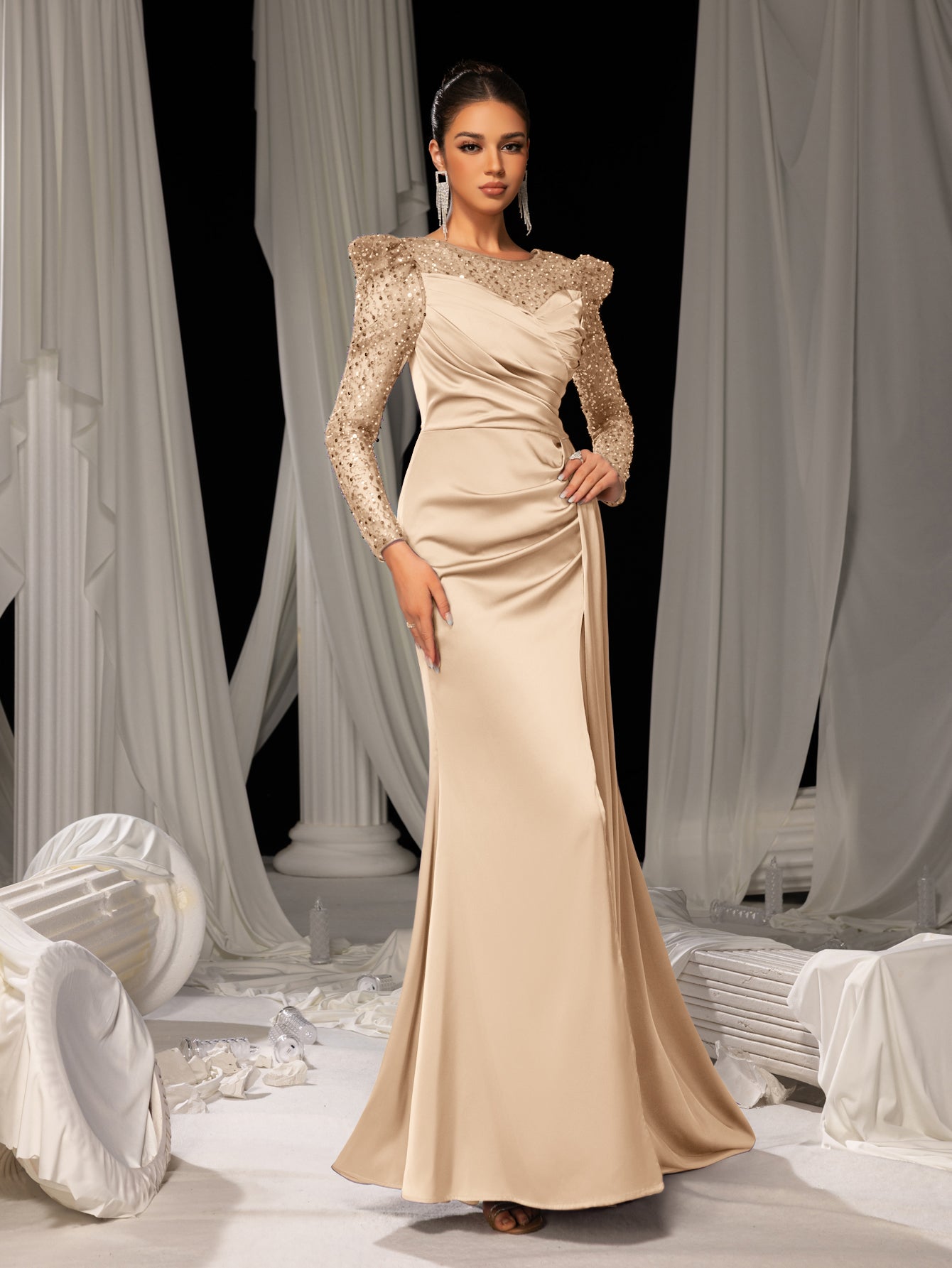 ✨ Sensual Sophistication: This evening gown combines a bold thigh-high slit with intricately sequined sleeves, blending daring allure with timeless elegance. The flowing mermaid silhouette skims the body, while the pristine white drapes in the background amplify its ethereal charm.