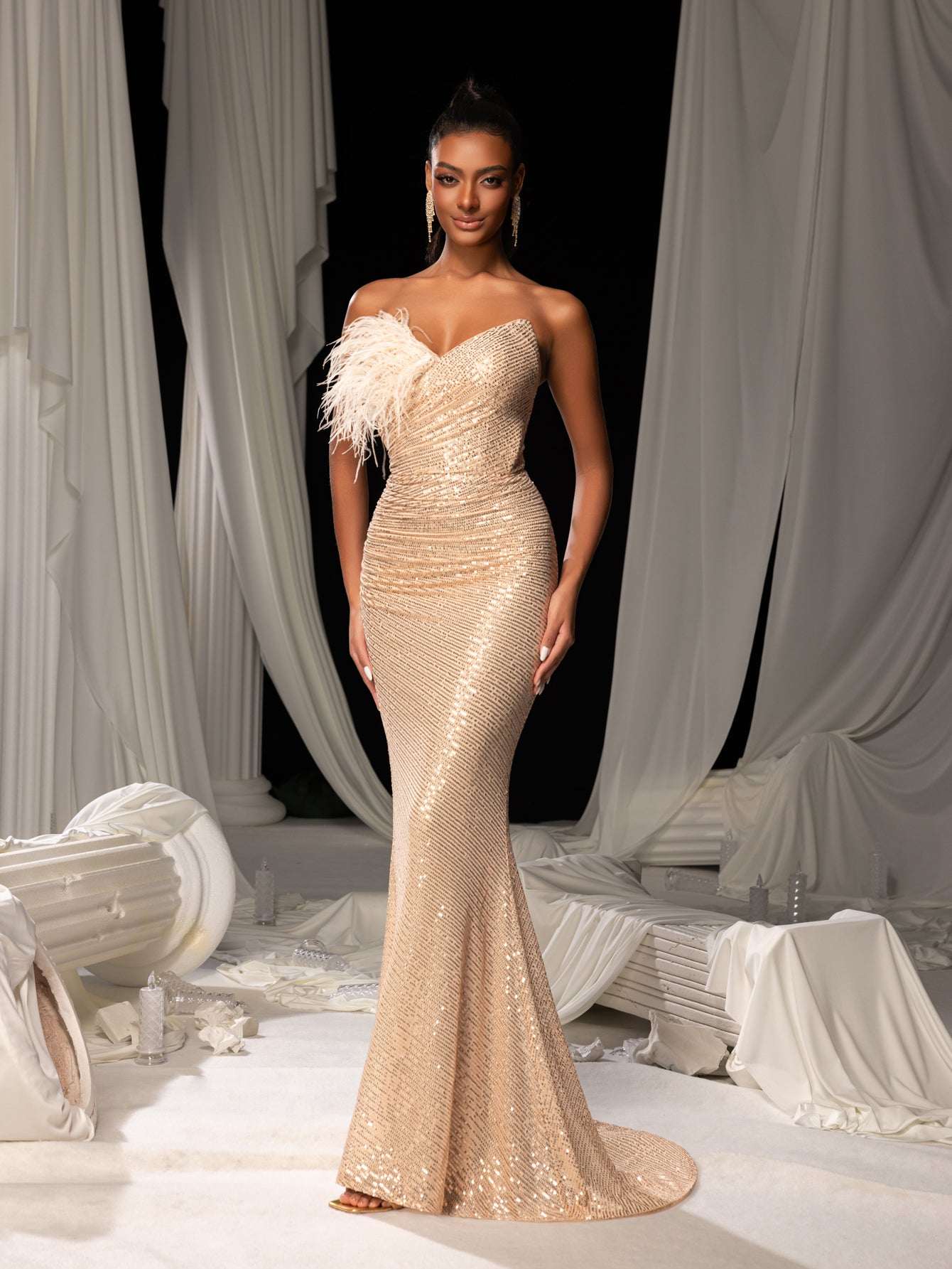 • Timeless Elegance: This strapless gown combines a sweetheart neckline with a form-fitting bodice, accentuating curves while exuding sophisticated glamour. The dramatic feather accent on the hip adds a touch of whimsical elegance, while the mermaid silhouette creates a feminine and dramatic profile perfect for formal occasions.