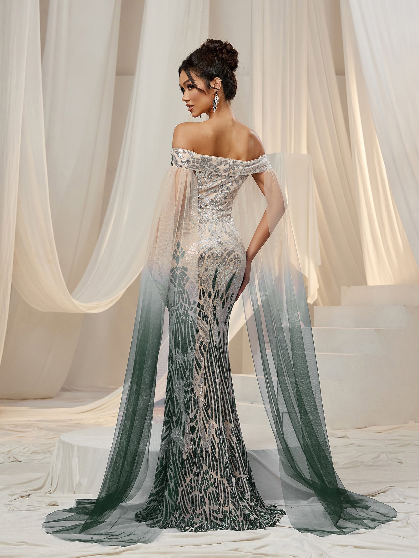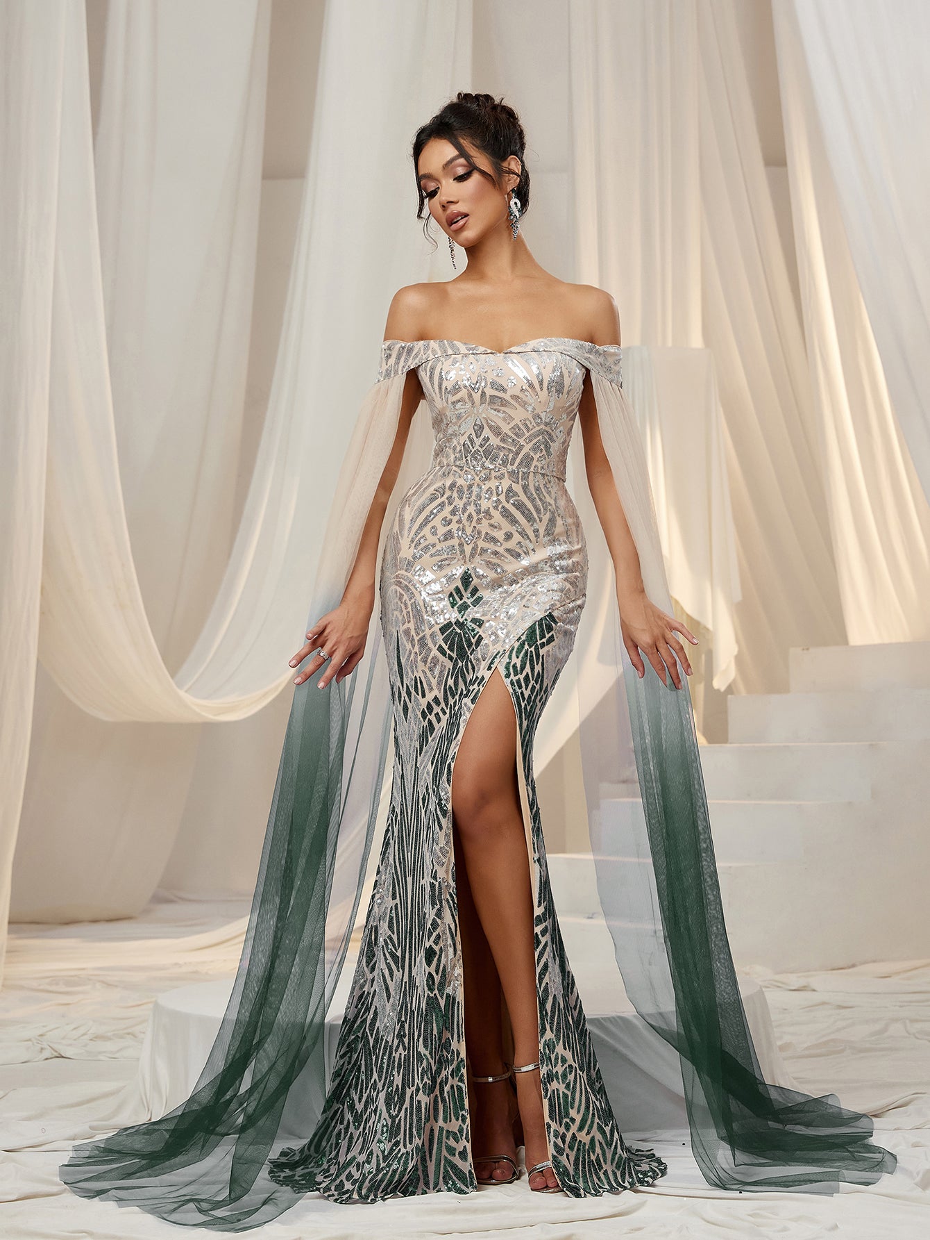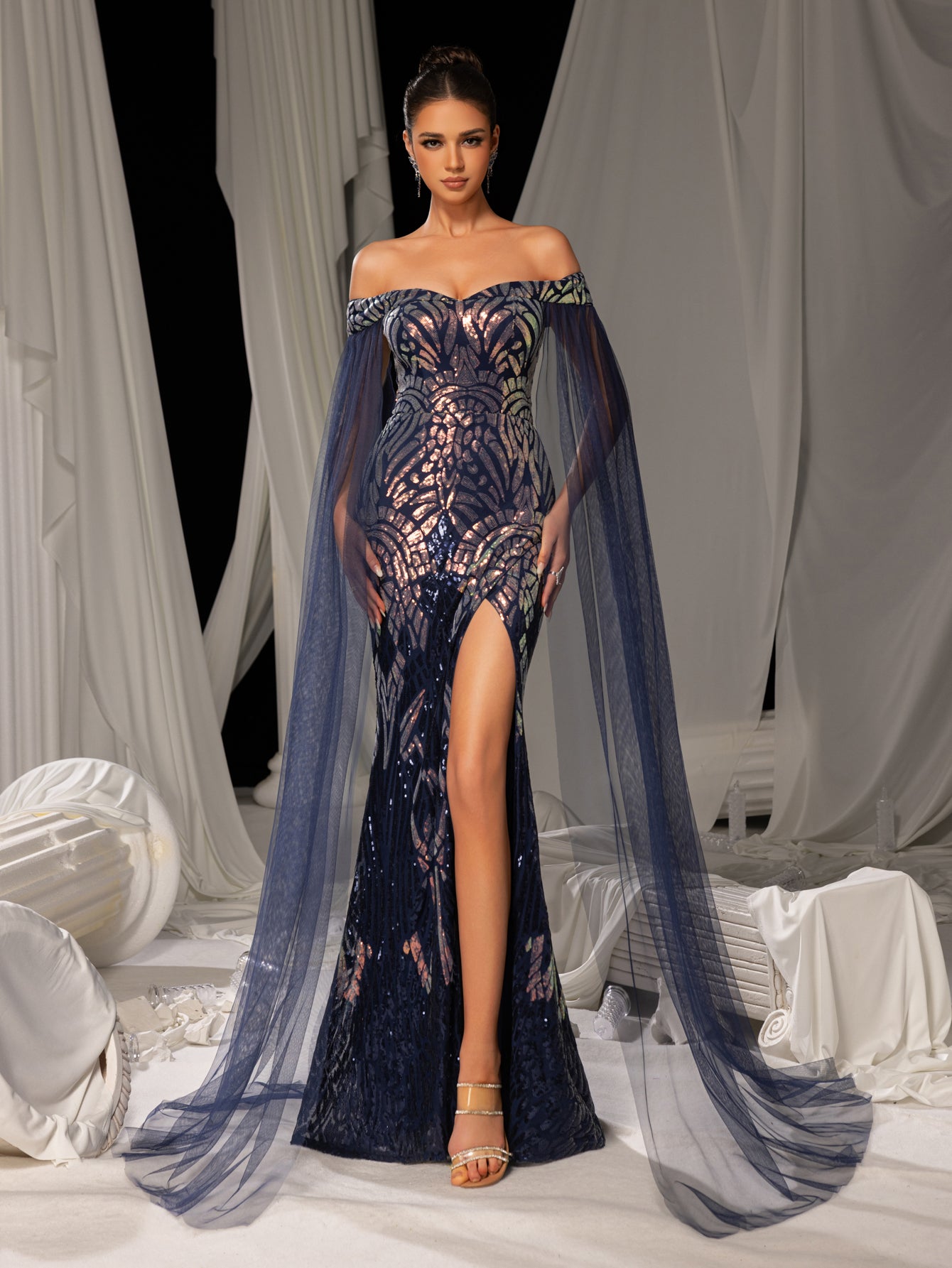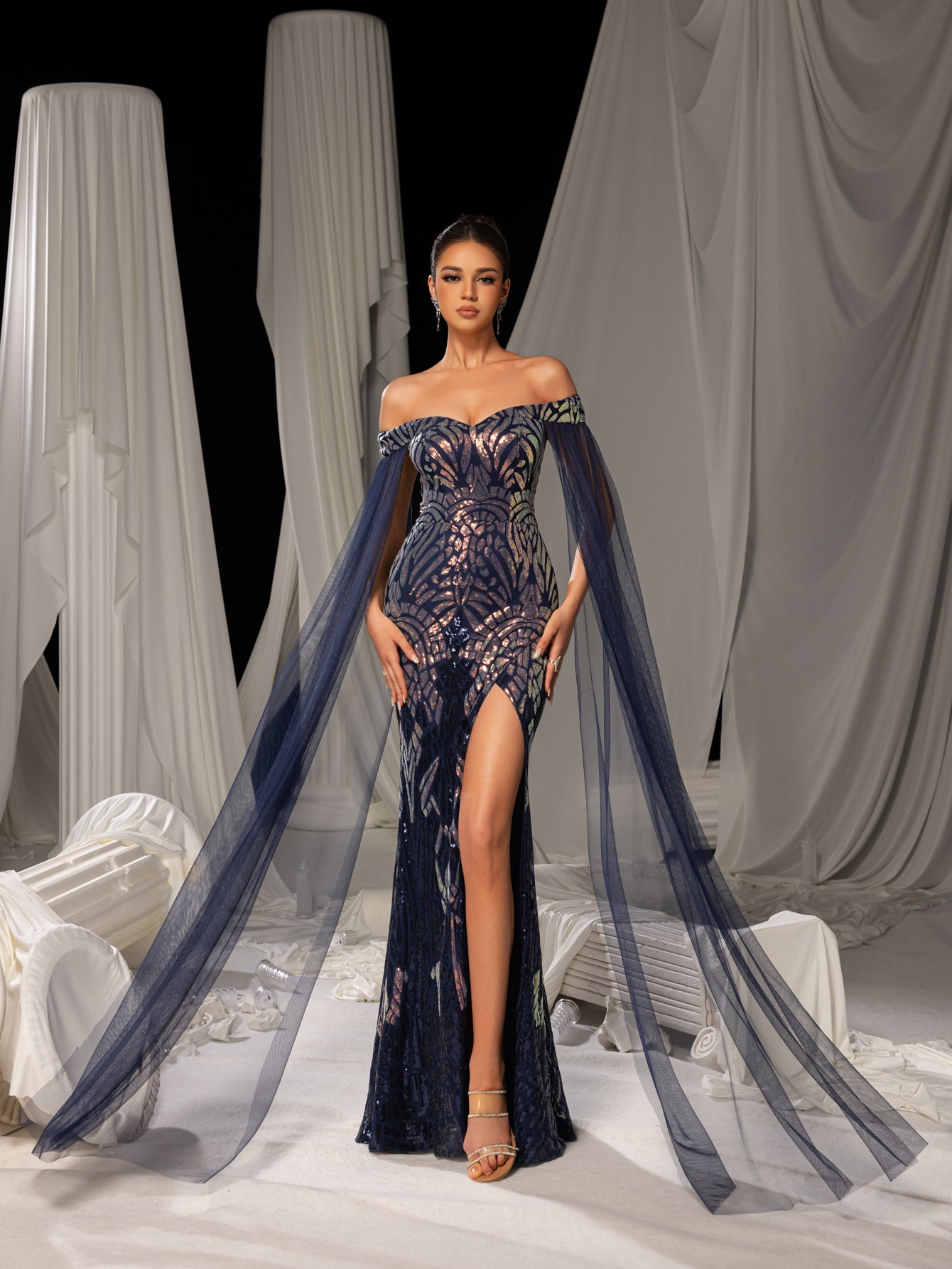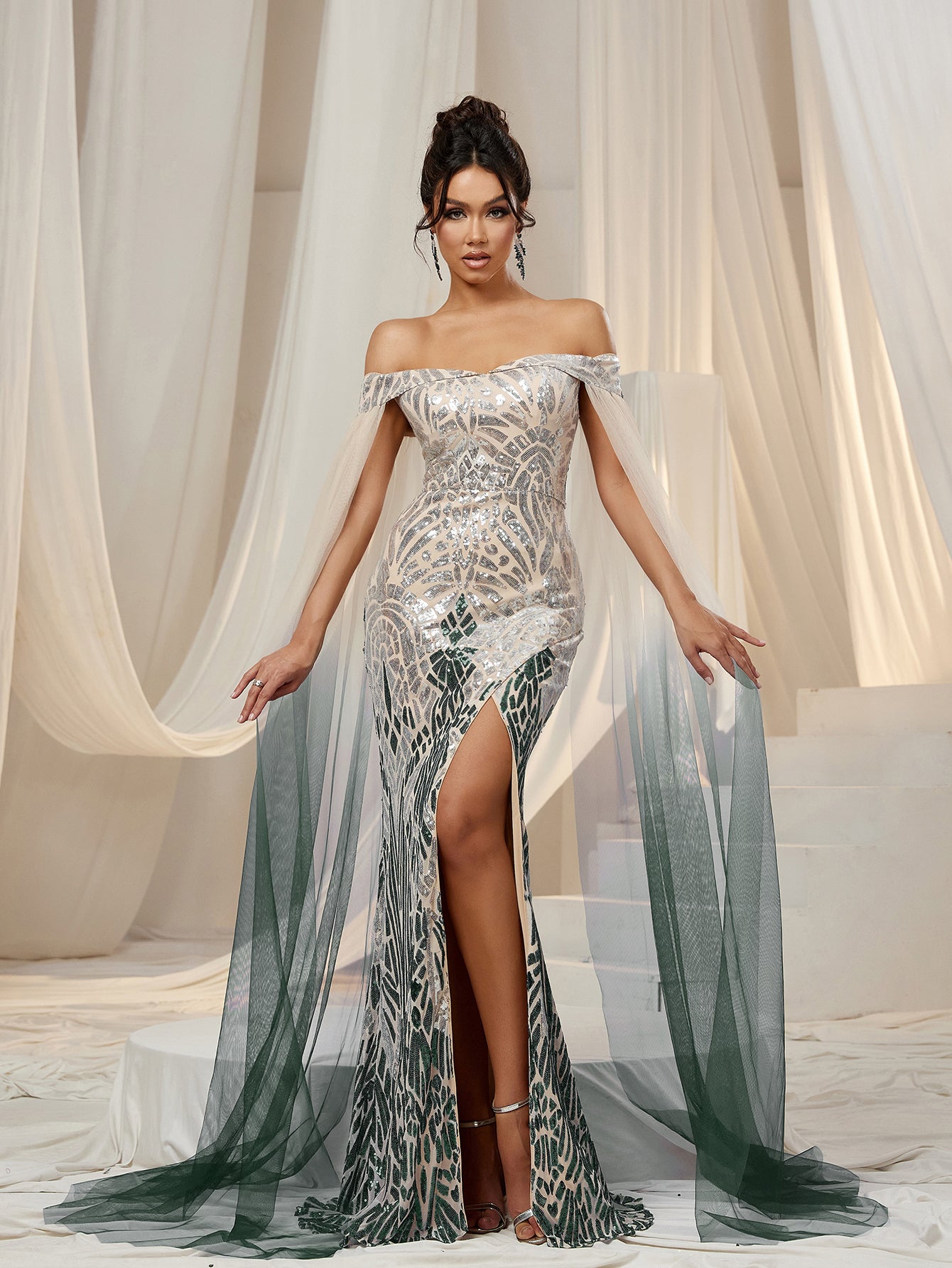 Crafted for timeless elegance, this sequined evening gown blends translucent tulle sleeves with intricate floral sequin along a dramatic high slit, creating a bold yet sophisticated statement. The mermaid silhouette accentuates curves gracefully, every shimmering detail evoking luxury and allure.