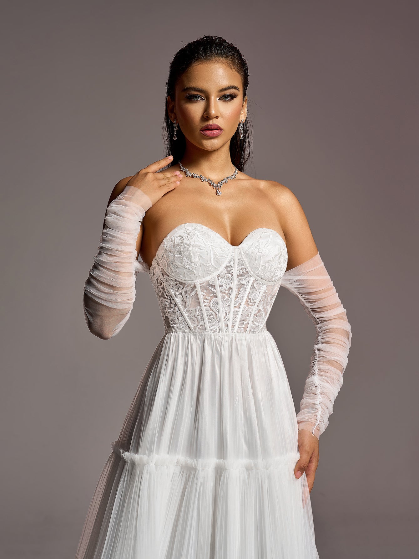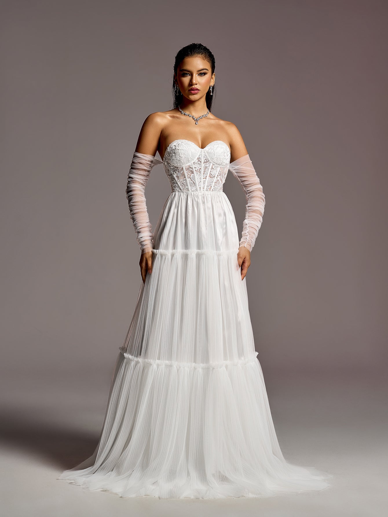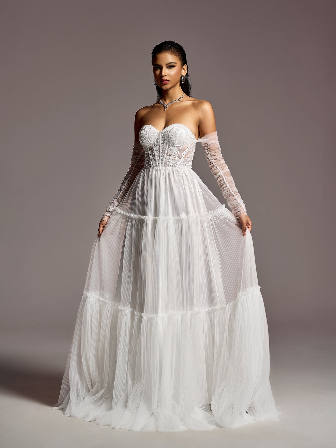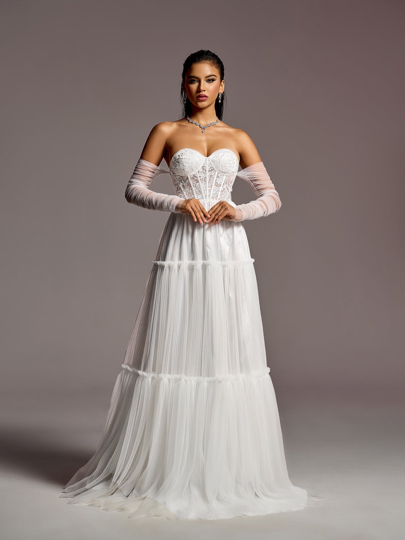 Ethereal Elegance: Our stunning bridal gown is crafted to make you feel like a vision of pure grace. The gown boasts a strapless sweetheart neckline that accentuates your décolletage, complemented by a fitted bodice that seamlessly transitions into a flowing, layered tulle skirt. The long, sheer sleeves add a touch of sophistication, while the full-length hemline creates a dramatic, floor-sweeping effect.