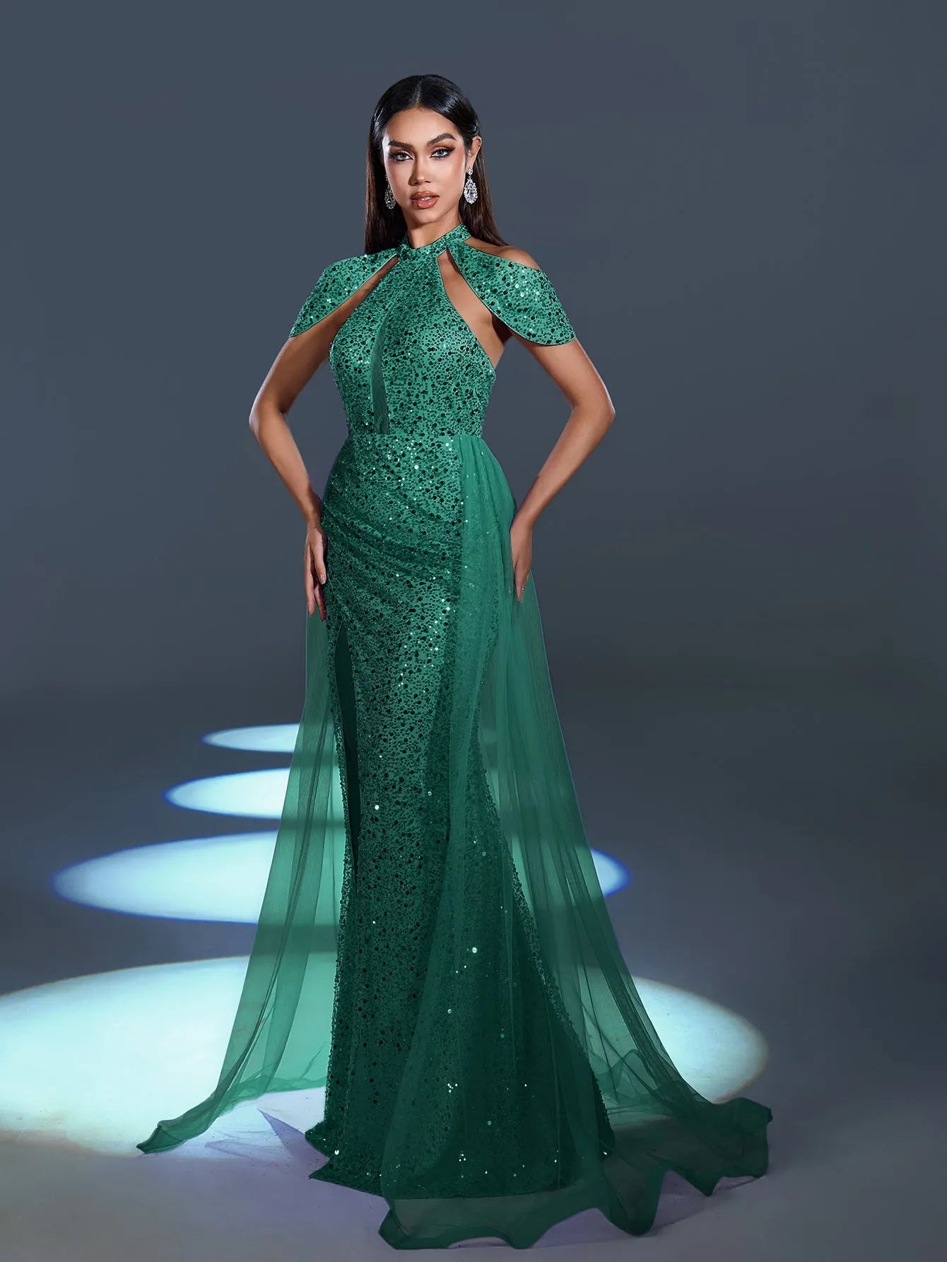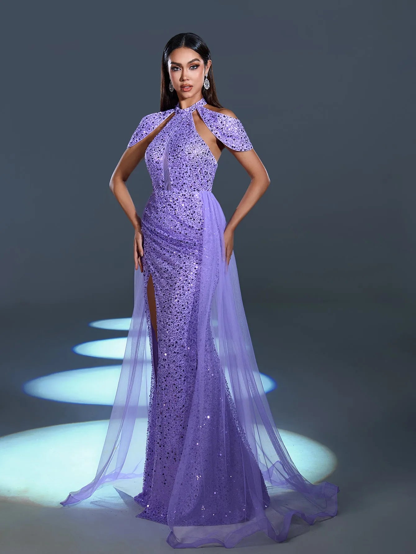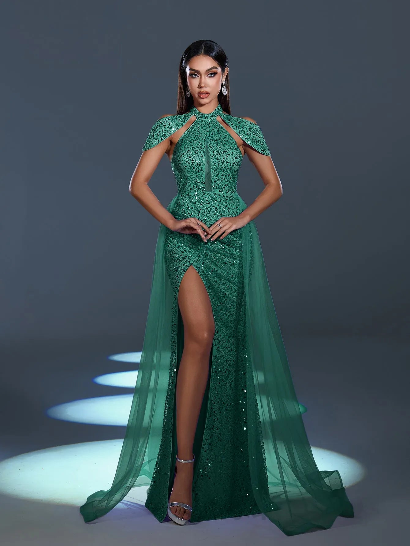 Radiate elegance and charm with our enchanting sequin gown, designed to turn heads at any event. This exquisite dress features a high-neck cutout design with a chic cape-style shoulder accent for a dramatic yet graceful look. The sparkling sequins catch the light beautifully, while the sheer flowing tulle overlay adds a soft, ethereal touch. A thigh-high slit adds a sultry edge to this glamorous gown, perfect for showcasing your sophisticated style.