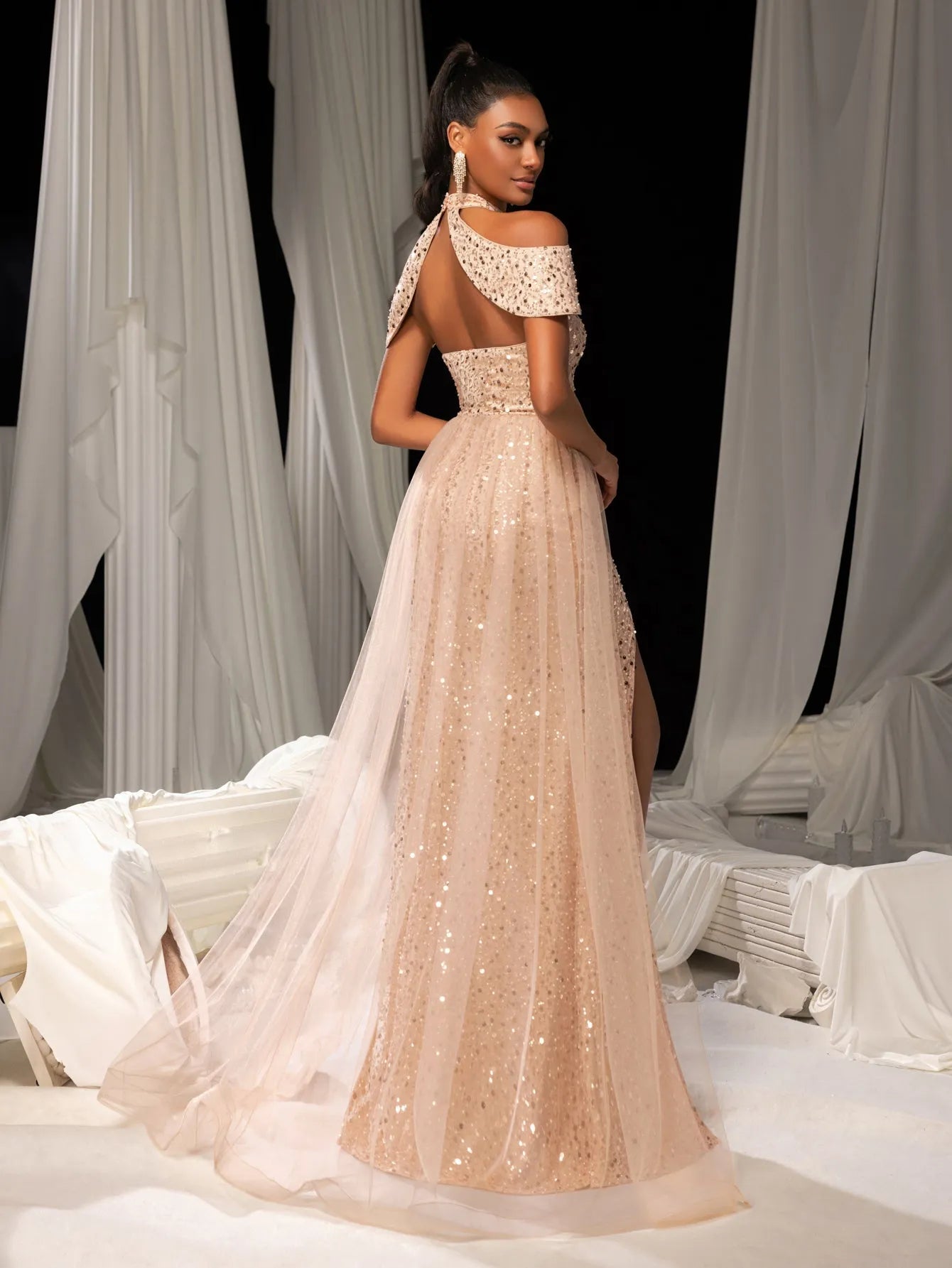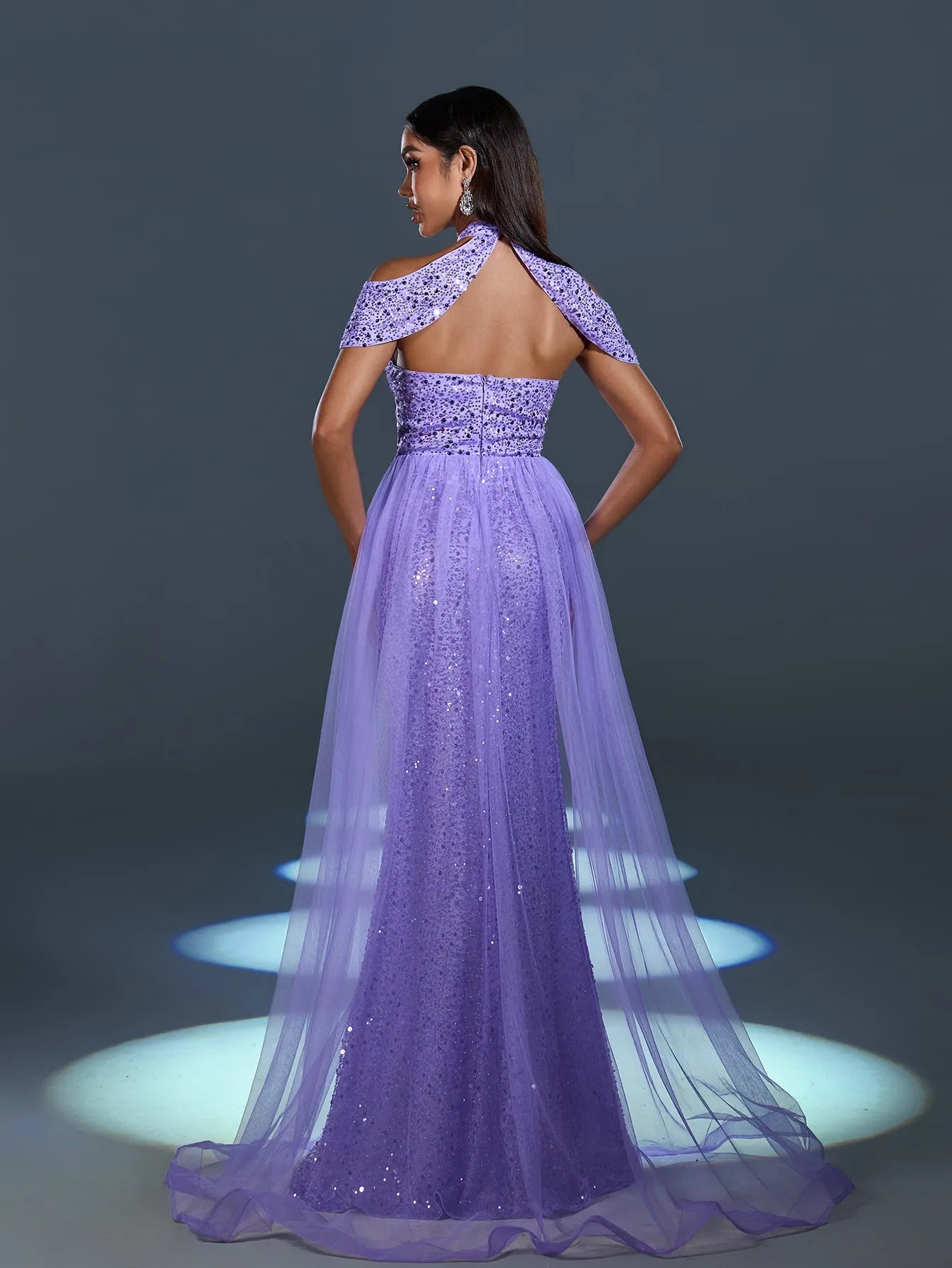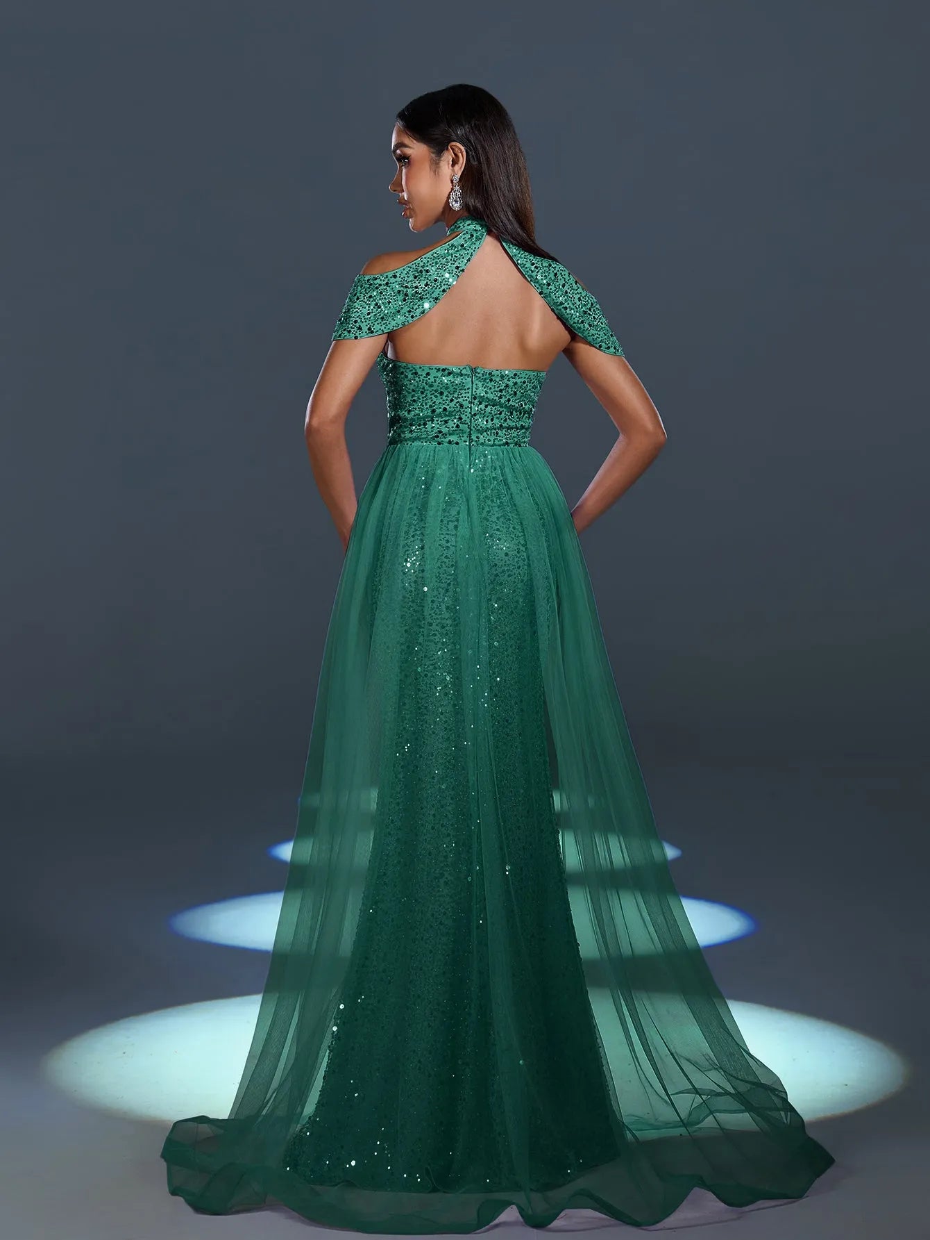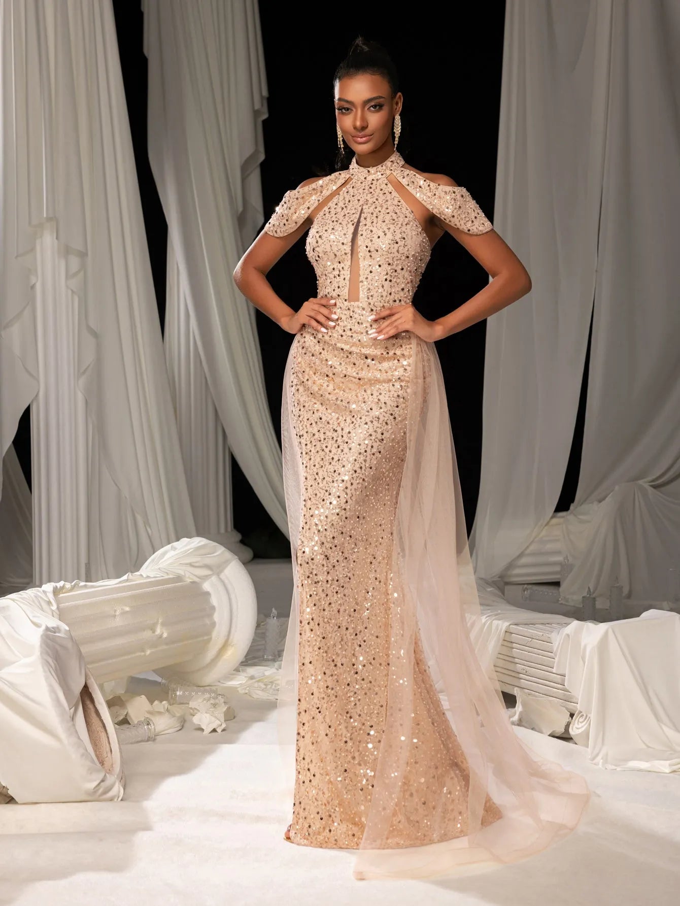 Radiate elegance and charm with our enchanting sequin gown, designed to turn heads at any event. This exquisite dress features a high-neck cutout design with a chic cape-style shoulder accent for a dramatic yet graceful look. The sparkling sequins catch the light beautifully, while the sheer flowing tulle overlay adds a soft, ethereal touch. A thigh-high slit adds a sultry edge to this glamorous gown, perfect for showcasing your sophisticated style.