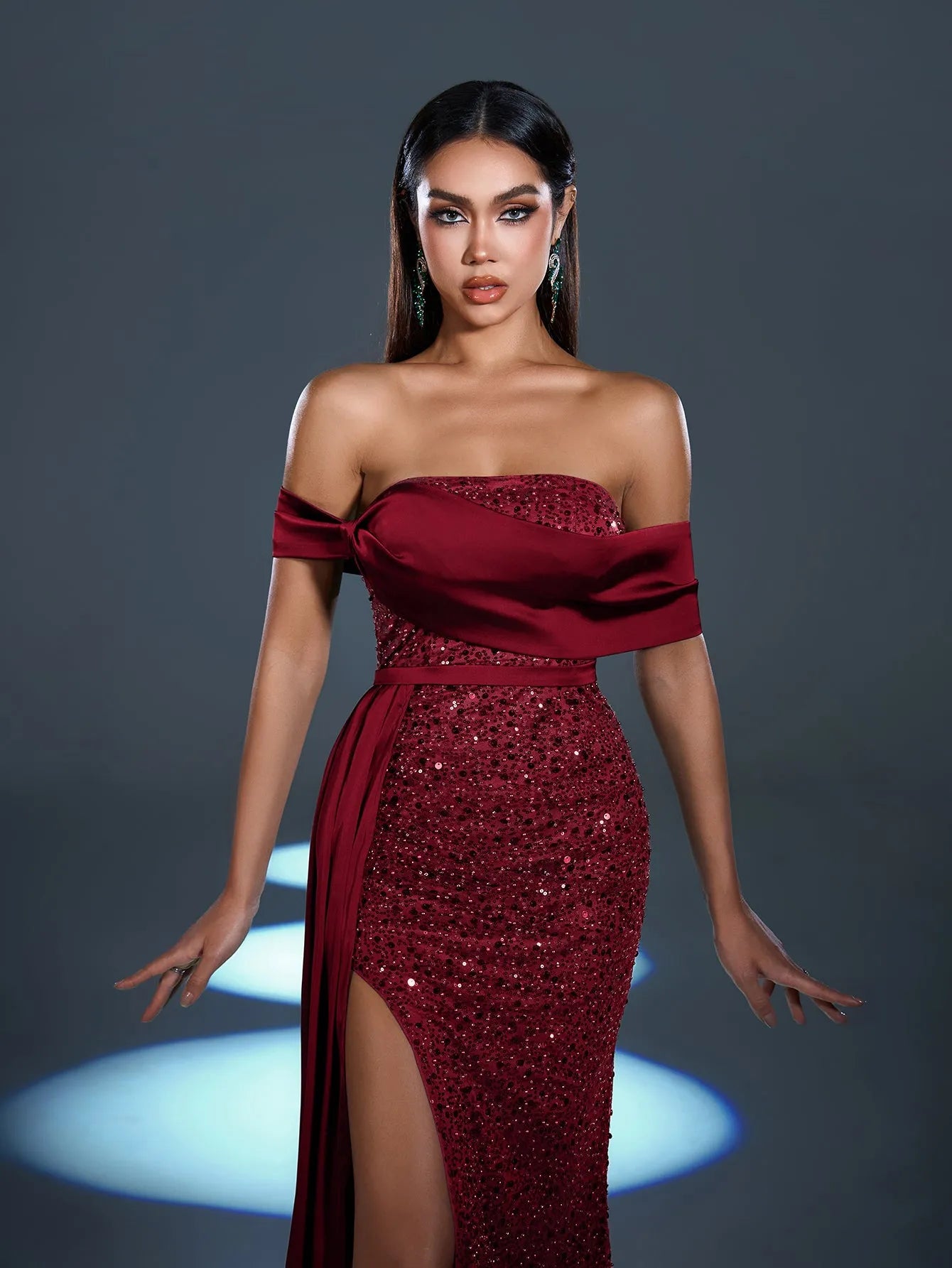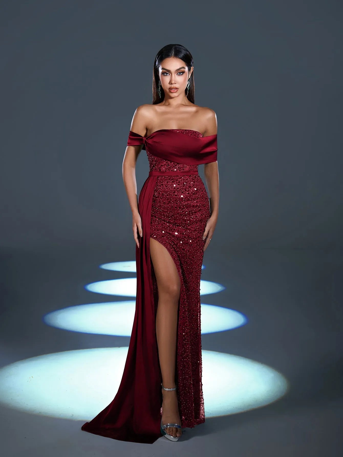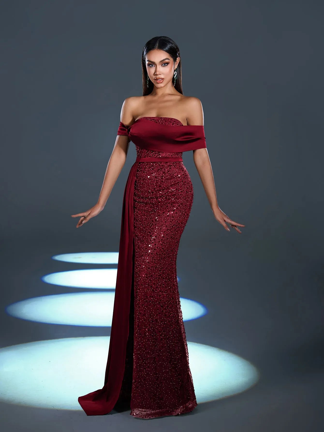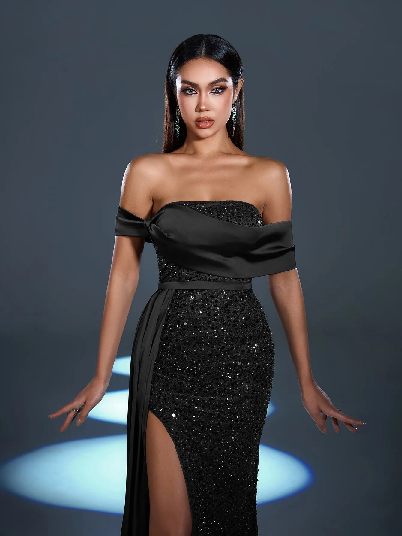 Step into the spotlight with this stunning gown, crafted for those who want to make a bold statement. This off-the-shoulder design features a luxurious satin bodice that elegantly wraps the neckline and shoulders. The fitted skirt is adorned with shimmering sequins, creating a sparkling effect that catches the light with every move. A thigh-high slit adds a sultry touch, while the draped sash detail enhances the gown's sophisticated silhouette.