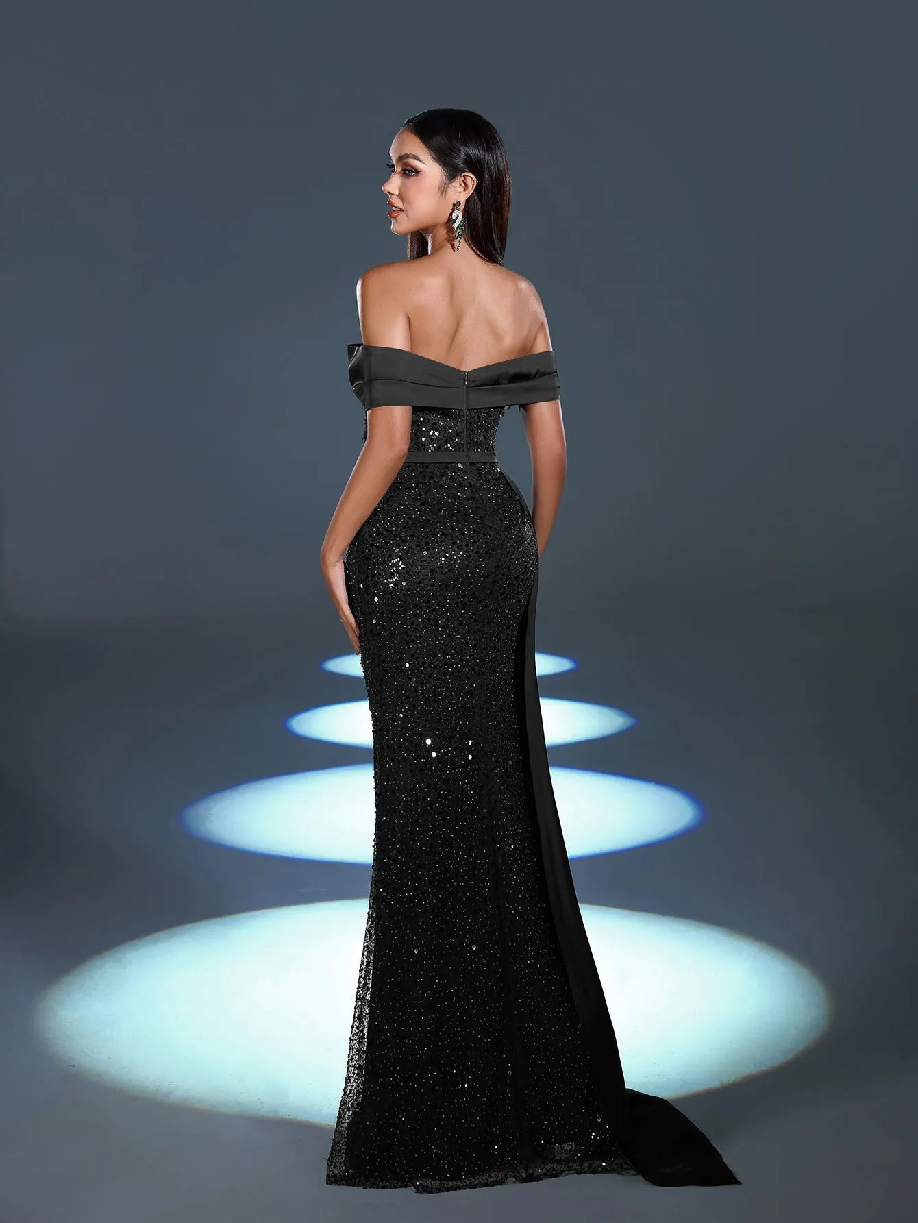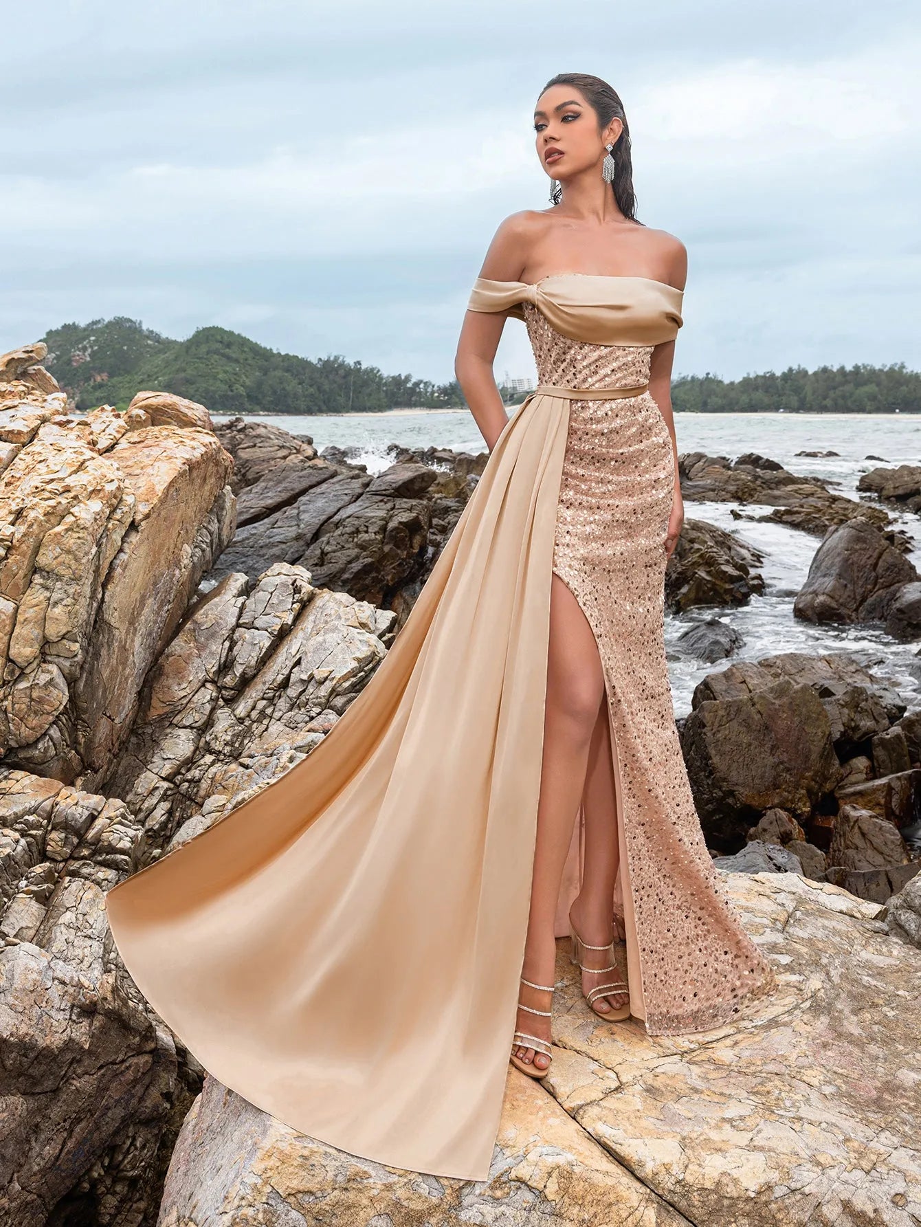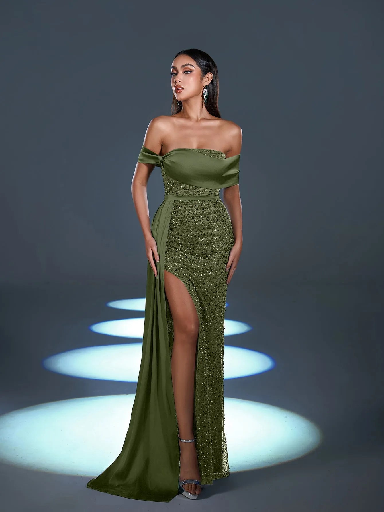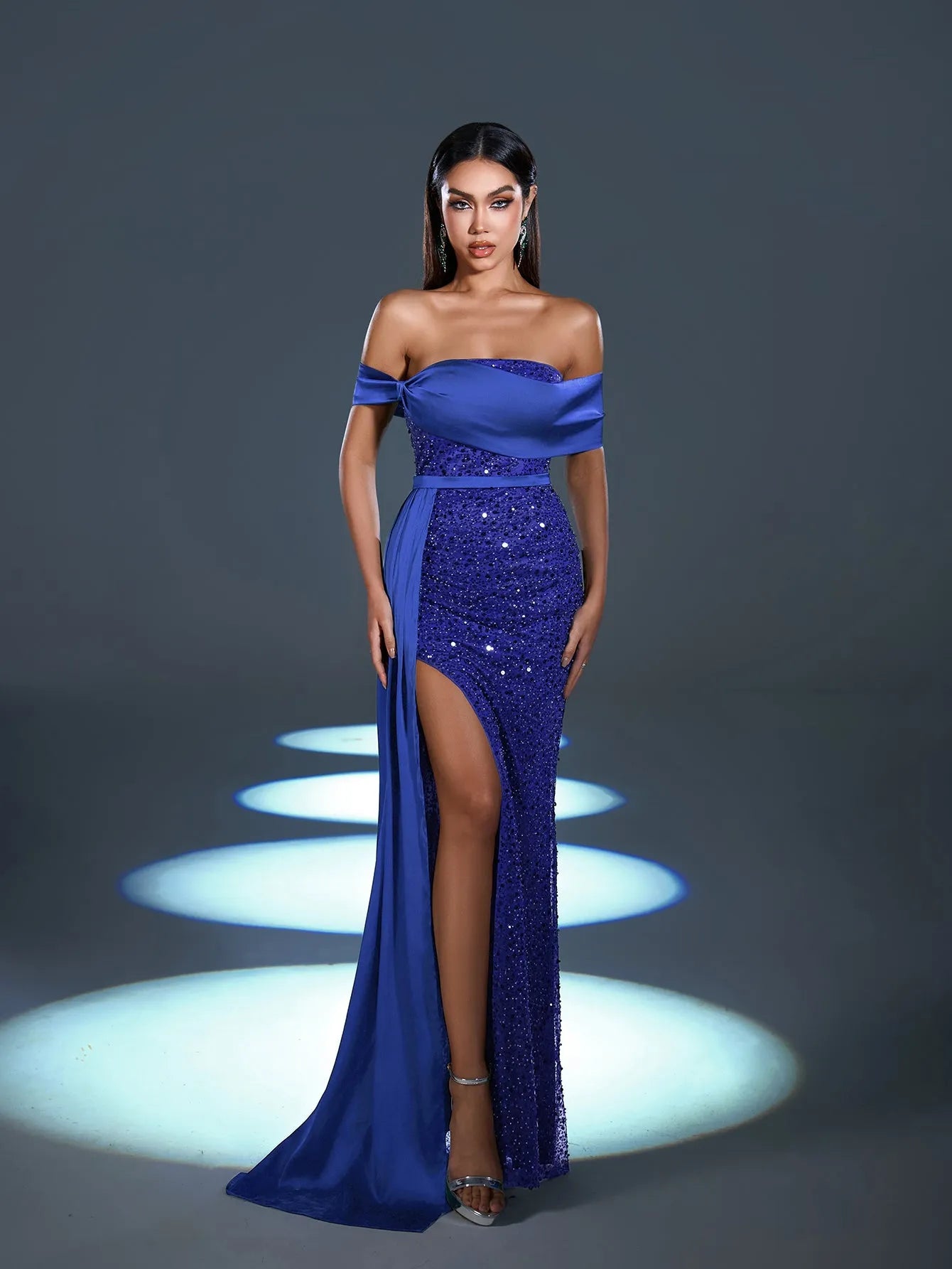 Step into the spotlight with this stunning gown, crafted for those who want to make a bold statement. This off-the-shoulder design features a luxurious satin bodice that elegantly wraps the neckline and shoulders. The fitted skirt is adorned with shimmering sequins, creating a sparkling effect that catches the light with every move. A thigh-high slit adds a sultry touch, while the draped sash detail enhances the gown's sophisticated silhouette.