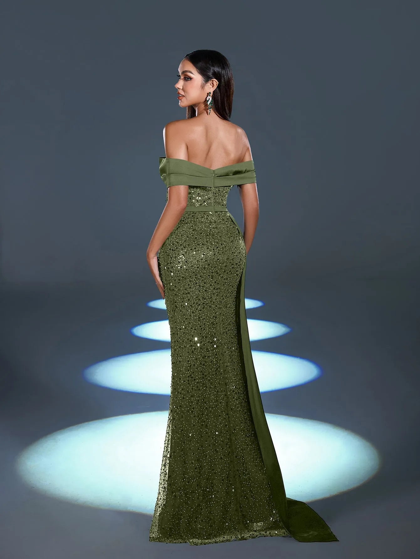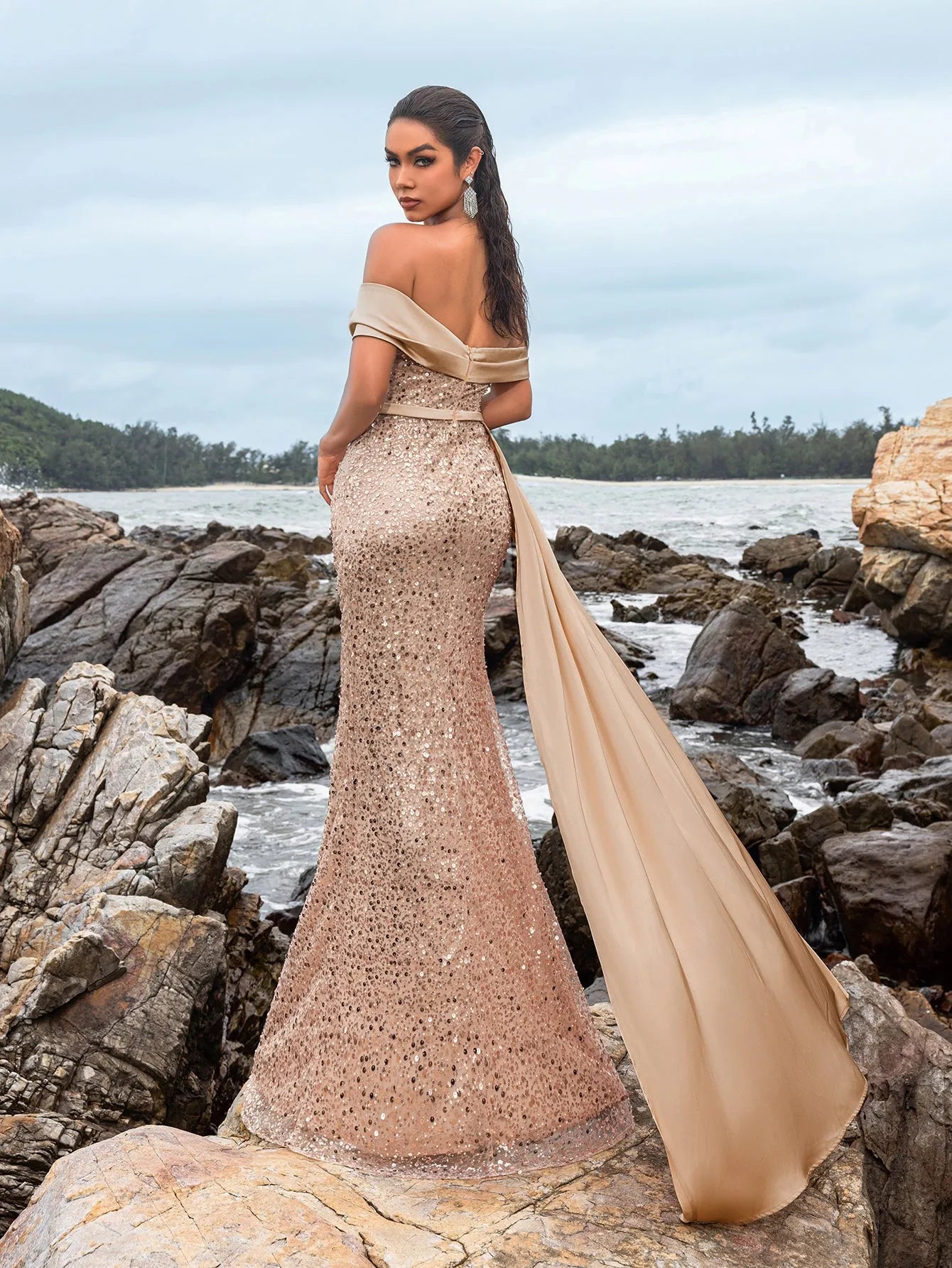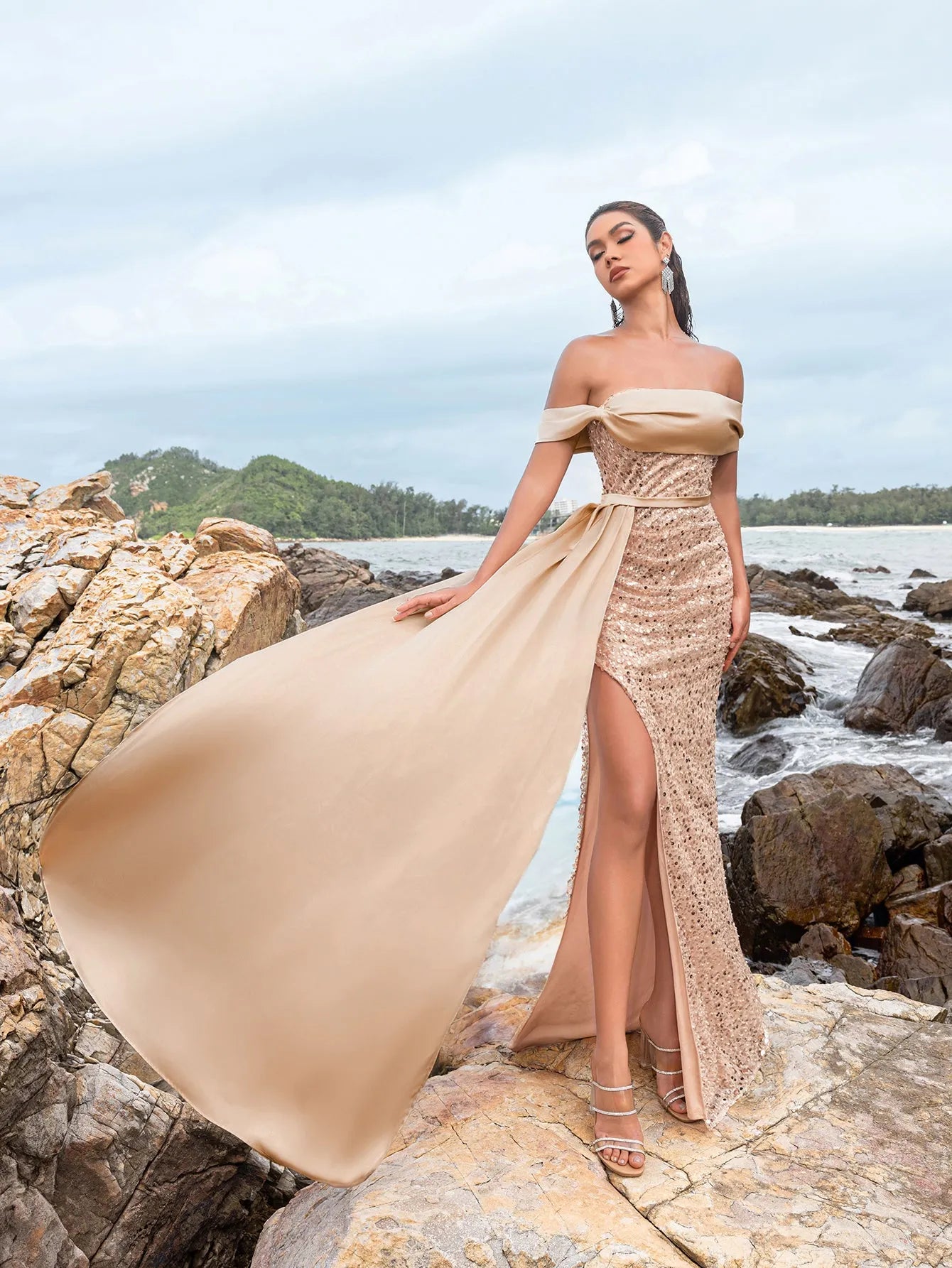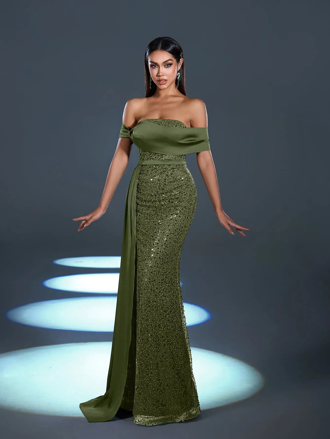 Step into the spotlight with this stunning gown, crafted for those who want to make a bold statement. This off-the-shoulder design features a luxurious satin bodice that elegantly wraps the neckline and shoulders. The fitted skirt is adorned with shimmering sequins, creating a sparkling effect that catches the light with every move. A thigh-high slit adds a sultry touch, while the draped sash detail enhances the gown's sophisticated silhouette.