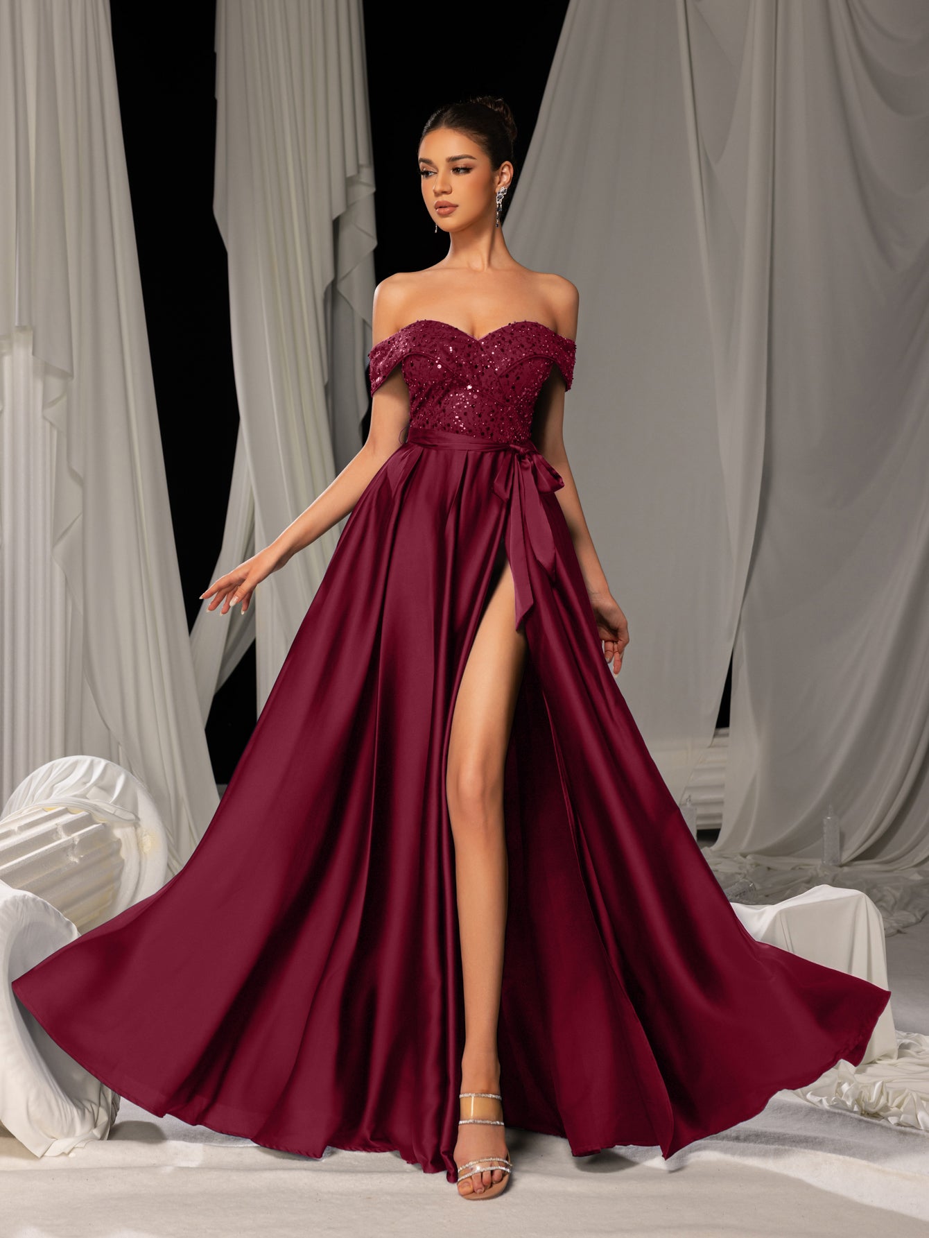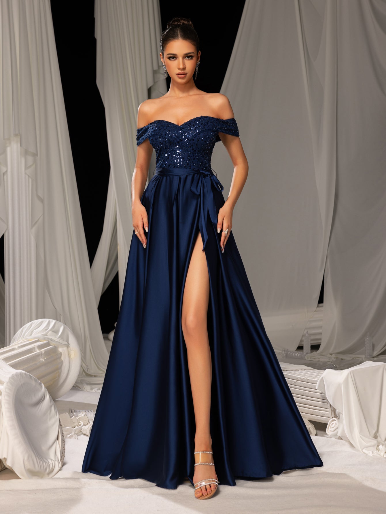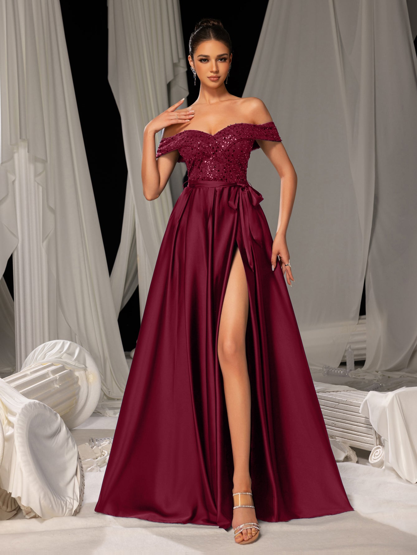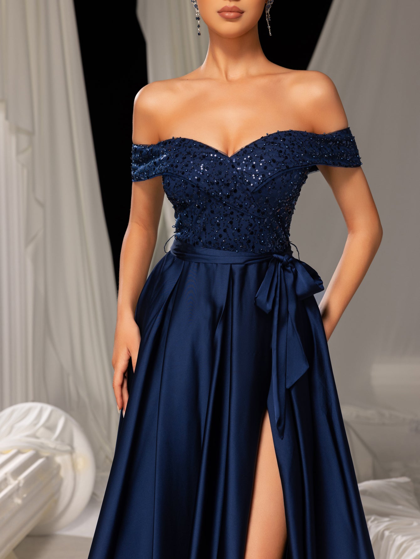 Elegant Off-Shoulder Evening Gown with Sequin Embellishments – High Slit Satin Skirt & Back Zipper for Luxury Weddings or Evening Glam, XS-XL
