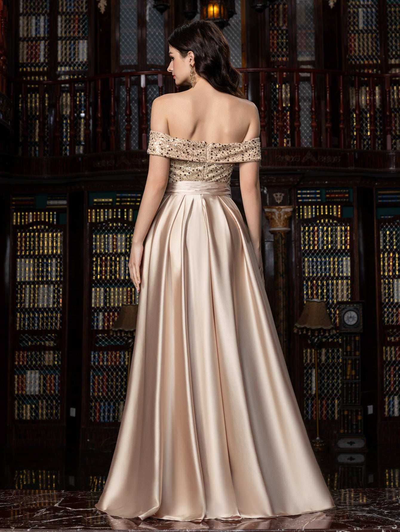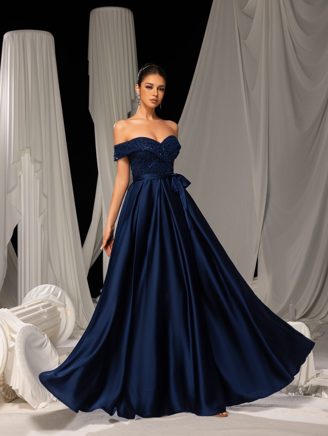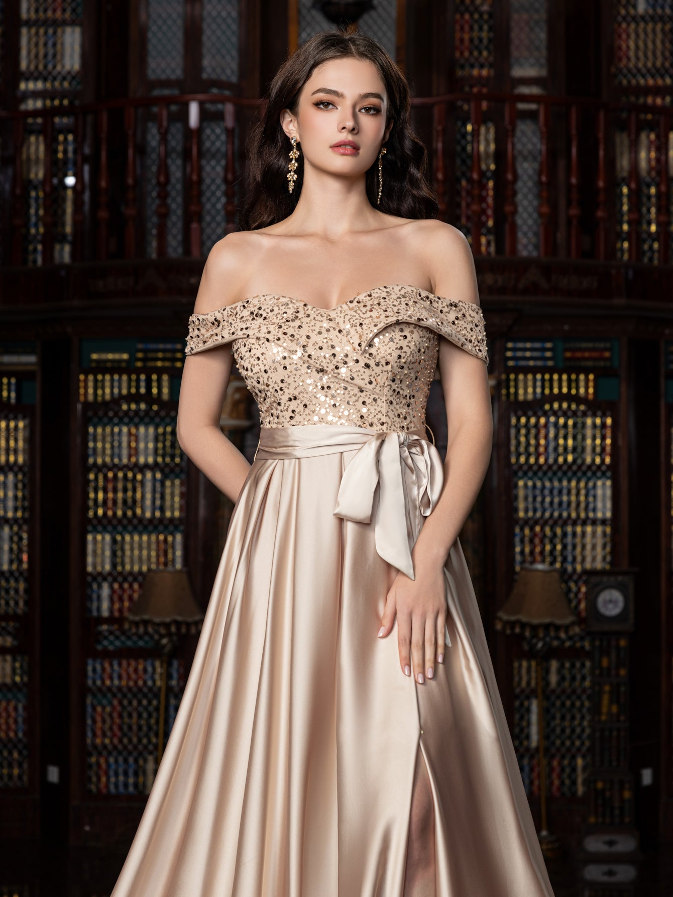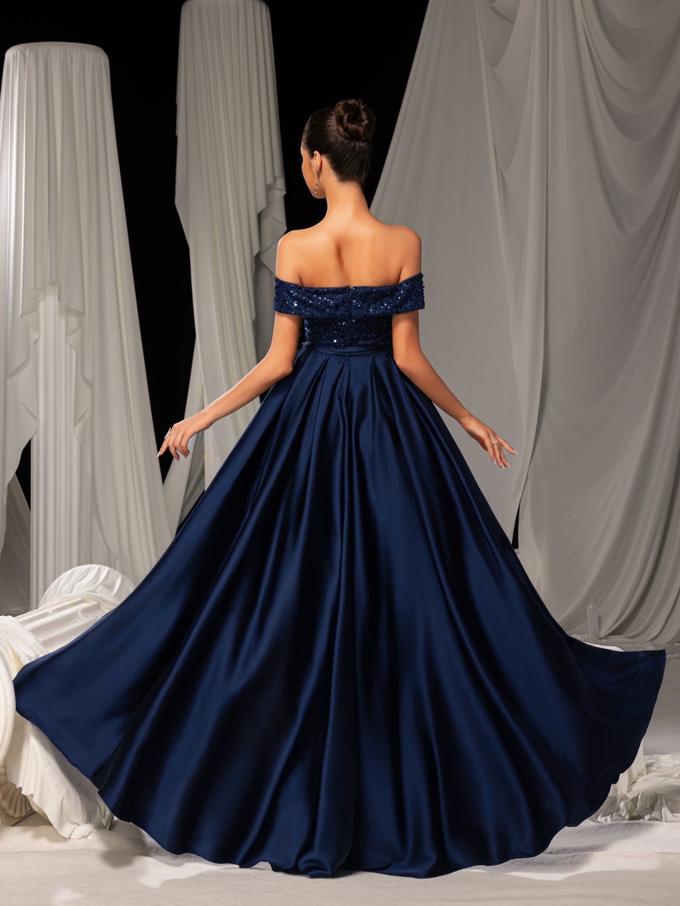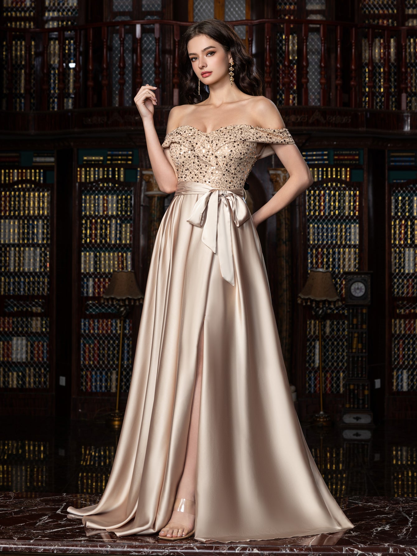 Elegant Off-Shoulder Evening Gown with Sequin Embellishments – High Slit Satin Skirt & Back Zipper for Luxury Weddings or Evening Glam, XS-XL