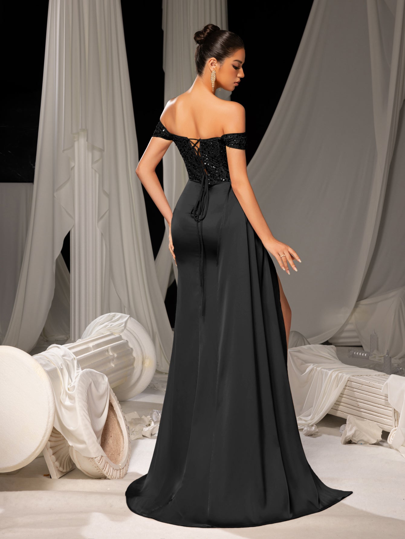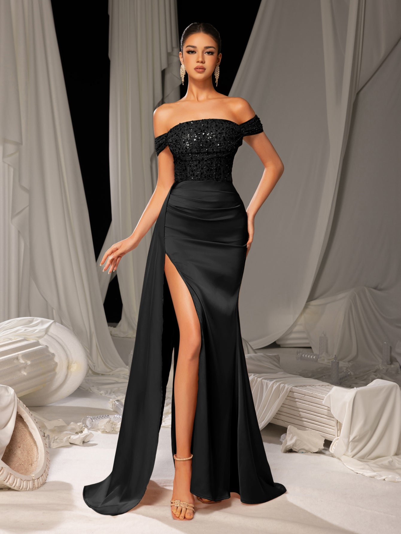✨ Chic Sophistication: This off-shoulder gown effortlessly blends elegance with modern allure. The high slit design adds a bold, sultry edge, while intricate beading details on the bodice highlight craftsmanship and luxury. The flowing satin fabric cascades gracefully to the floor, creating a silhouette that balances sensuality and refinement.