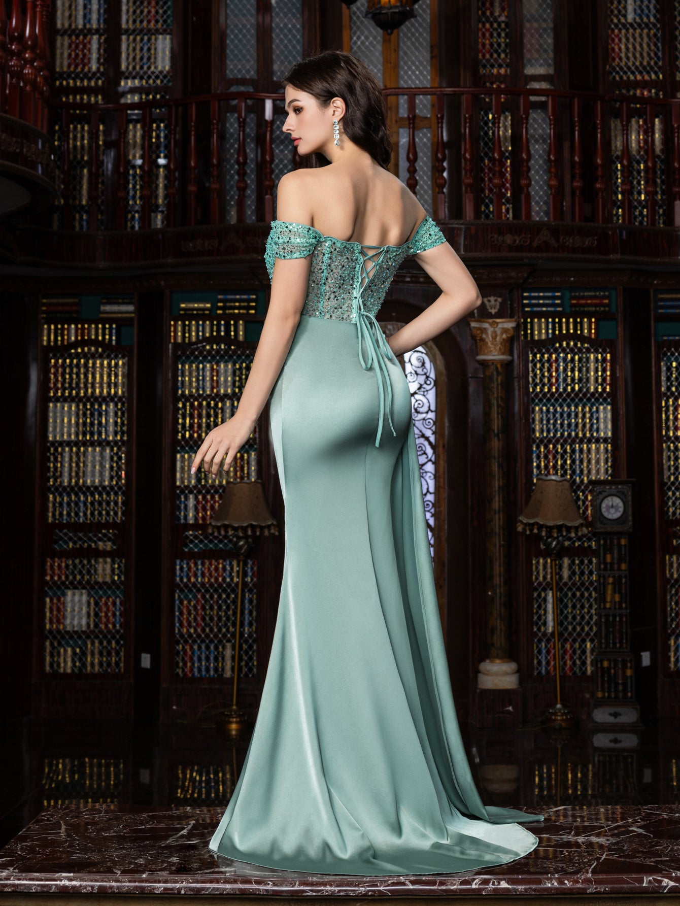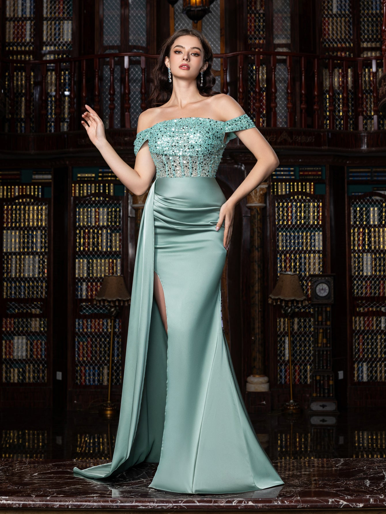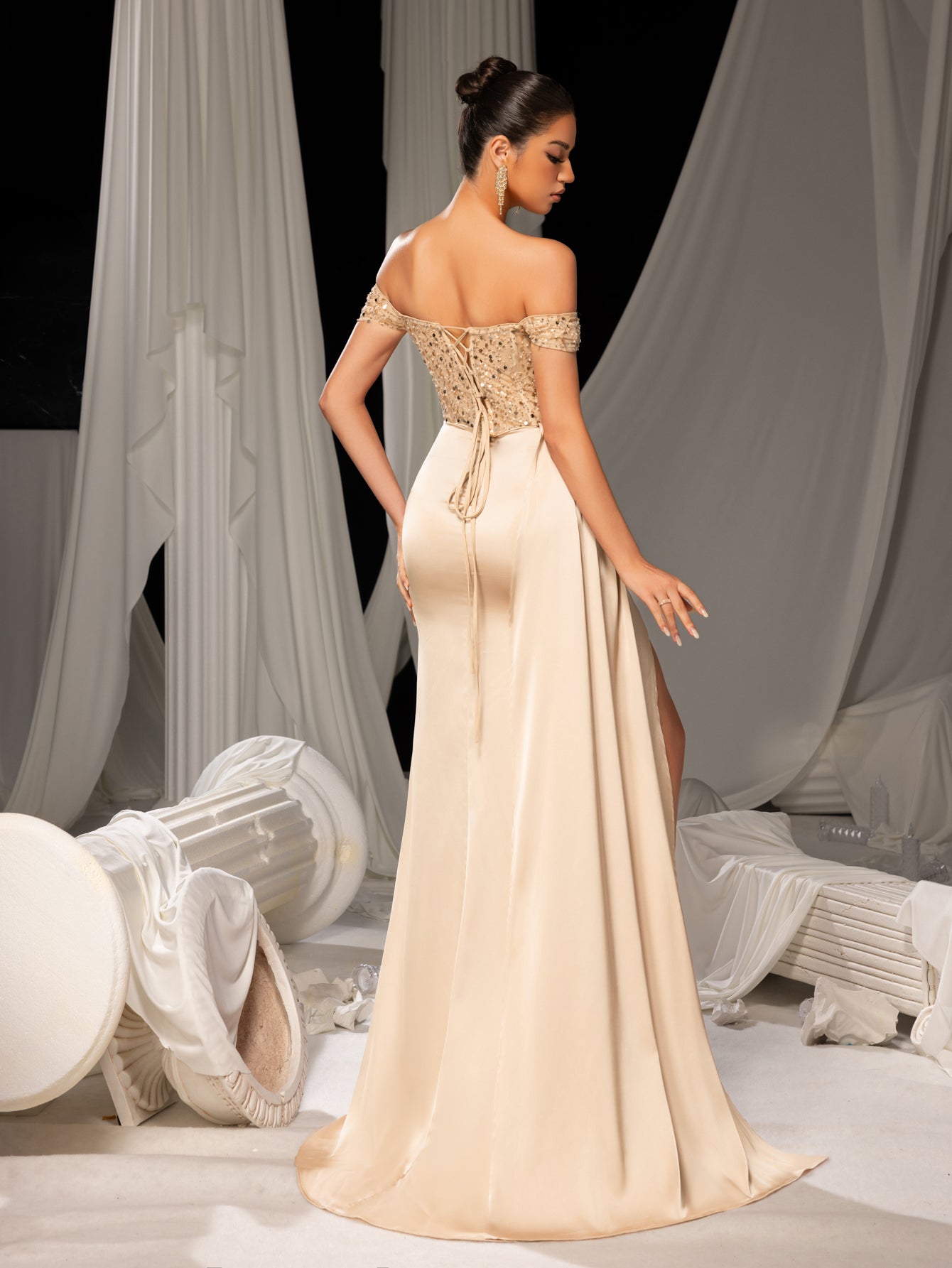 Elegant Off-Shoulder Gown with High Slit & Beaded Bodice – Luxury Satin Evening Wear for Red Carpet, Formal Galas & Luxury Weddings, XS-XL