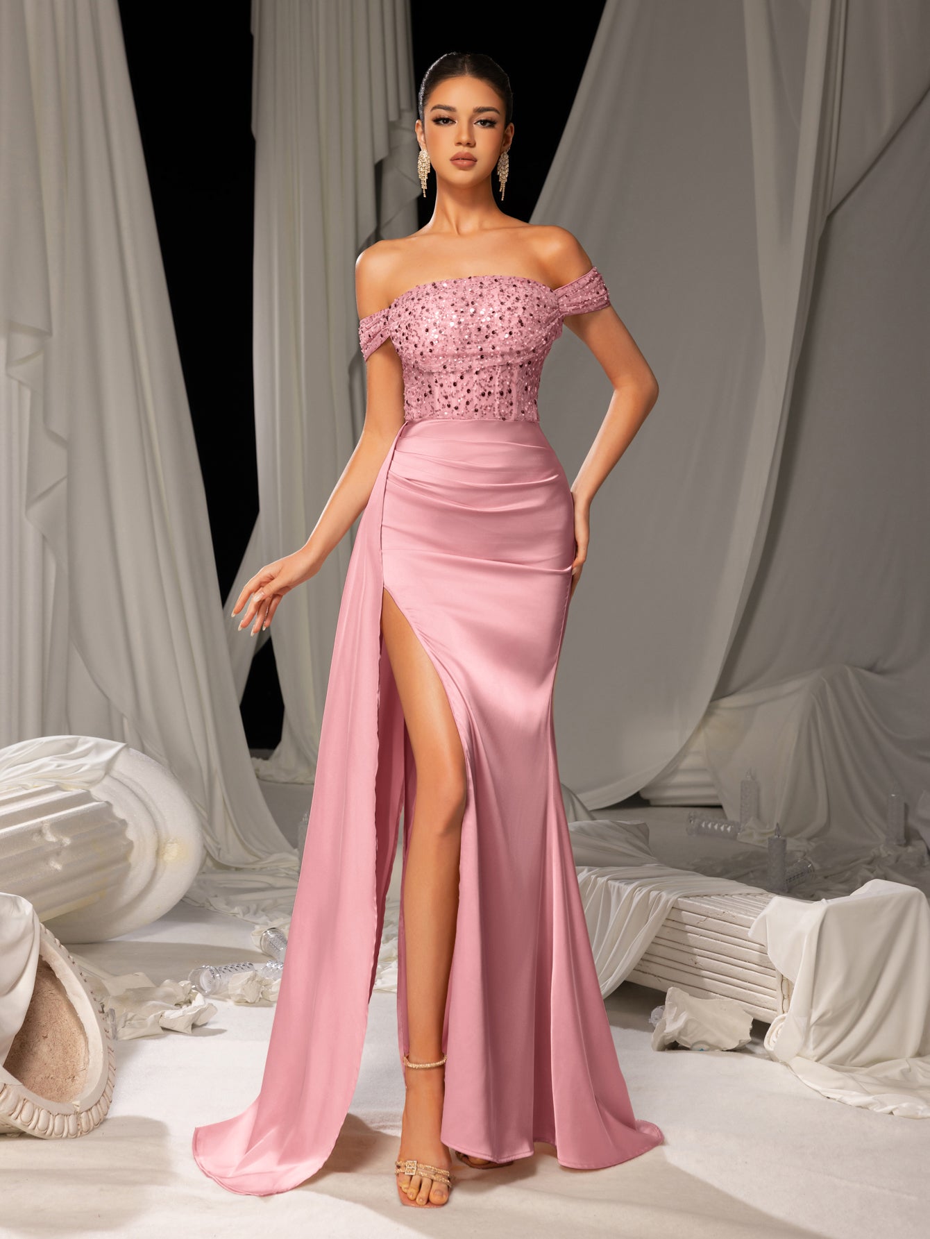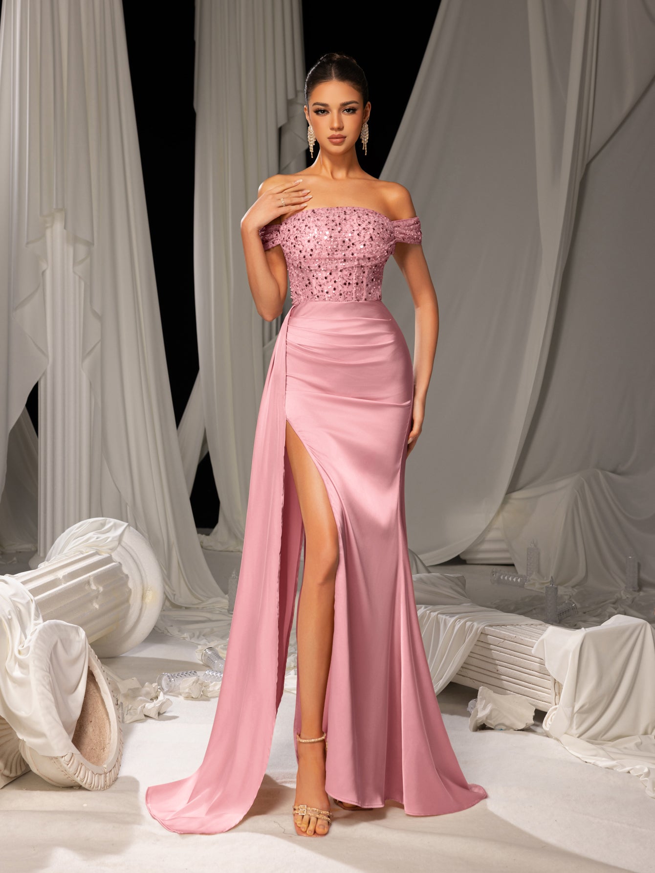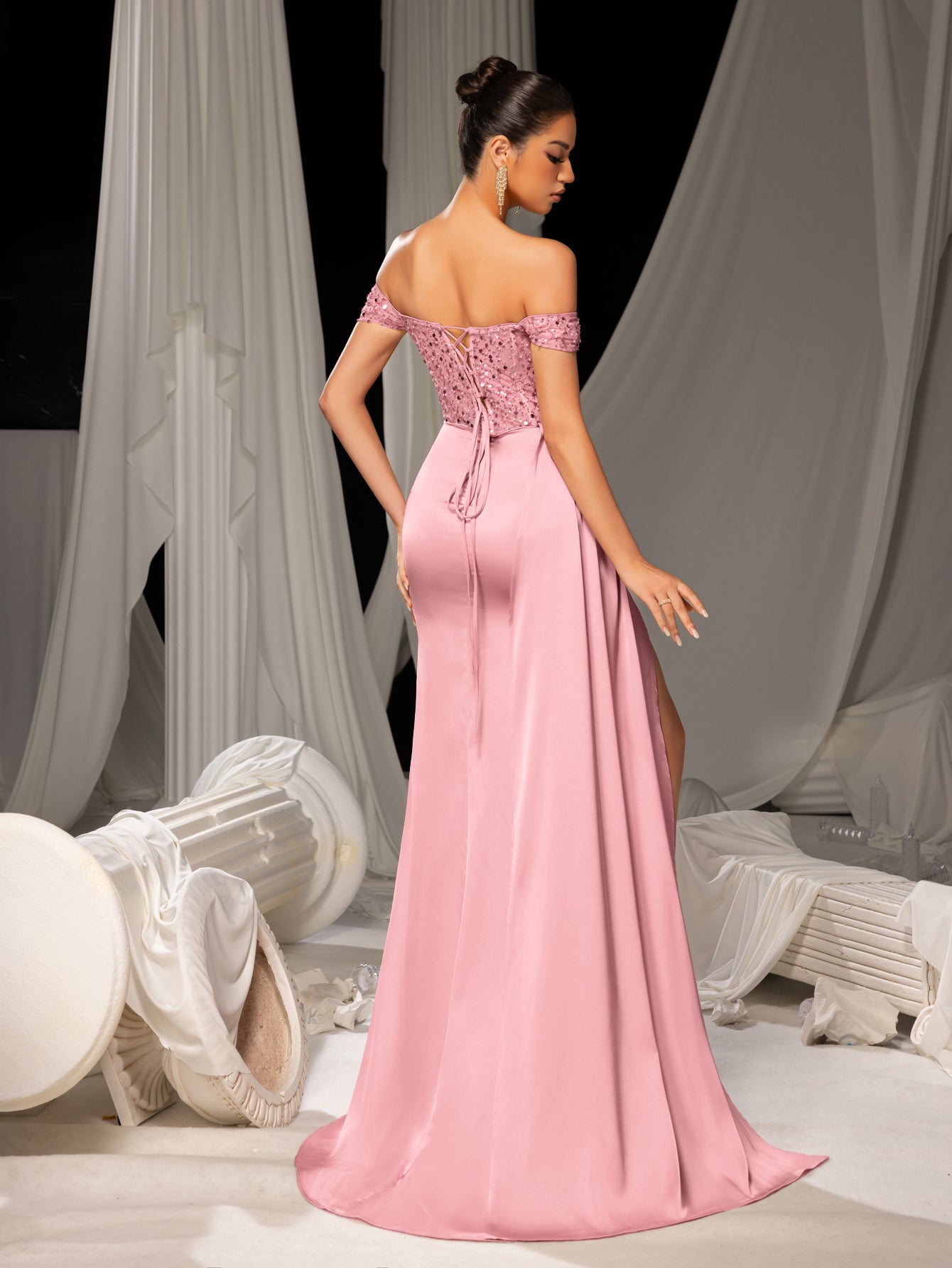 Elegant Off-Shoulder Gown with High Slit & Beaded Bodice – Luxury Satin Evening Wear for Red Carpet, Formal Galas & Luxury Weddings, XS-XL