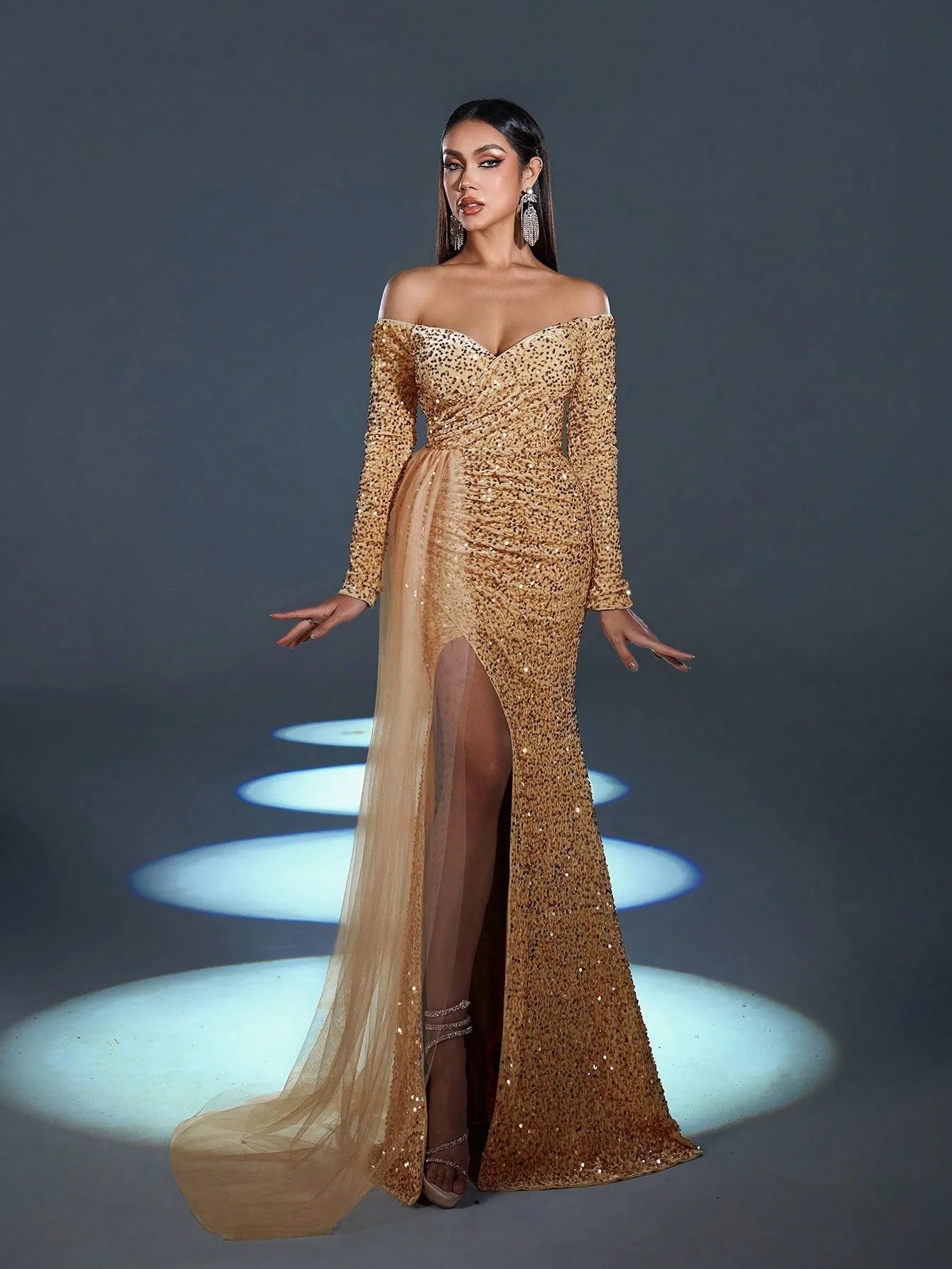 Step into timeless elegance with our exquisite evening gown, a masterpiece of glamour and sophistication. This off-shoulder design accentuates the neckline, while the fully sequined fabric glistens with every movement, making you the center of attention. The asymmetrical draping cinches the waist, creating a flattering silhouette that transitions into a high-slit skirt, exuding both grace and allure. A subtle sheer cape cascades elegantly from the waist, adding a touch of drama and ethereal beauty to your ensemble.