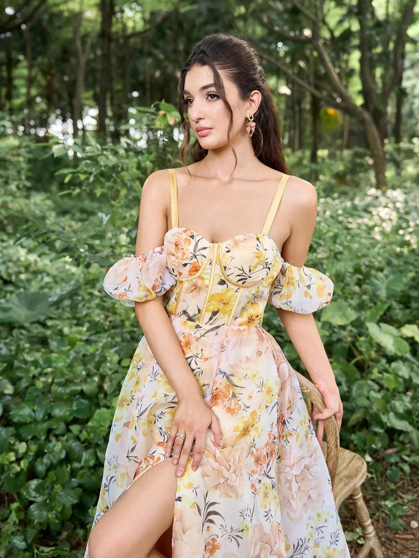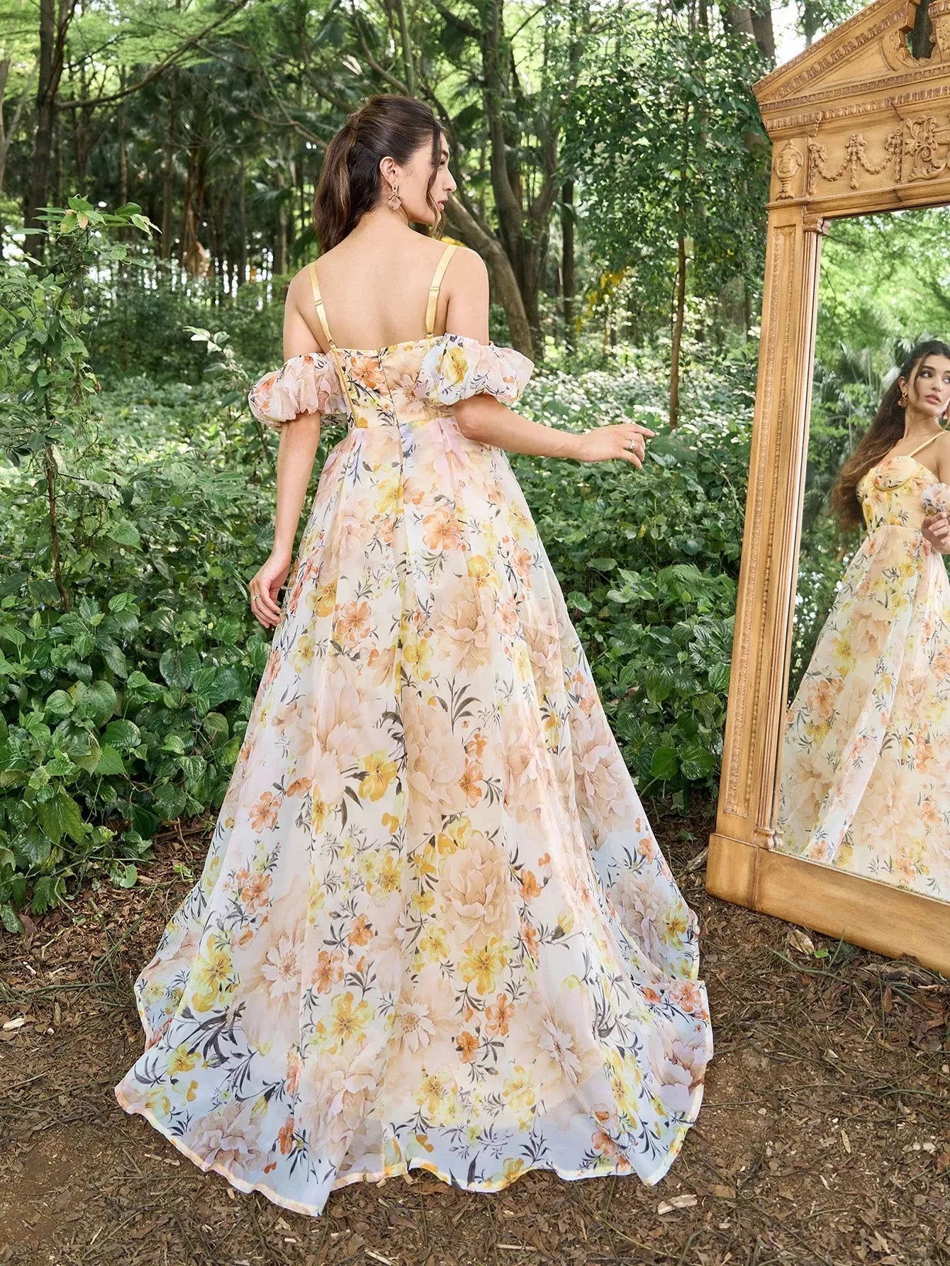 Step into elegance with our floral gown, designed for those who appreciate a touch of romance in their wardrobe. This stunning dress features a sweetheart neckline and delicate off-shoulder puff sleeves, adding a playful yet sophisticated element to the overall look. The fitted bodice is enhanced with a corset-style back, ensuring a perfect fit, while the flowy A-line skirt, adorned with vibrant floral prints, drapes beautifully to create a graceful silhouette. The high slit adds a hint of allure, making this gown a perfect choice for outdoor events or garden weddings.