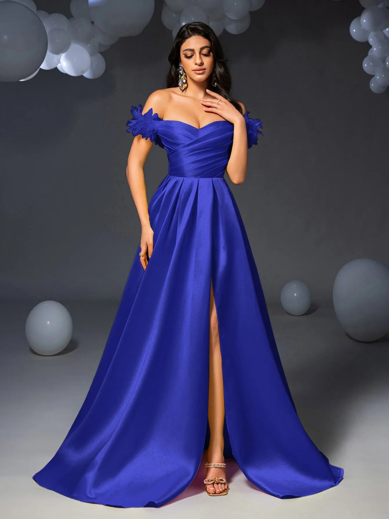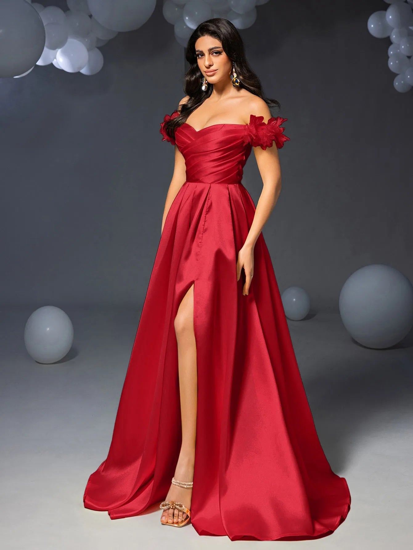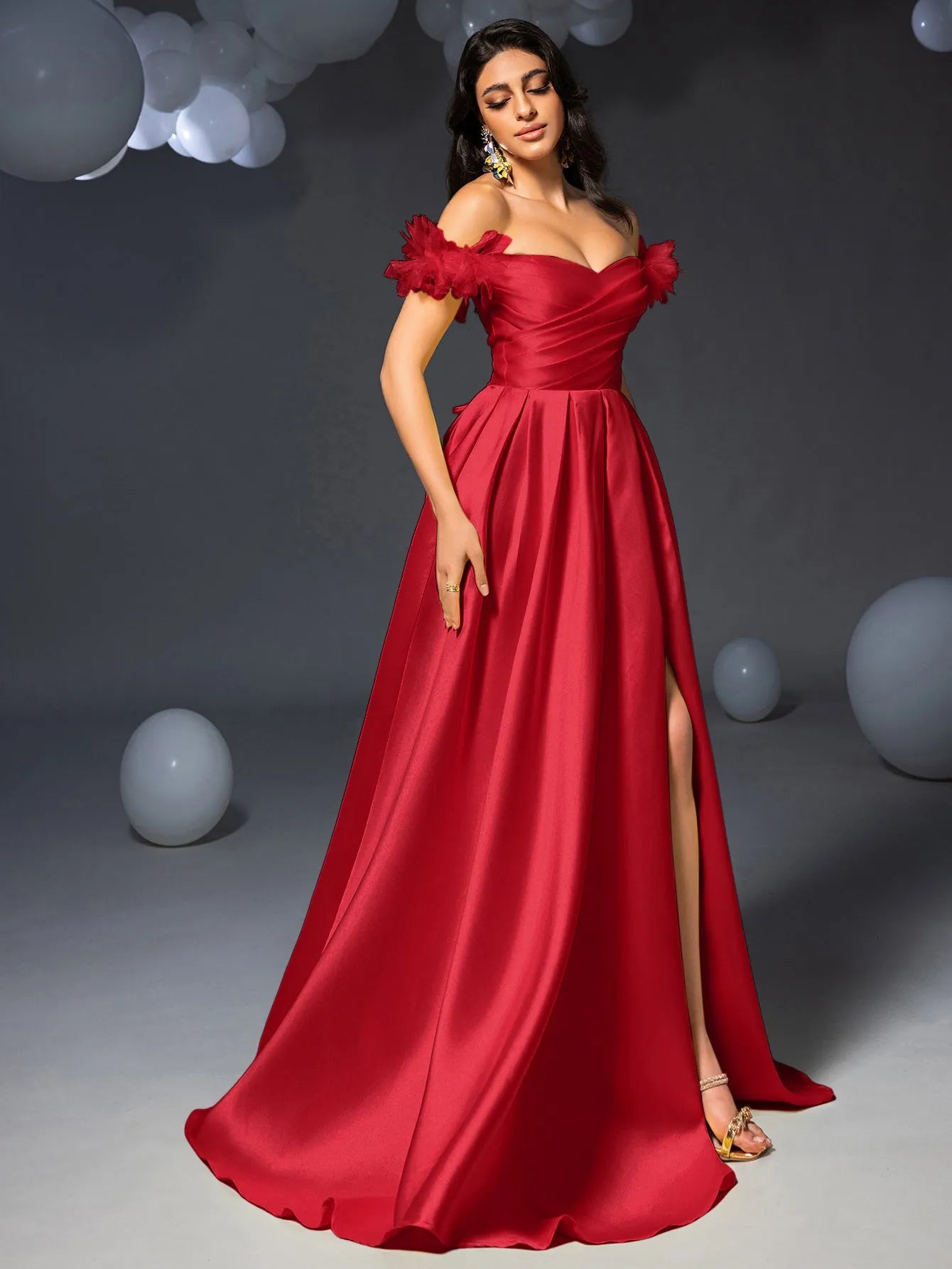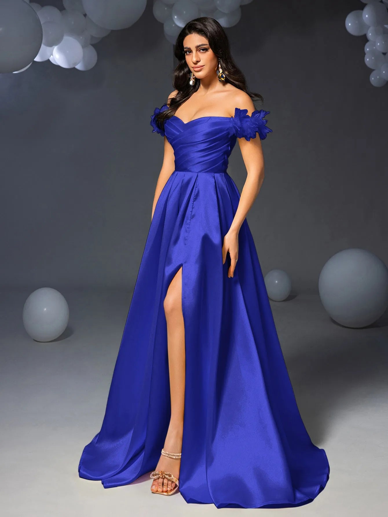 Turn heads and make an unforgettable entrance with this satin gown, designed to exude both elegance and drama. The off-shoulder design features delicate floral appliqué detailing along the sleeves, adding a whimsical touch to the structured bodice. The lace-up back creates a flattering silhouette, while the full skirt with a daring thigh-high slit brings modern flair to this classic look.