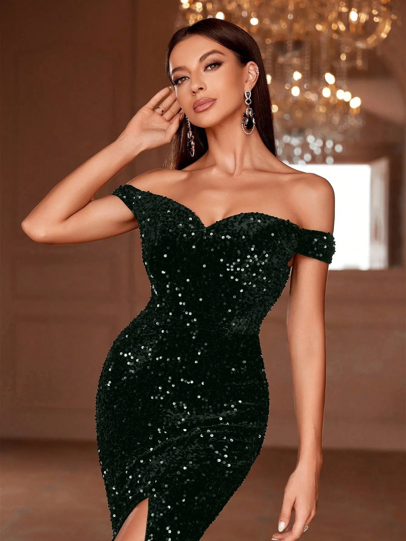 Make a dazzling entrance with our off-shoulder sequin gown, designed to capture attention at any special event. This gown features a luxurious off-the-shoulder neckline, showcasing your collarbones, and a curve-hugging silhouette that cascades into a mermaid-style skirt. The gown’s shimmering sequin fabric creates a mesmerizing effect with every movement, while the thigh-high slit adds a bold touch of allure.