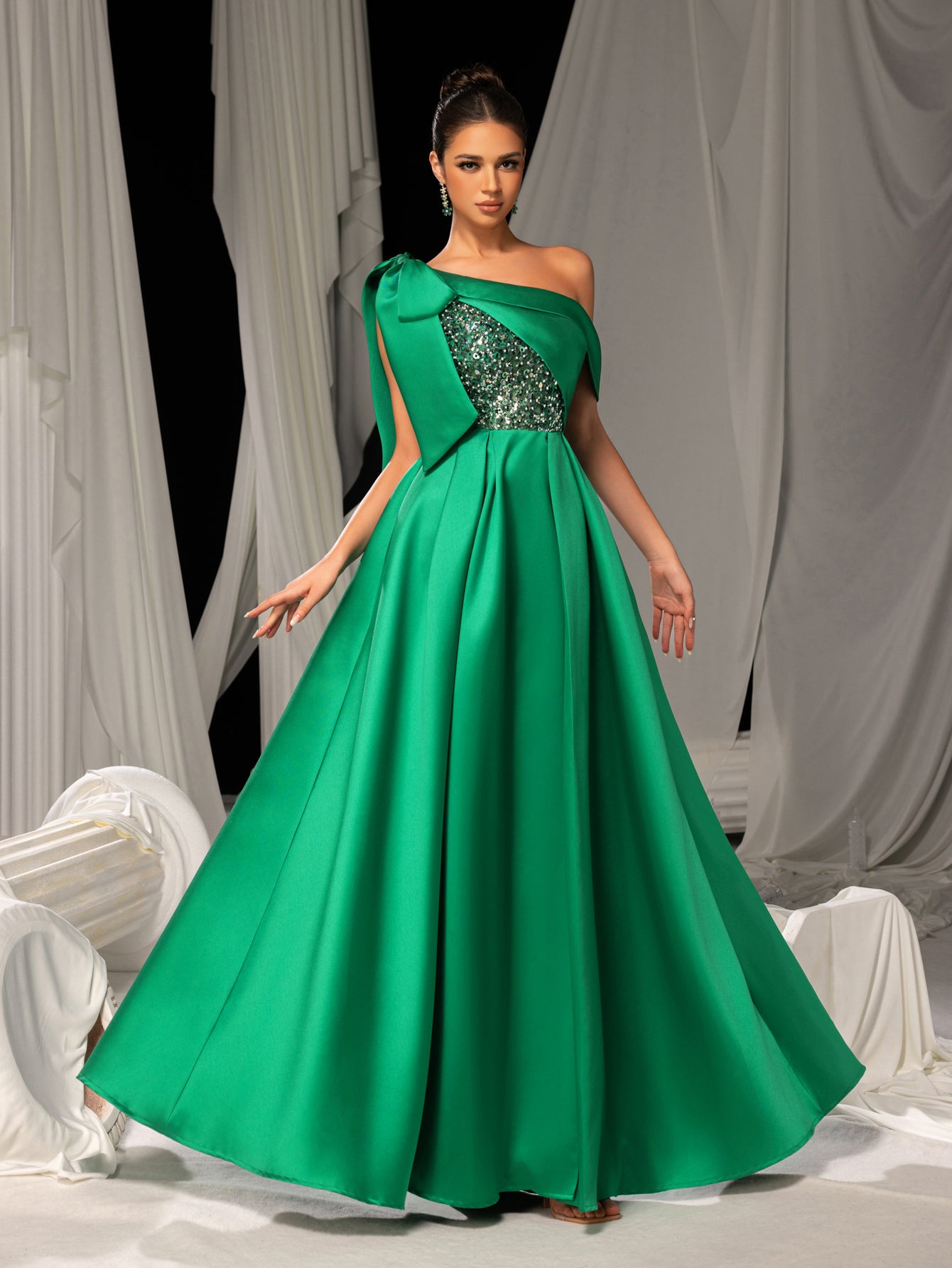 Elegant One-Shoulder Evening Gown with Dramatic Slit & Sequin Embellishments – Luxury Evening Wear for Red Carpet, Gala & Fashion Shows