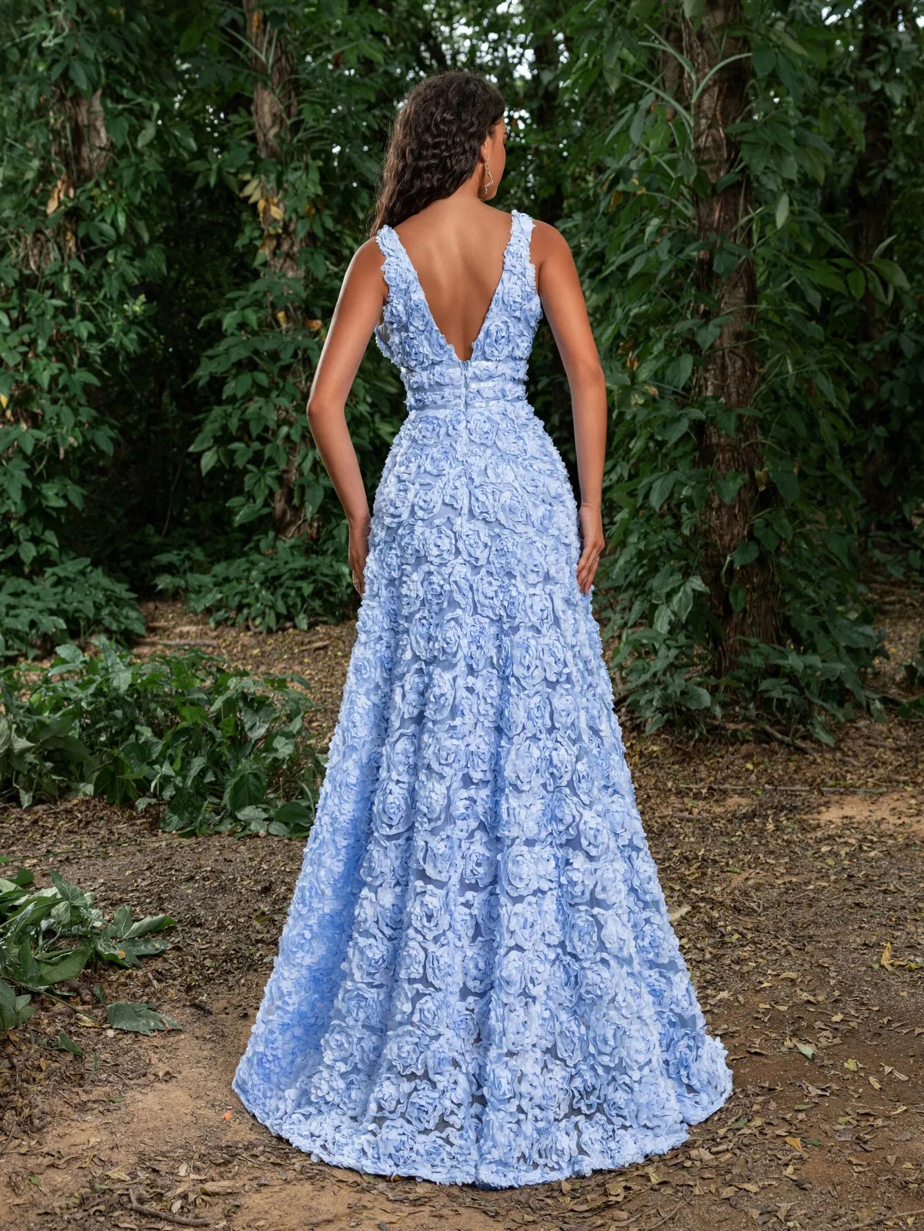 Step into spring with this enchanting gown, a vision of floral elegance and grace. This beautifully crafted dress features a deep V-neckline that enhances the feminine silhouette, complemented by a cinched waist that flares into a full, voluminous skirt adorned with layers of delicate fabric flowers. Each flower is meticulously attached to create a lush, textured effect that is both visually stunning and tactile.The deep V back adds a touch of allure, making the gown as breathtaking from behind as it is from the front. Ideal for weddings, garden parties, or any formal event where you want to make a memorable entrance.