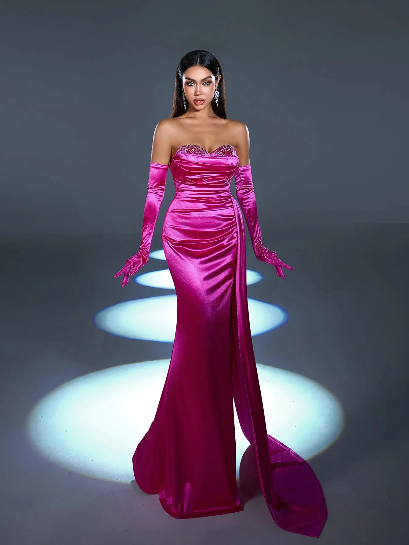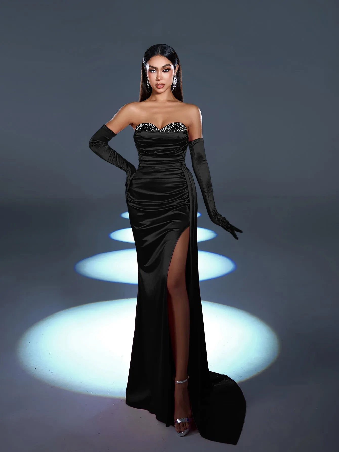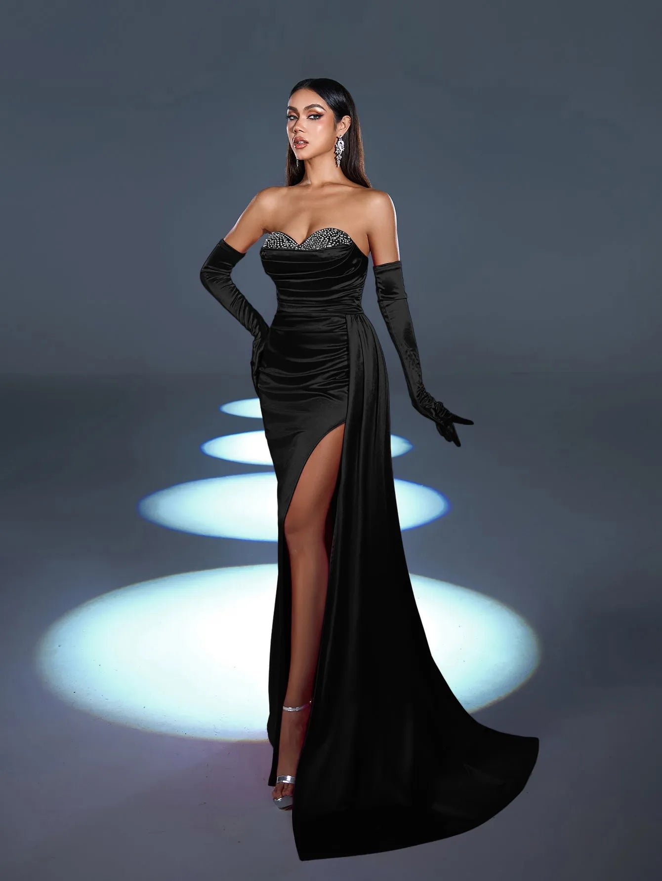 Step into luxury with our striking satin gown, designed to make a glamorous statement at any formal event. This gown features a sweetheart neckline with dazzling embellishments along the bodice, adding sparkle and sophistication. The fitted silhouette is accentuated with a high slit for a bold touch, while the dramatic satin draping adds movement and elegance. Complete with matching satin gloves, this ensemble is the epitome of classic Hollywood glamour.
