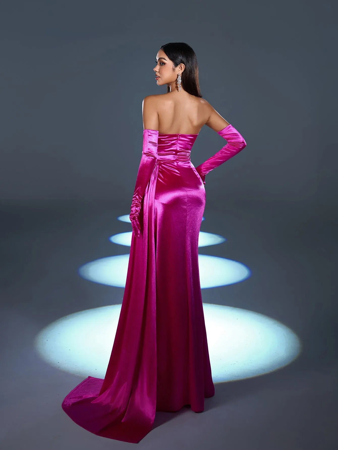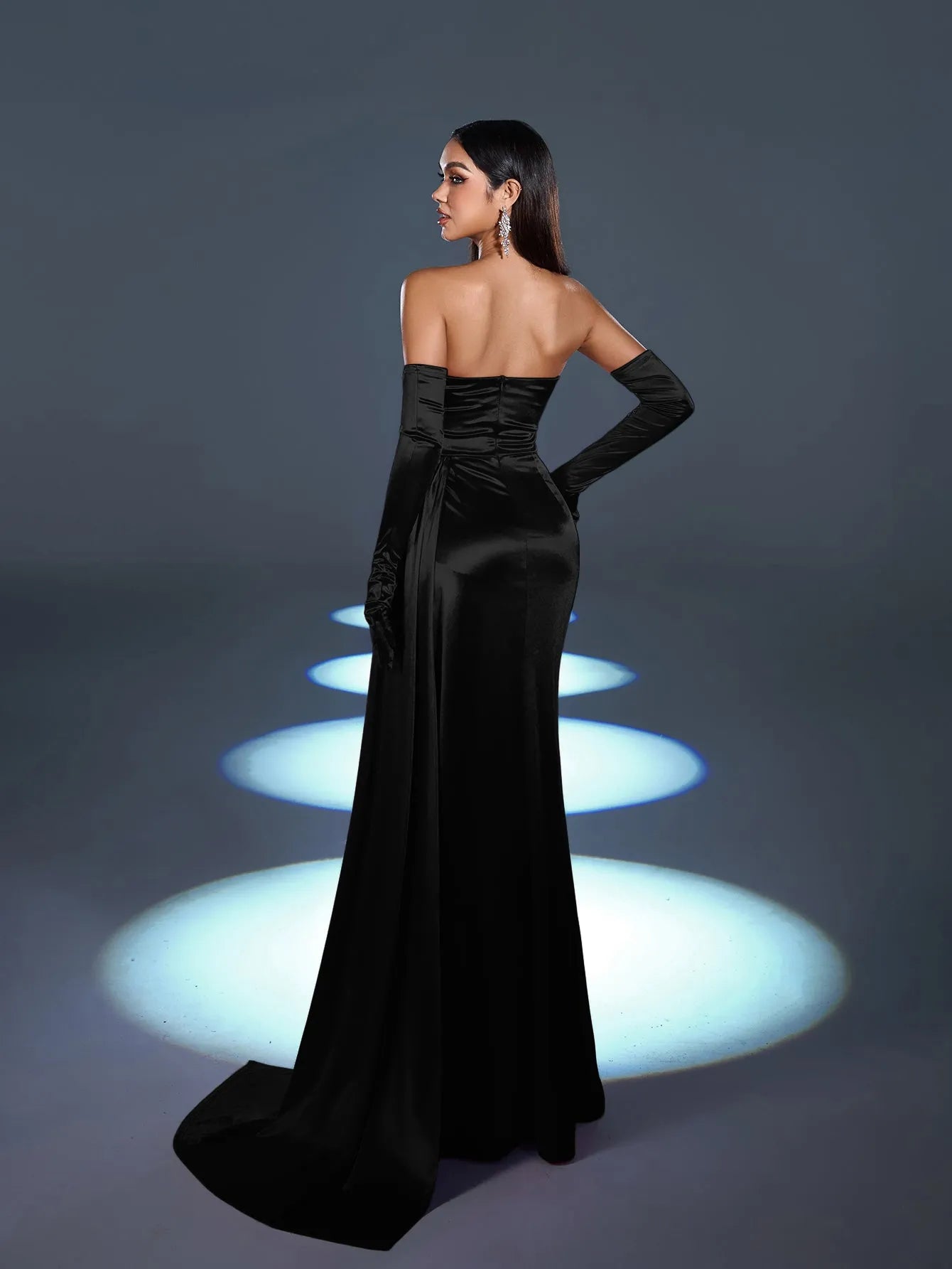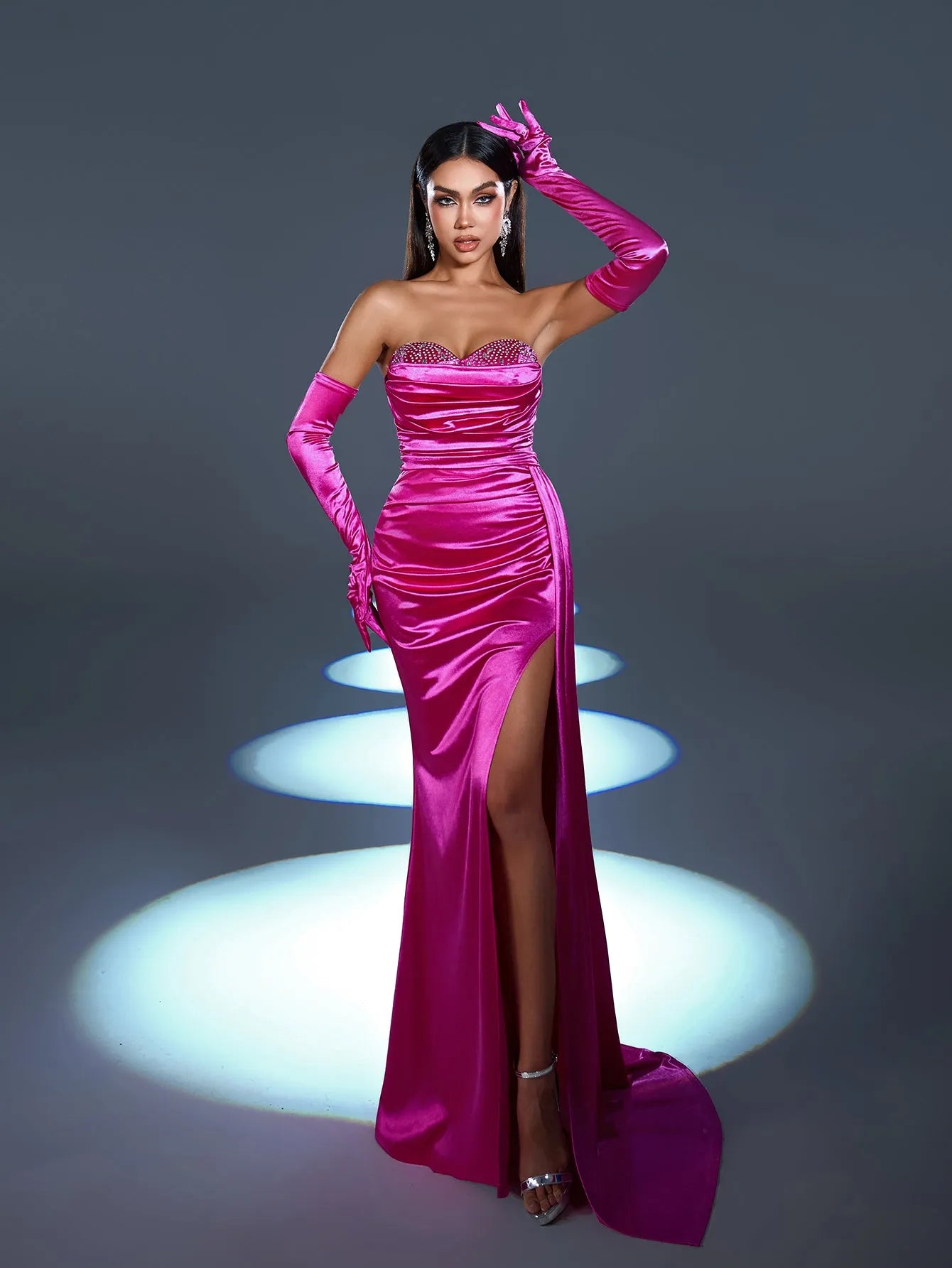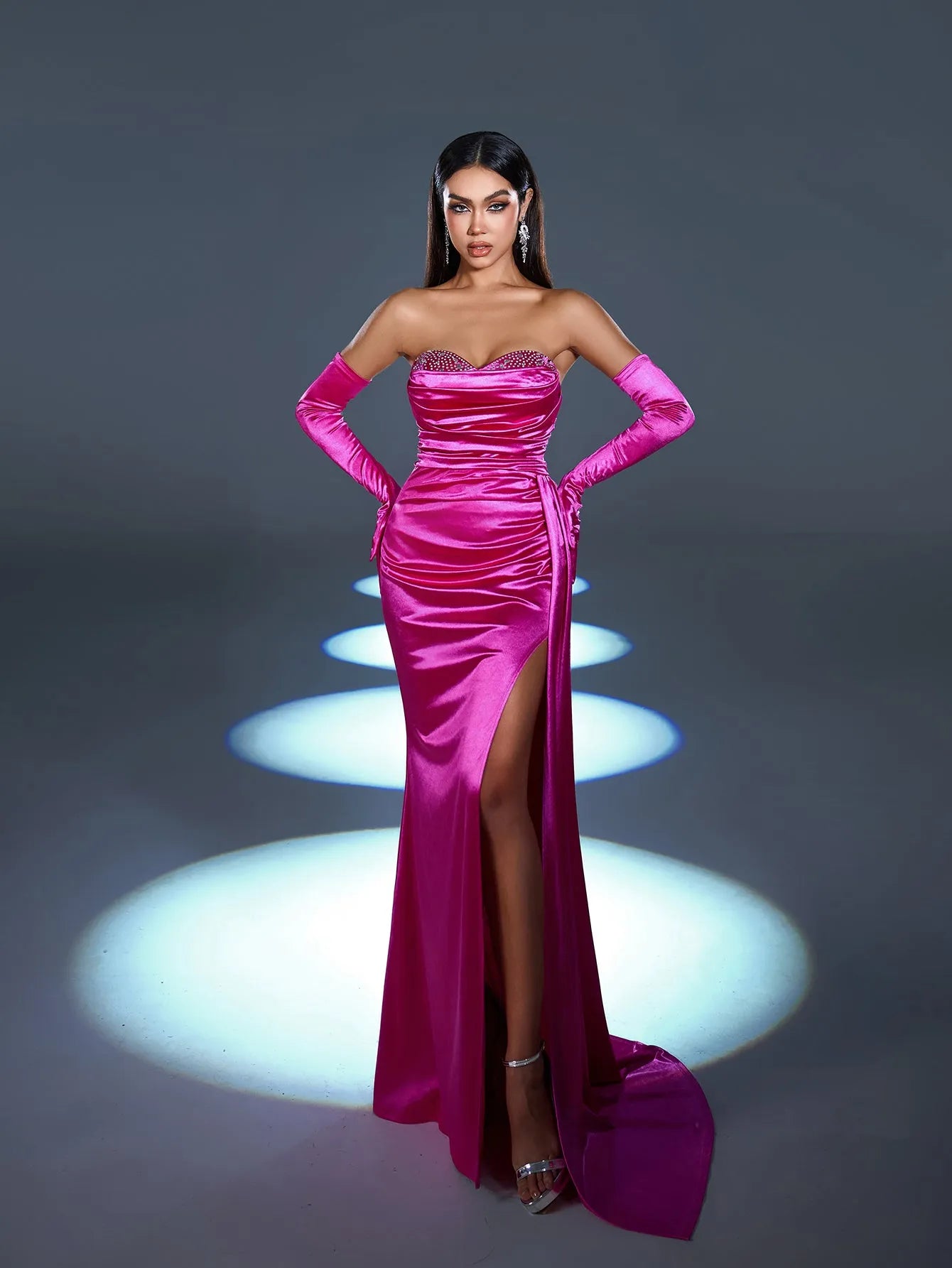 Step into luxury with our striking satin gown, designed to make a glamorous statement at any formal event. This gown features a sweetheart neckline with dazzling embellishments along the bodice, adding sparkle and sophistication. The fitted silhouette is accentuated with a high slit for a bold touch, while the dramatic satin draping adds movement and elegance. Complete with matching satin gloves, this ensemble is the epitome of classic Hollywood glamour.