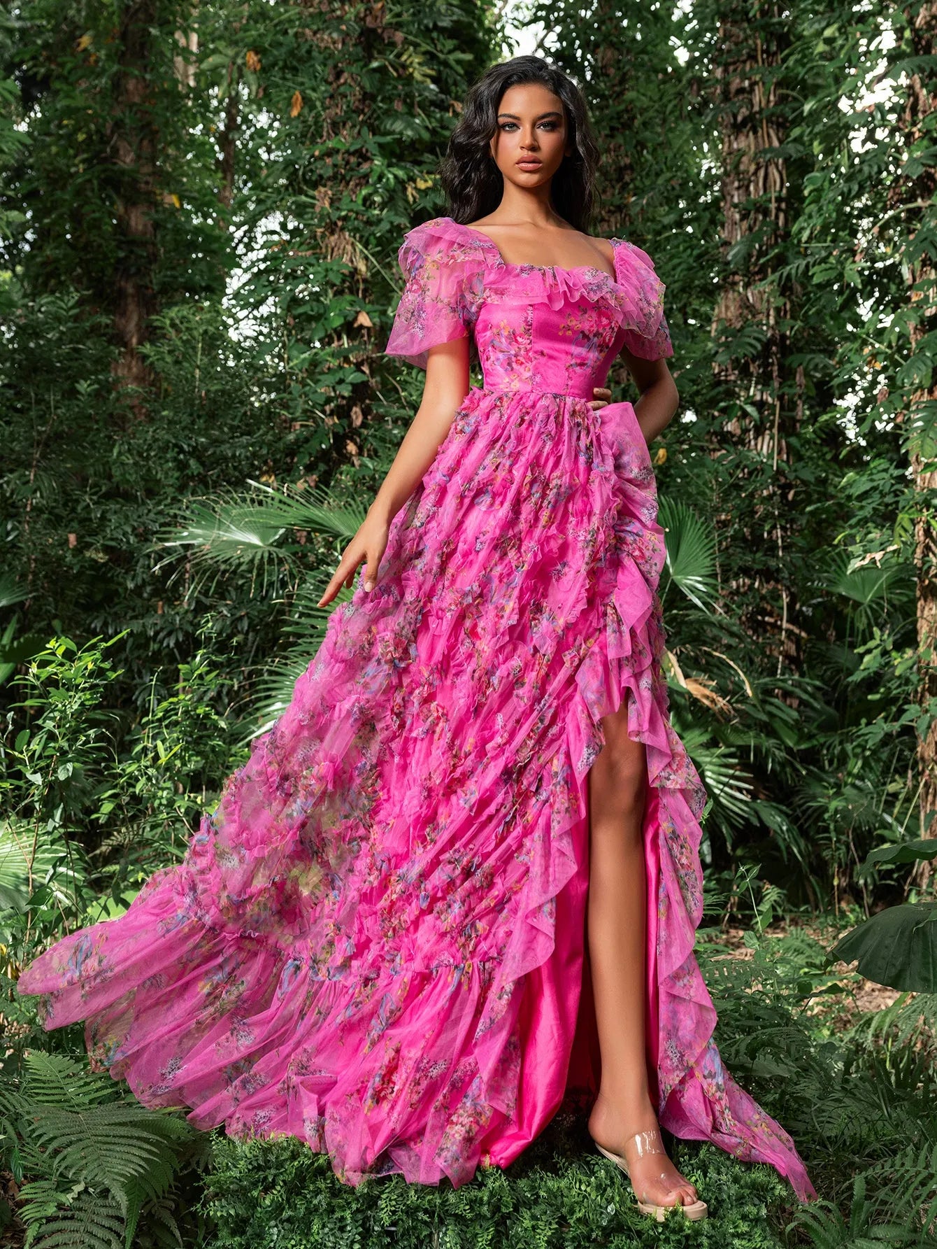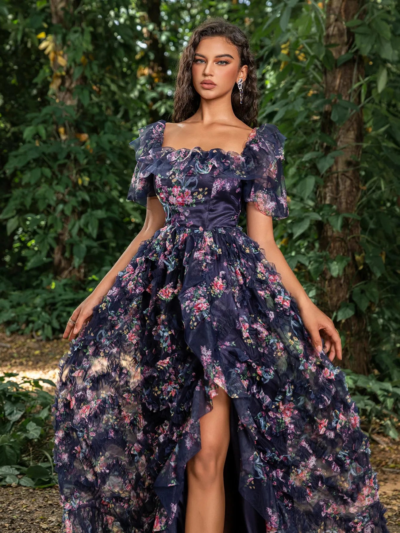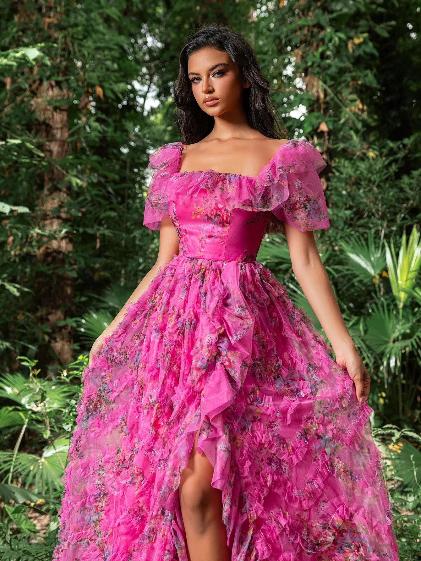 Turn every head at your next event with this captivating floral gown. This gown features a romantic square collar design with voluminous puff sleeves, ensuring you shine all night long. The fitted bodice, complemented by a lace-up back, accentuates your curves, while the flowing A-line skirt adds volume and movement, creating a stunning silhouette. The vibrant floral print adds a touch of whimsy and elegance. Perfect for formal events, evening galas, and special occasions, this gown guarantees you make a lasting impression.
