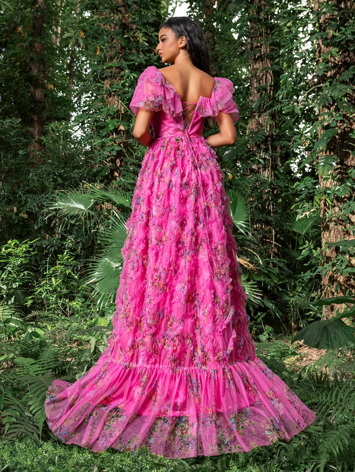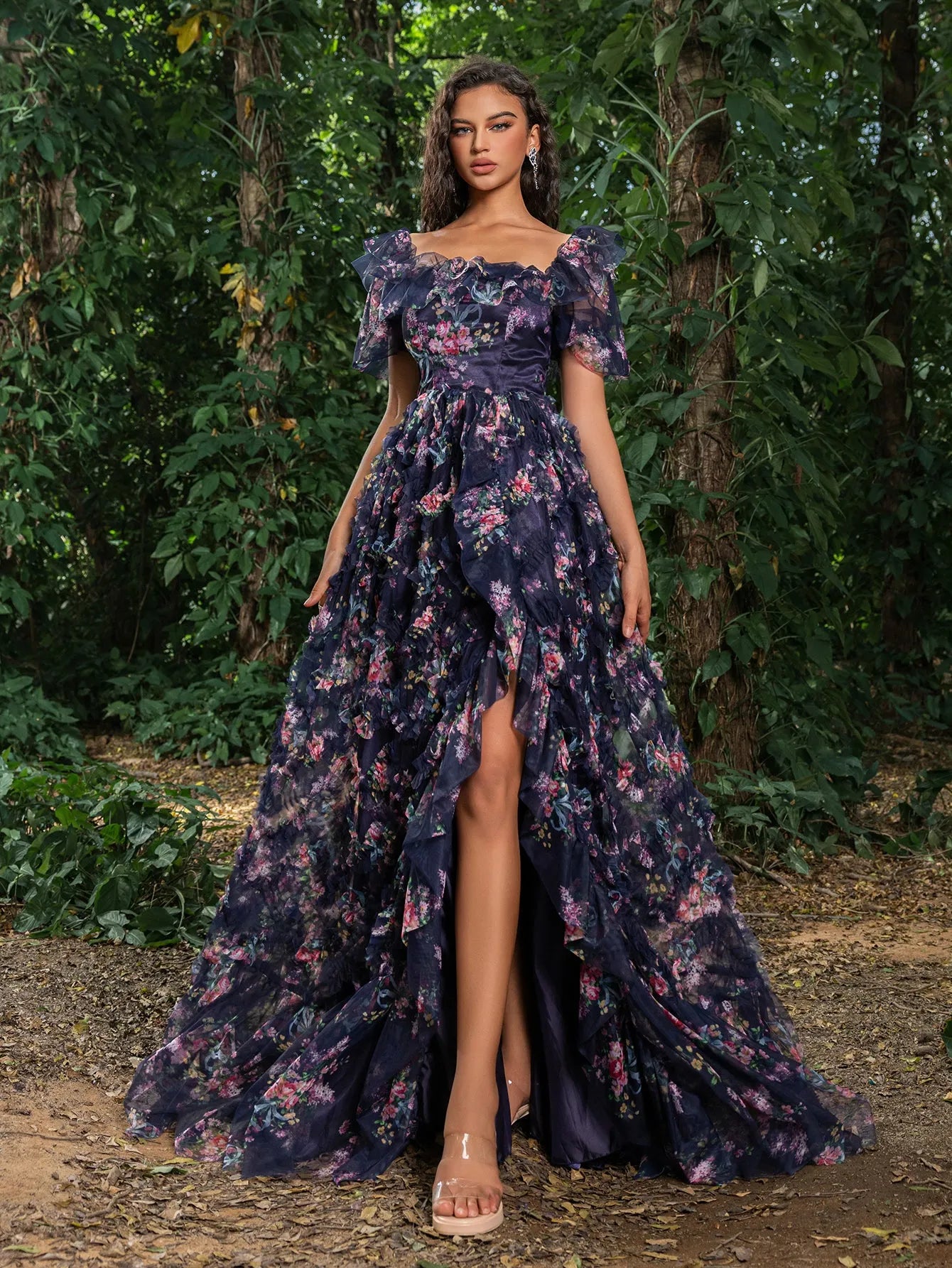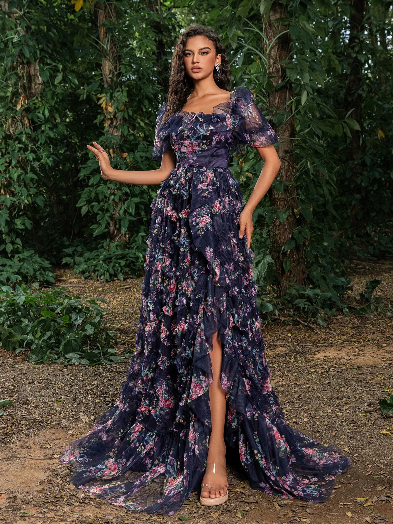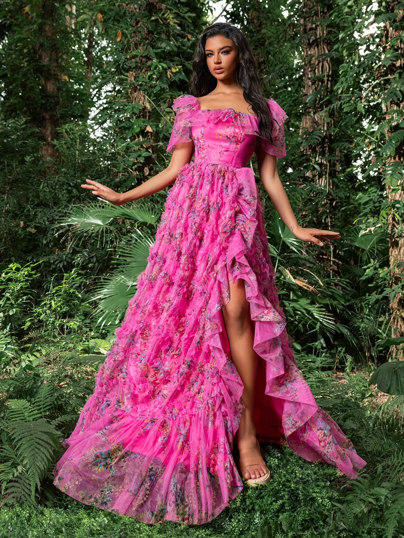 Turn every head at your next event with this captivating floral gown. This gown features a romantic square collar design with voluminous puff sleeves, ensuring you shine all night long. The fitted bodice, complemented by a lace-up back, accentuates your curves, while the flowing A-line skirt adds volume and movement, creating a stunning silhouette. The vibrant floral print adds a touch of whimsy and elegance. Perfect for formal events, evening galas, and special occasions, this gown guarantees you make a lasting impression.