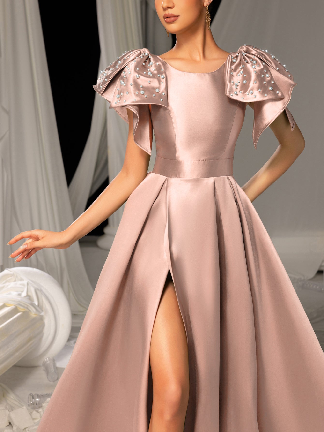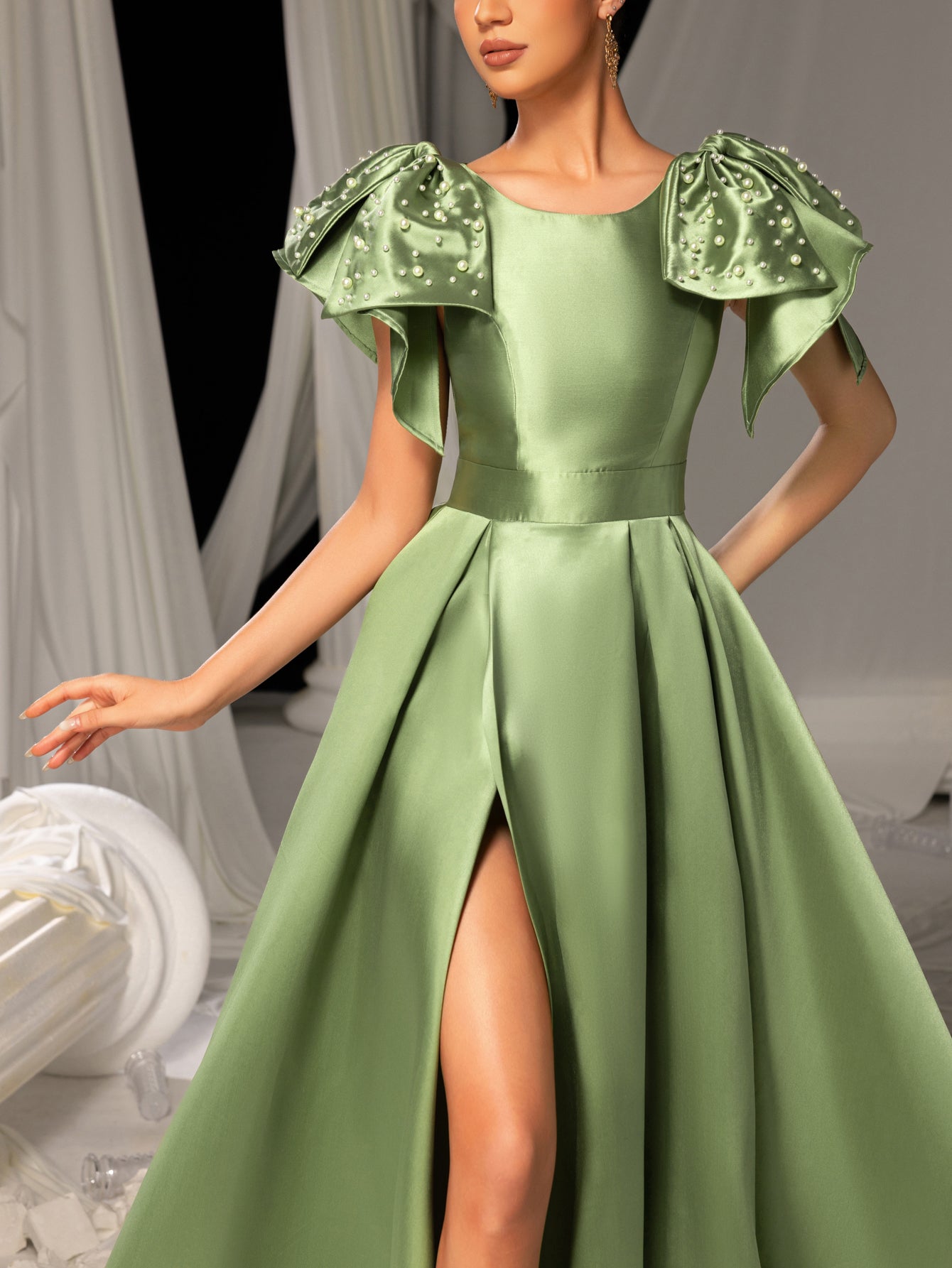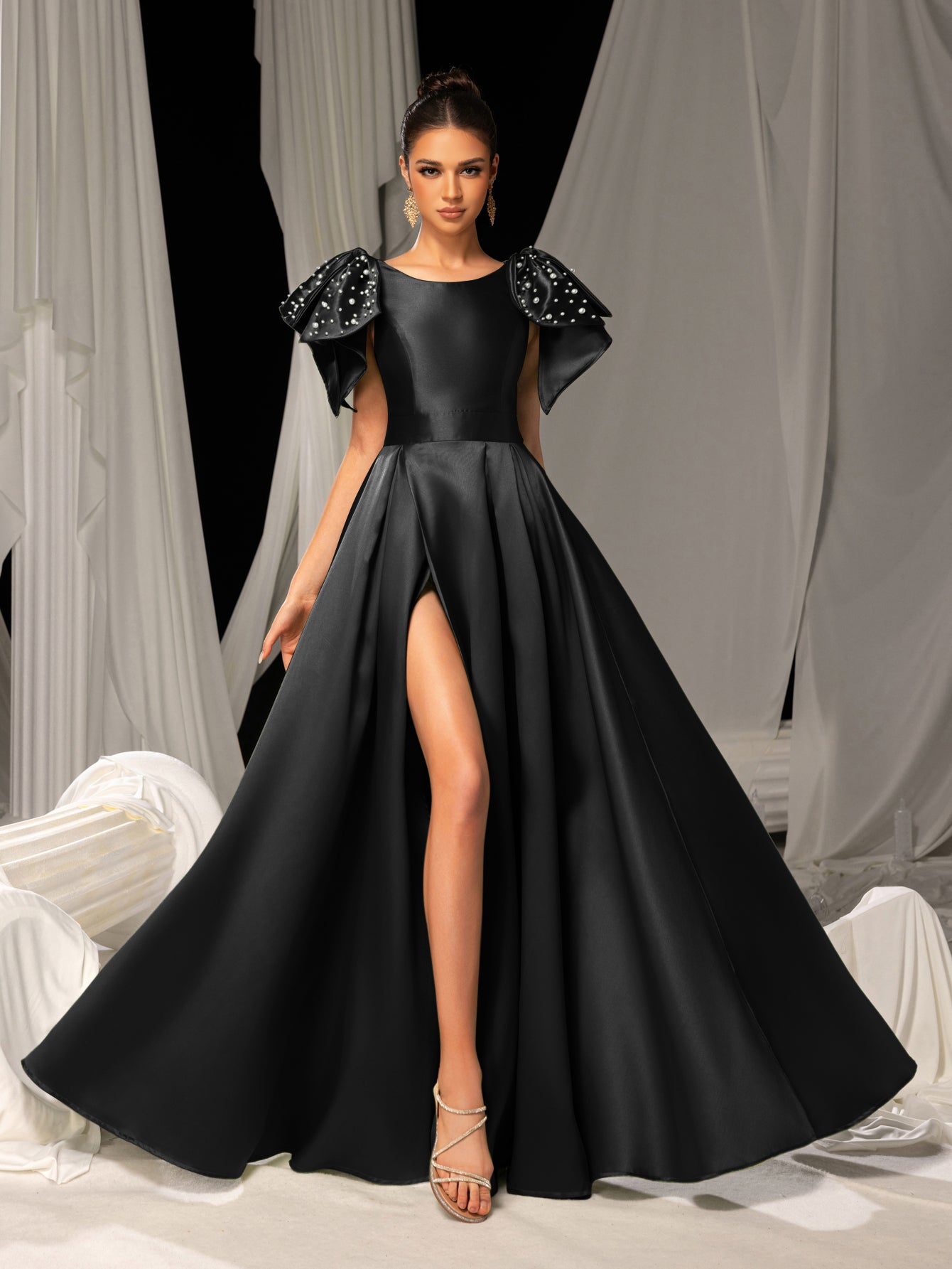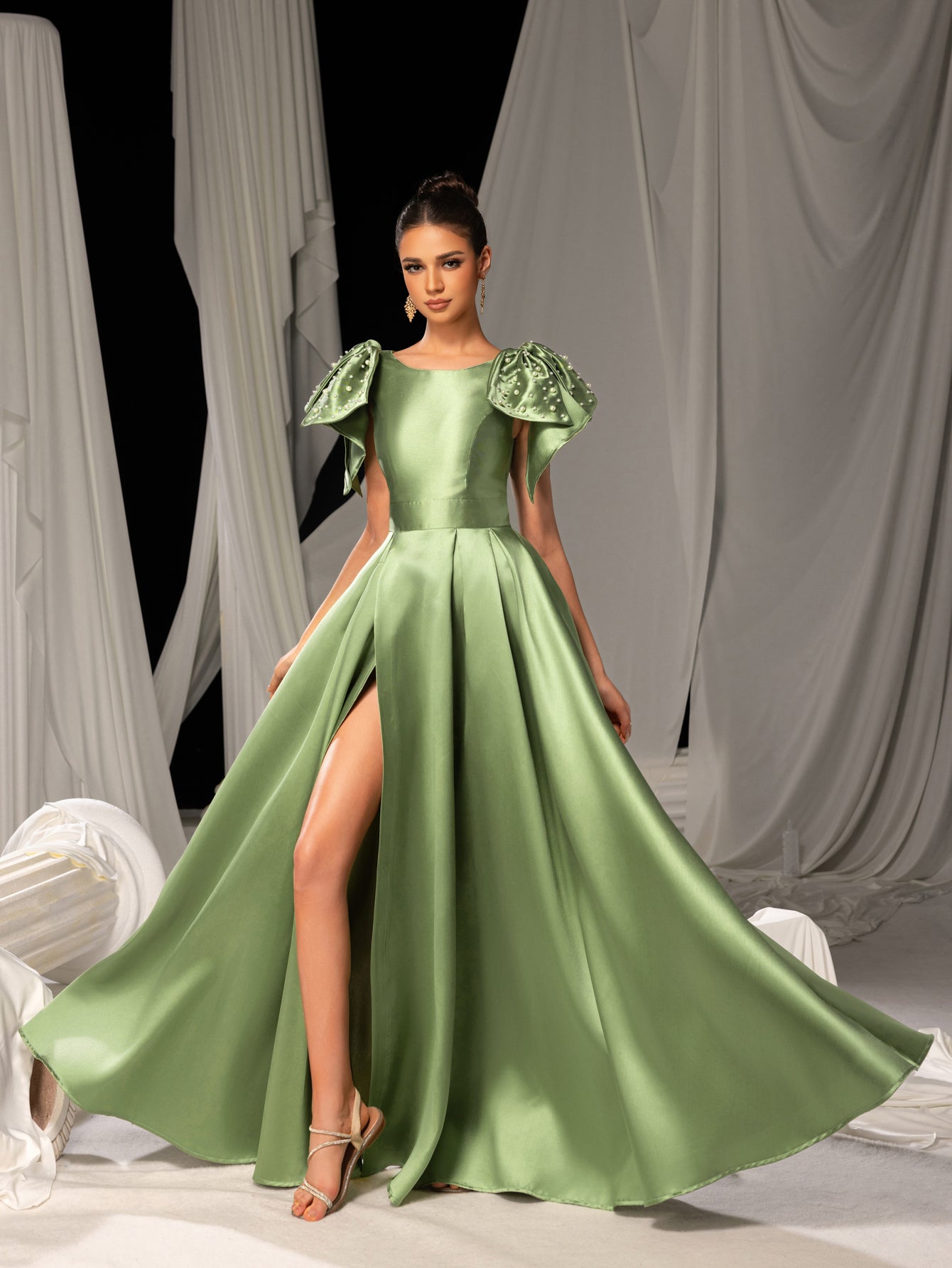 Elegant Satin Evening Gown with Bow Shoulder & Dramatic High Slit – Luxurious Evening Wear for Red Carpet, Formal Galas & Wedding Receptions