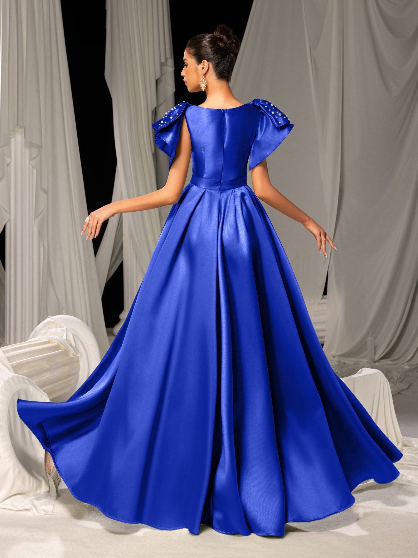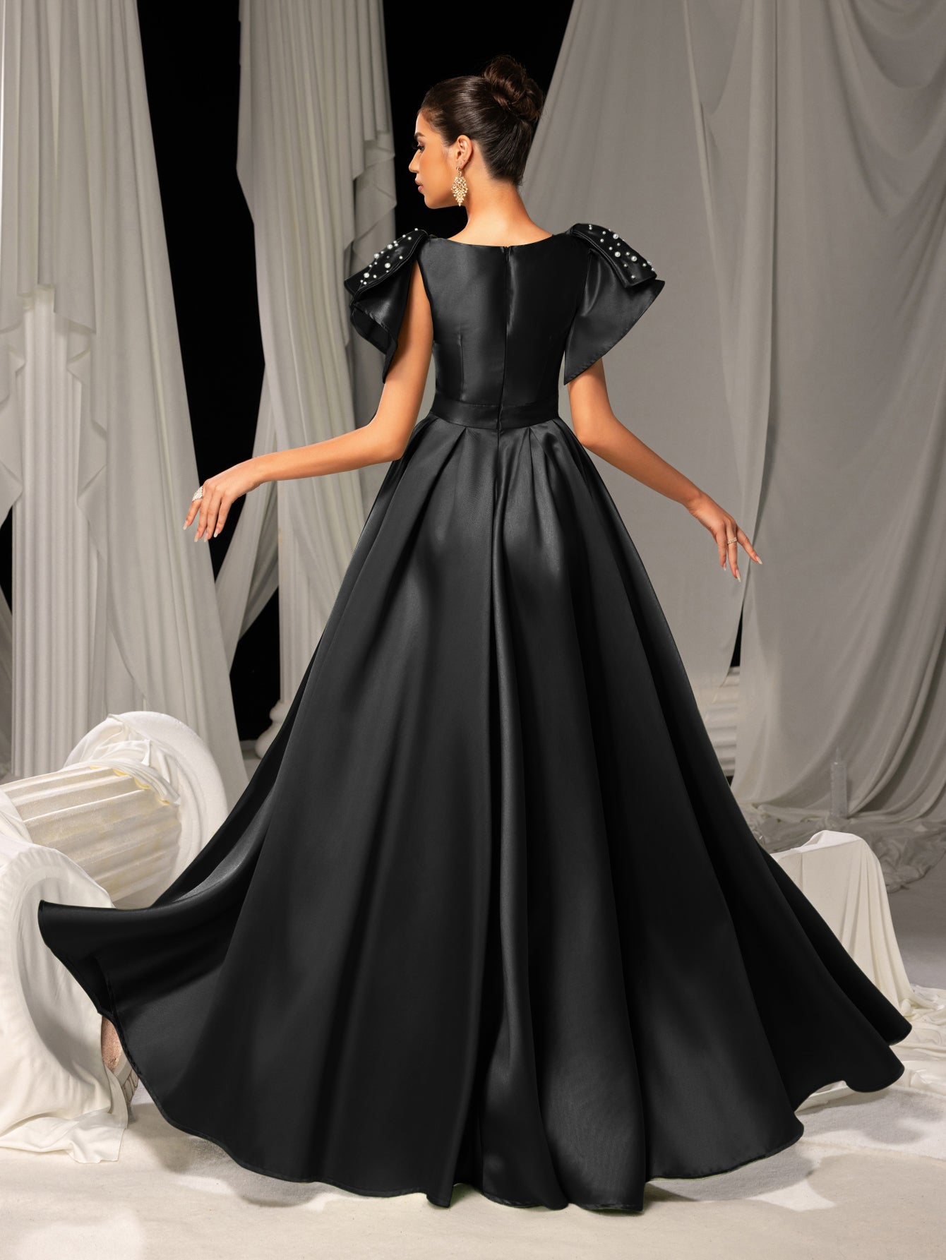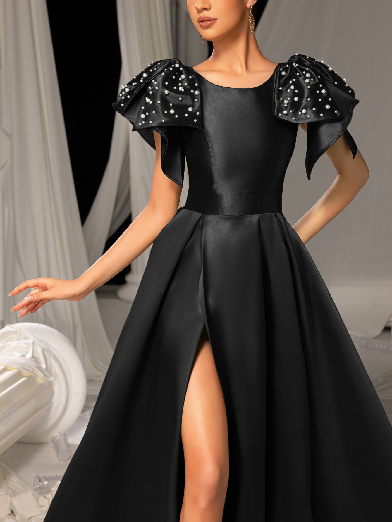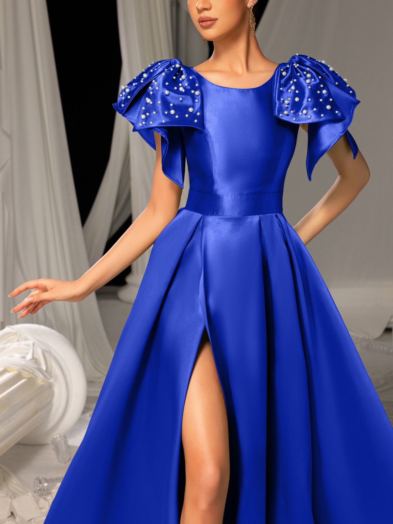Elegant Satin Evening Gown with Bow Shoulder & Dramatic High Slit – Luxurious Evening Wear for Red Carpet, Formal Galas & Wedding Receptions