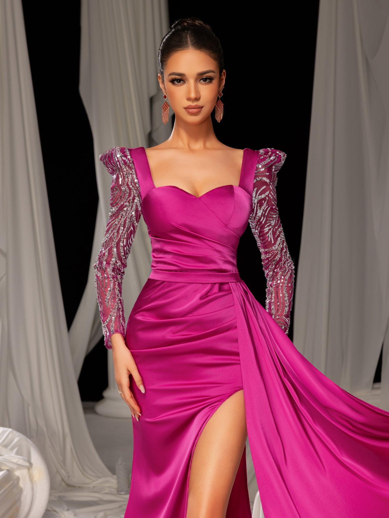 ✨ Background Harmony: Soft, flowing neutral-toned drapes create a sophisticated contrast with the vibrant hue, enhancing the gown’s visual impact for professional photography or red-carpet moments.