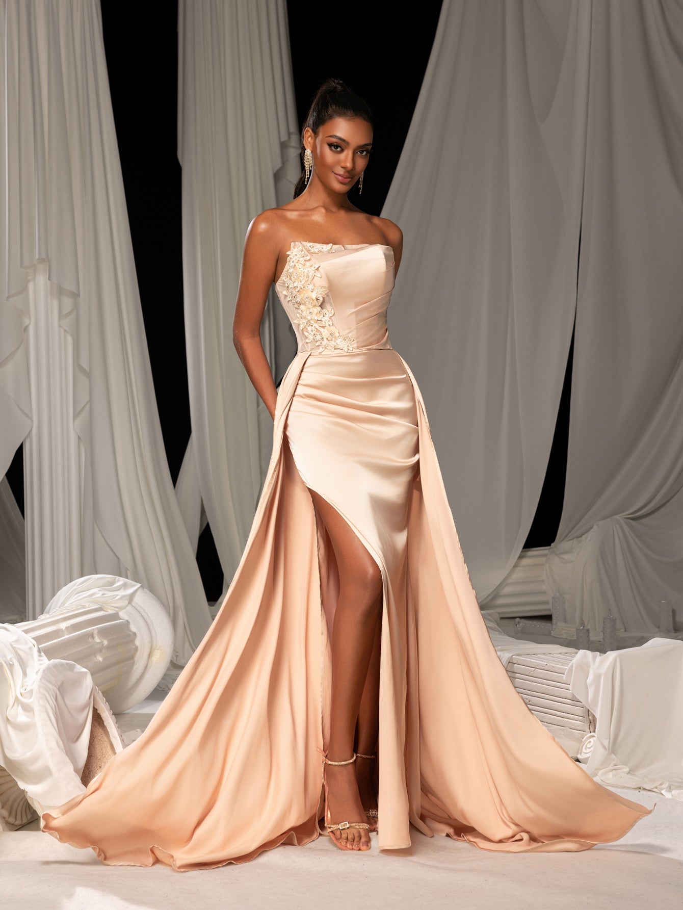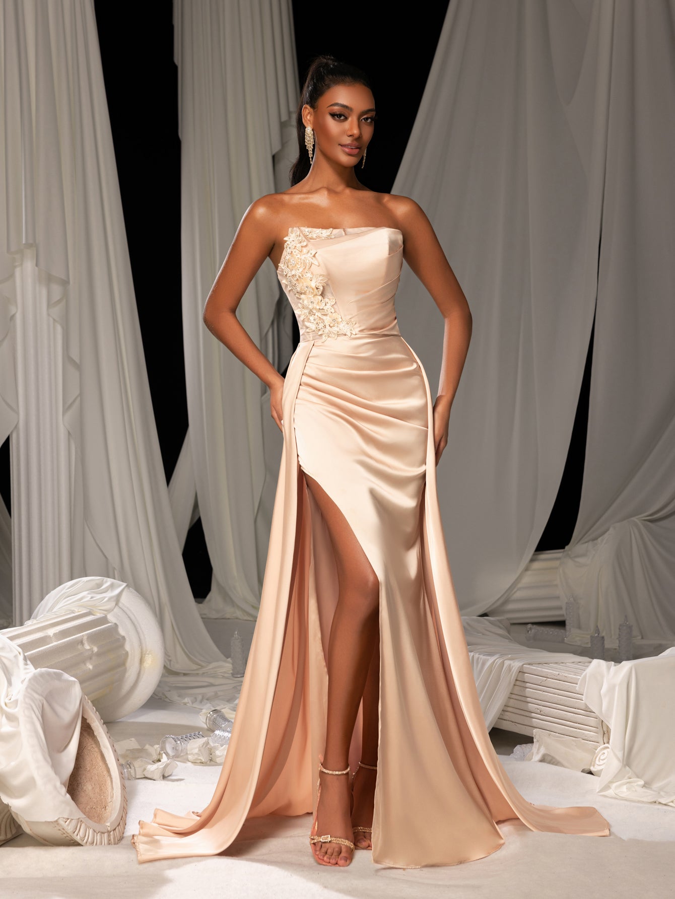 Elegant Satin Strapless Evening Gown with Lace Appliqué | High Slit & Sweep Train