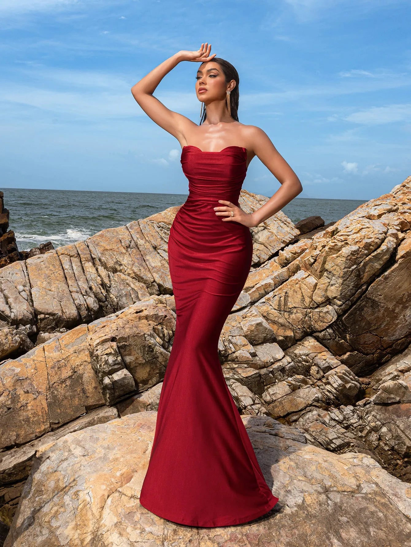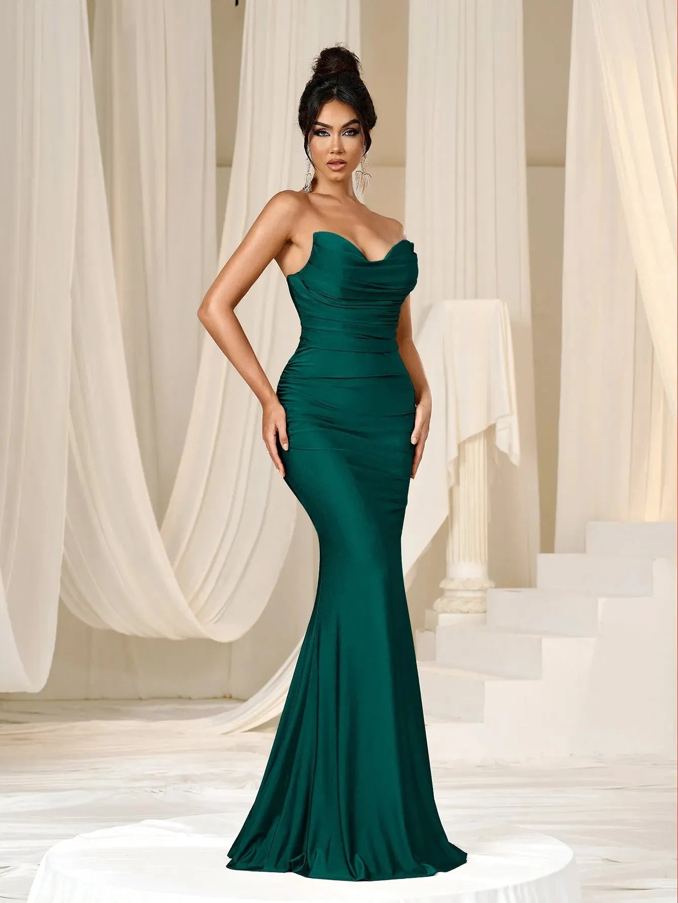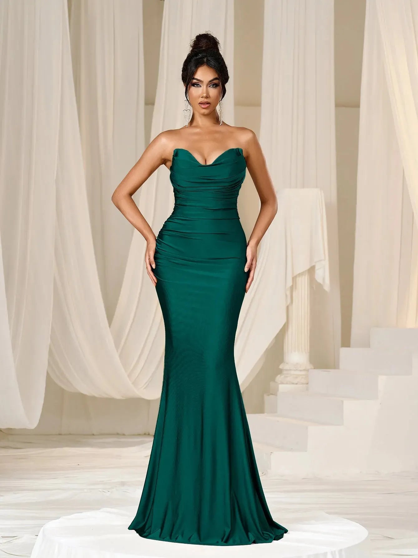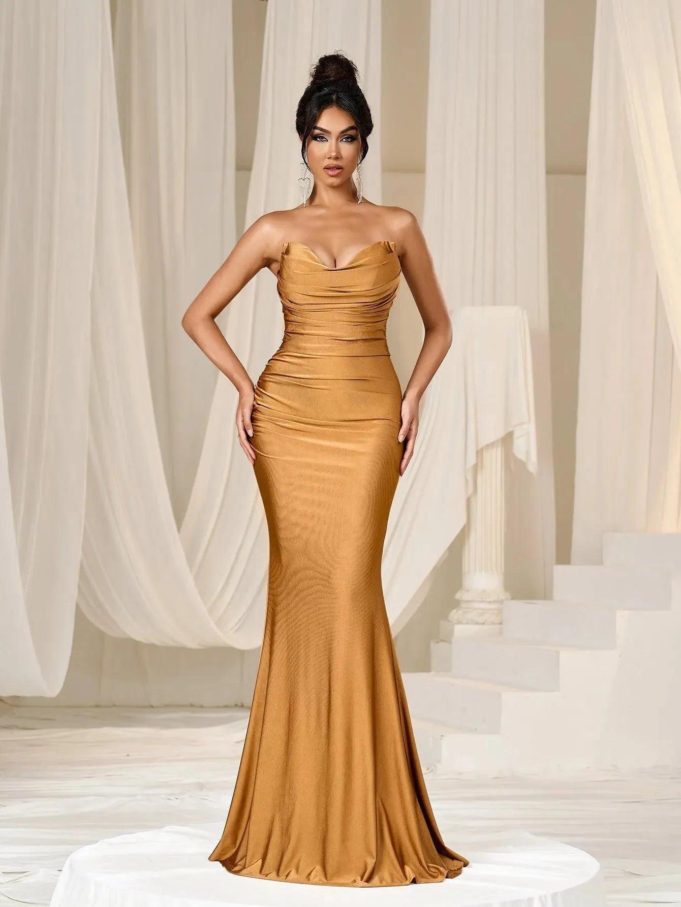 Step into luxury with our exquisite strapless gown. This stunning dress features a beautifully ruched bodice that enhances your figure, while the fitted silhouette cascades into a graceful mermaid skirt. The sweetheart neckline adds a touch of romance, and the strapless design ensures an elegant, timeless look. The back is secured with a discreet zipper for a seamless finish.