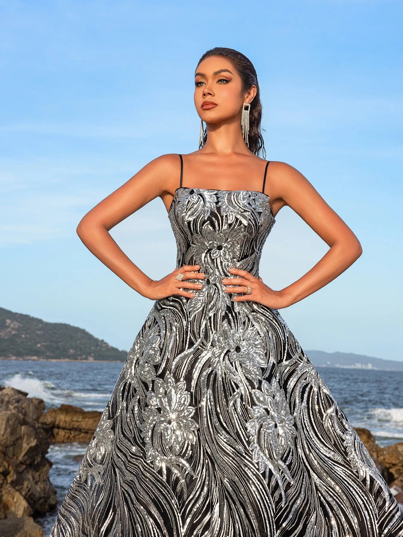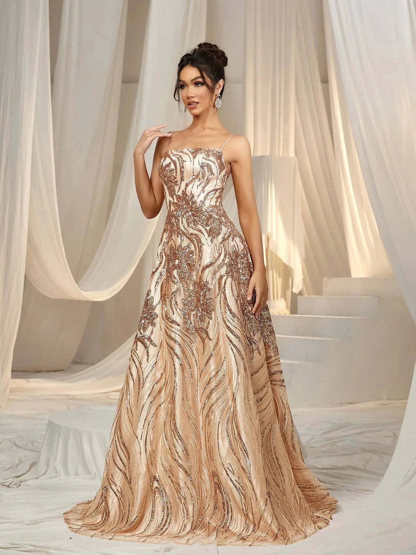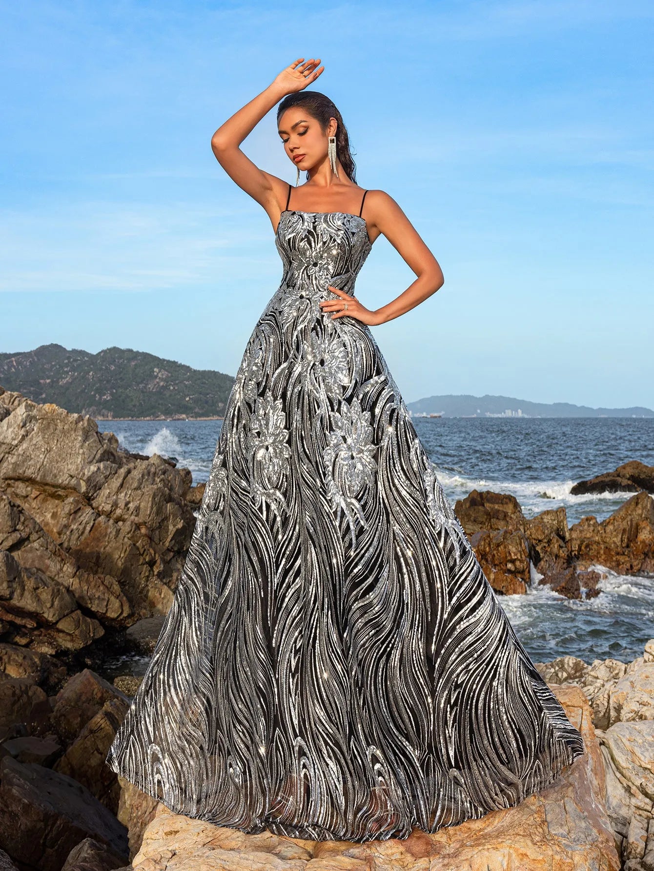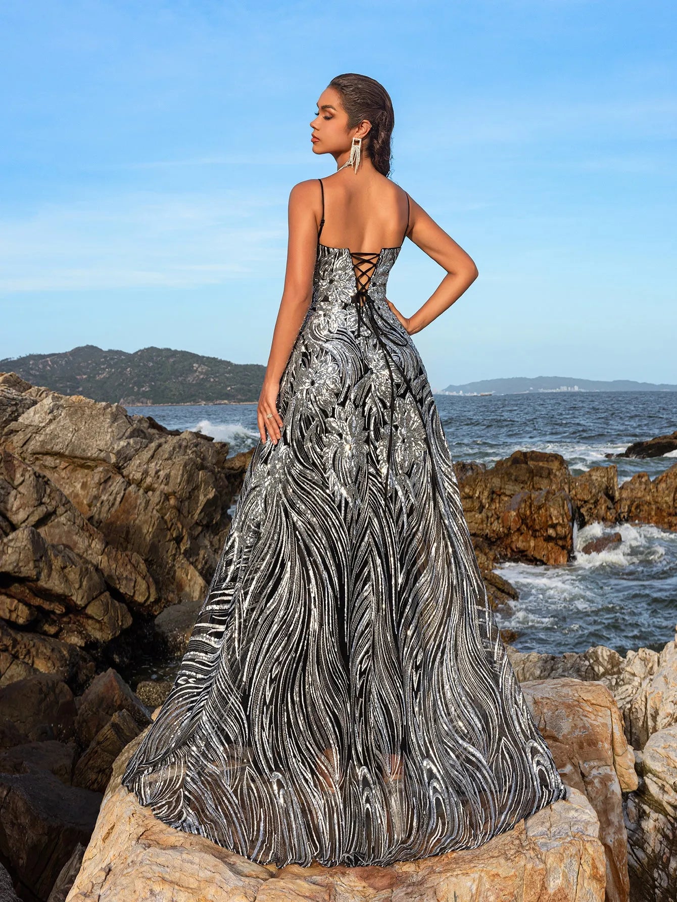 Step into the spotlight with our elegant evening gown, embellished with intricate sequin patterns. The shimmering design creates a stunning visual effect, perfect for making a grand entrance. This gown features delicate spaghetti straps and a fitted bodice that flows into a beautifully flared skirt. The lace-up back detail adds a touch of romance and ensures a perfect fit.