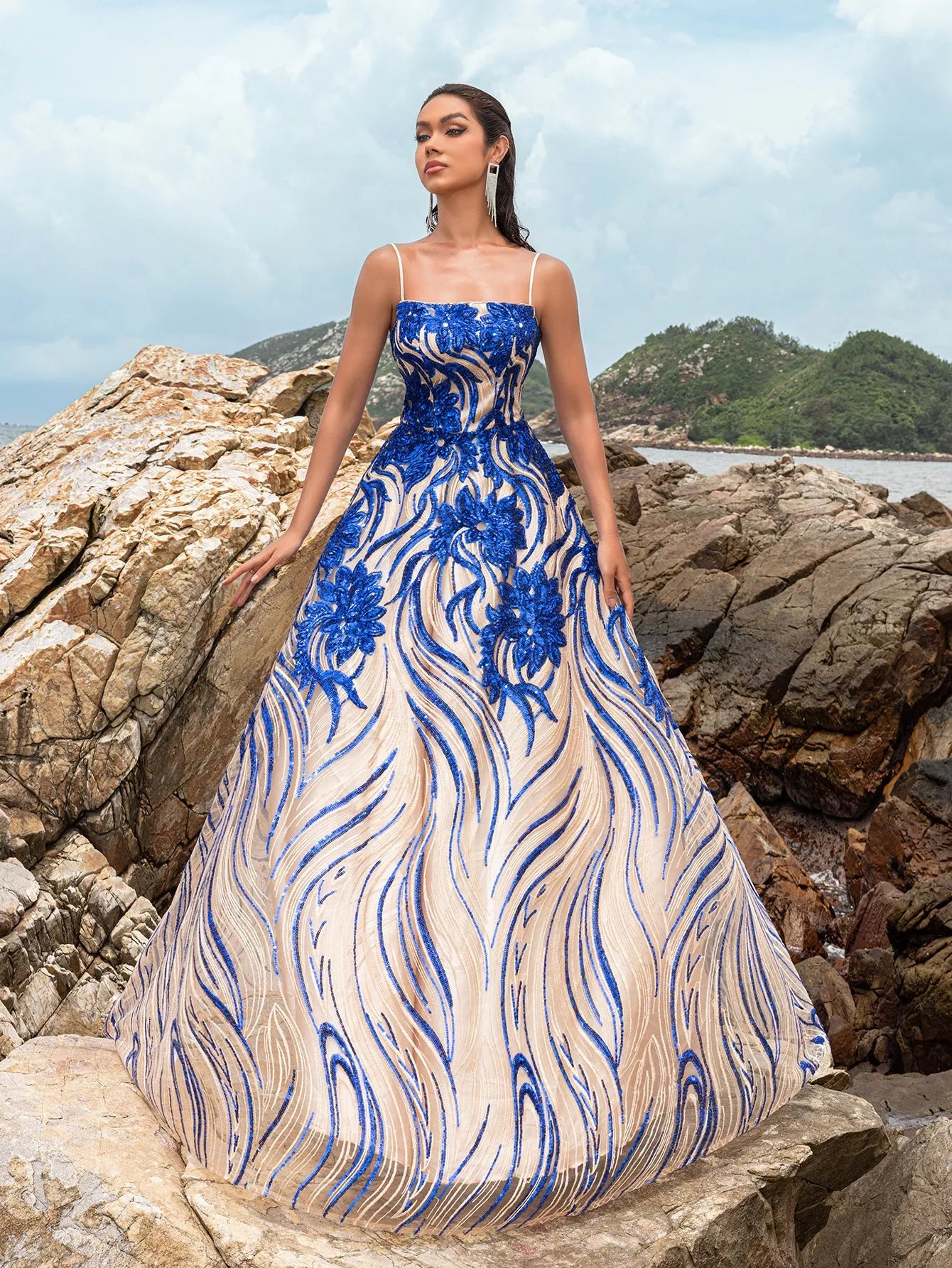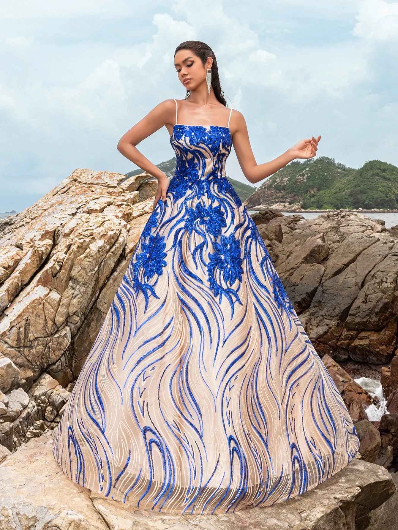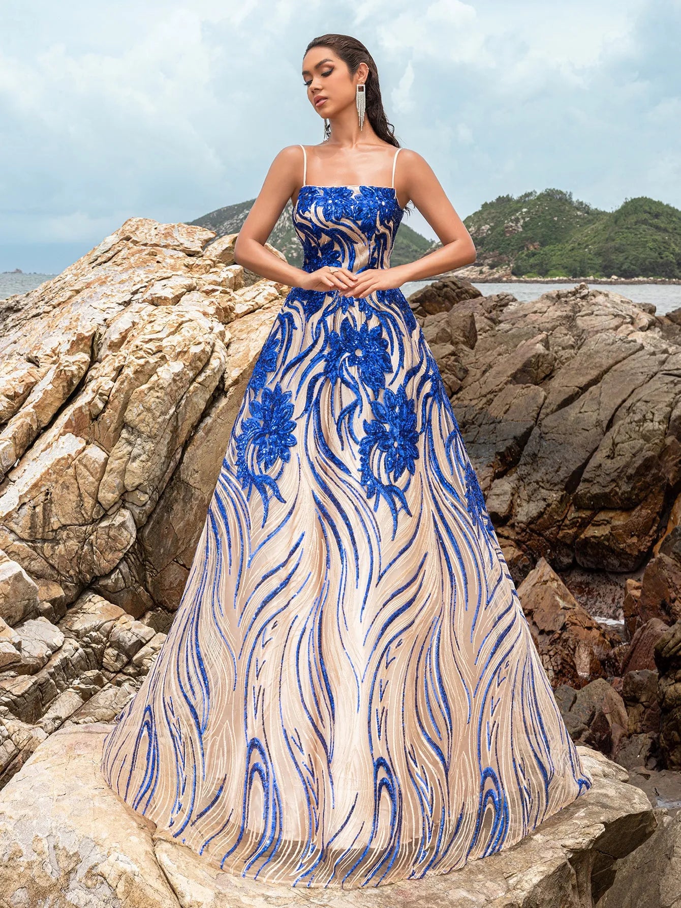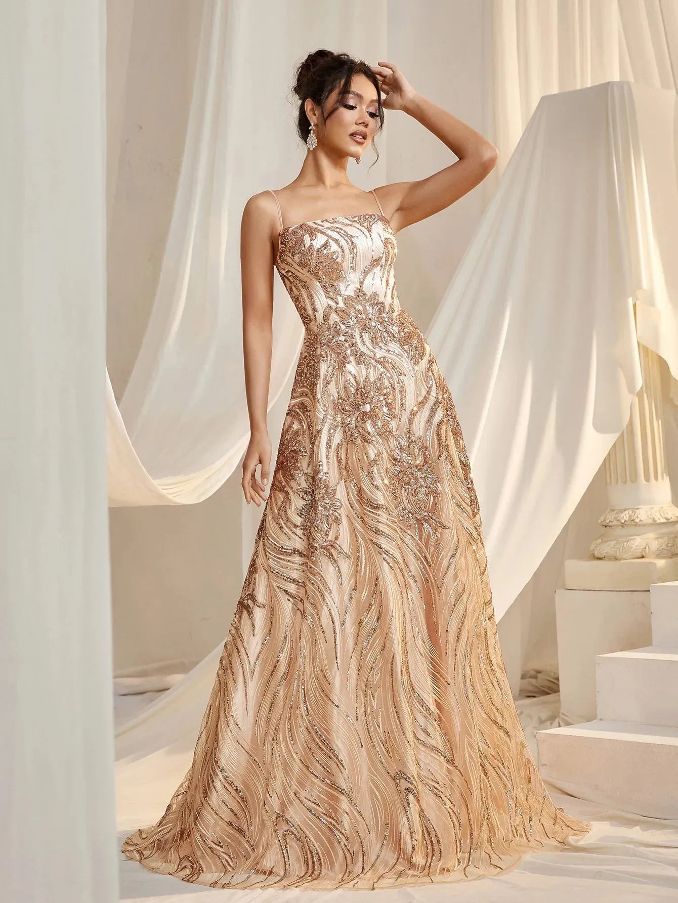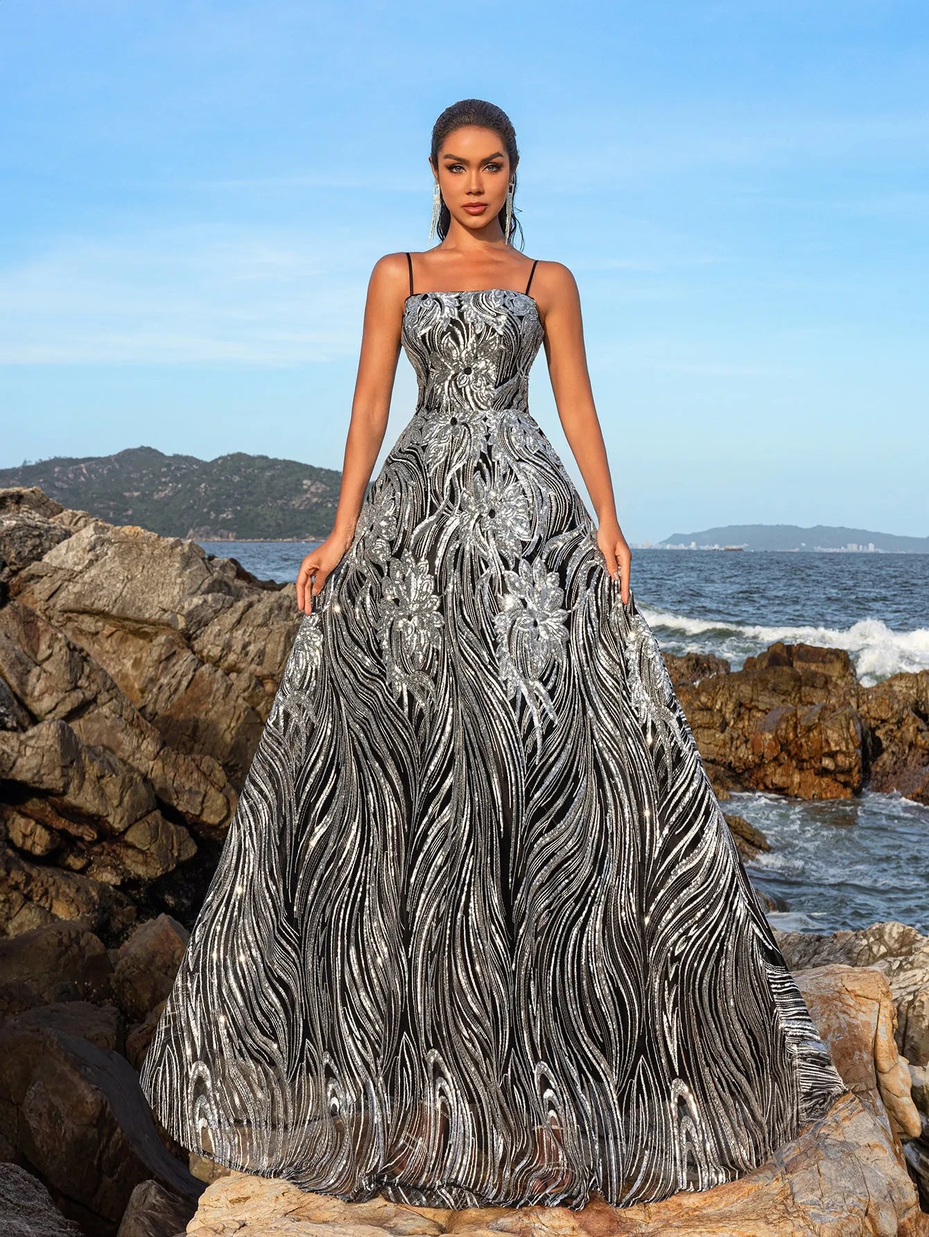 Step into the spotlight with our elegant evening gown, embellished with intricate sequin patterns. The shimmering design creates a stunning visual effect, perfect for making a grand entrance. This gown features delicate spaghetti straps and a fitted bodice that flows into a beautifully flared skirt. The lace-up back detail adds a touch of romance and ensures a perfect fit.