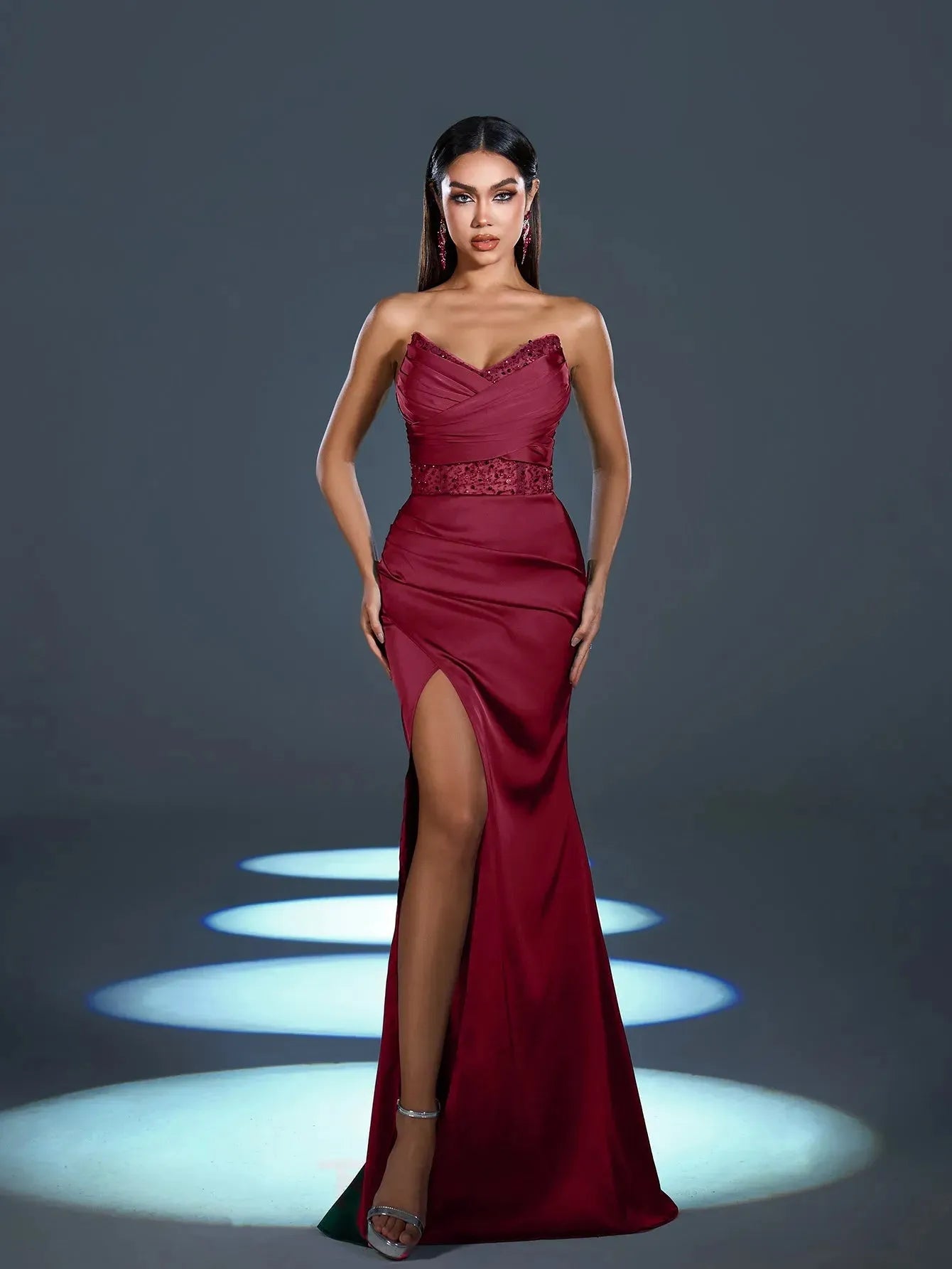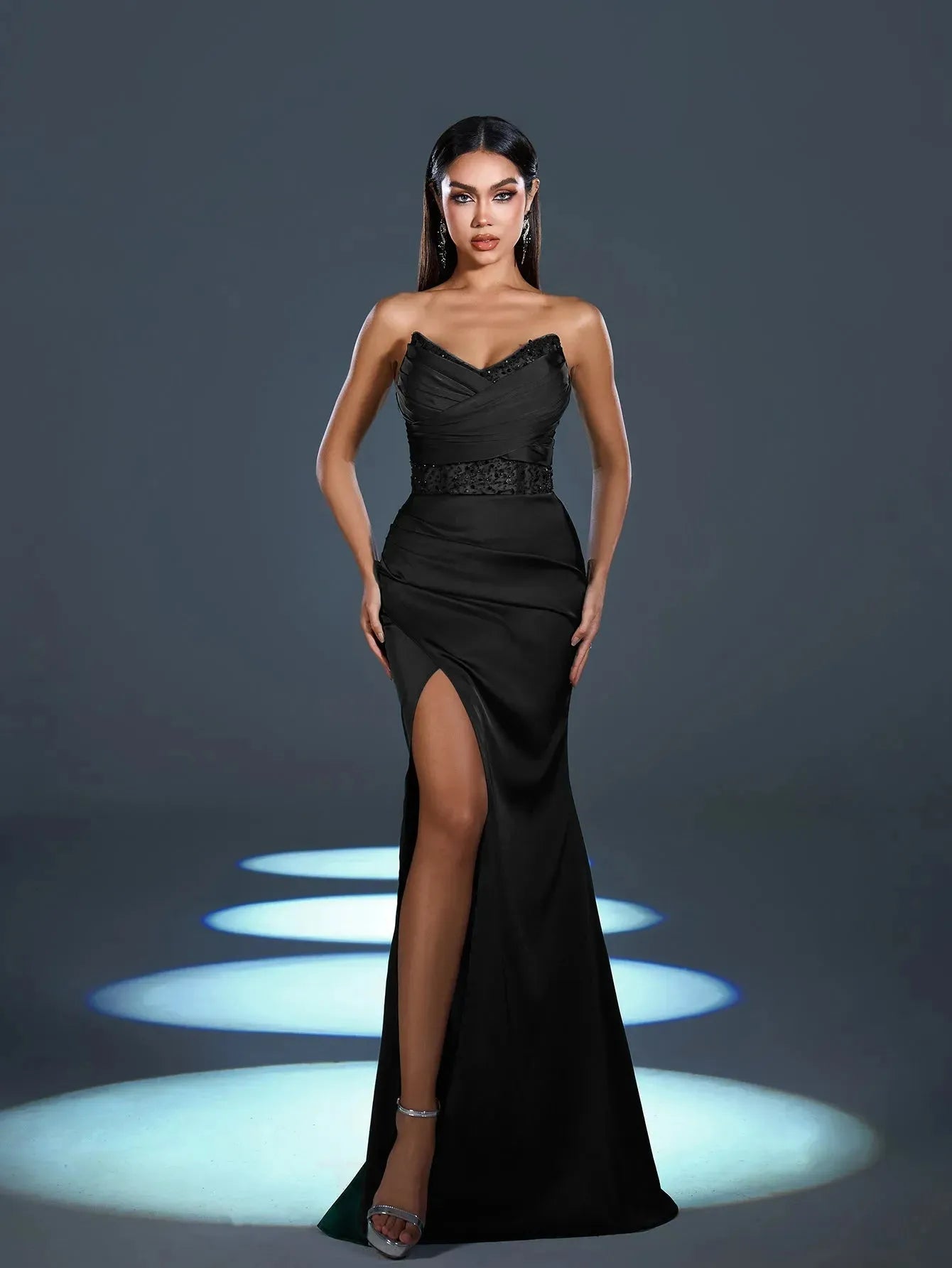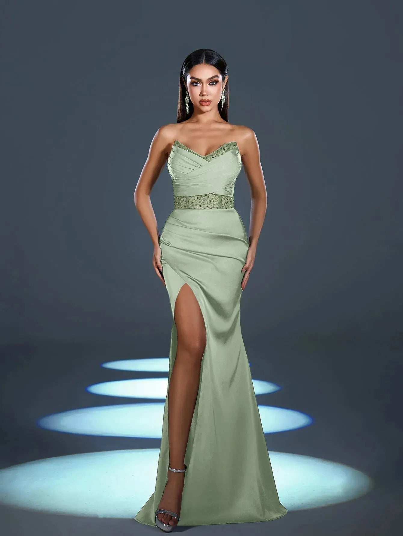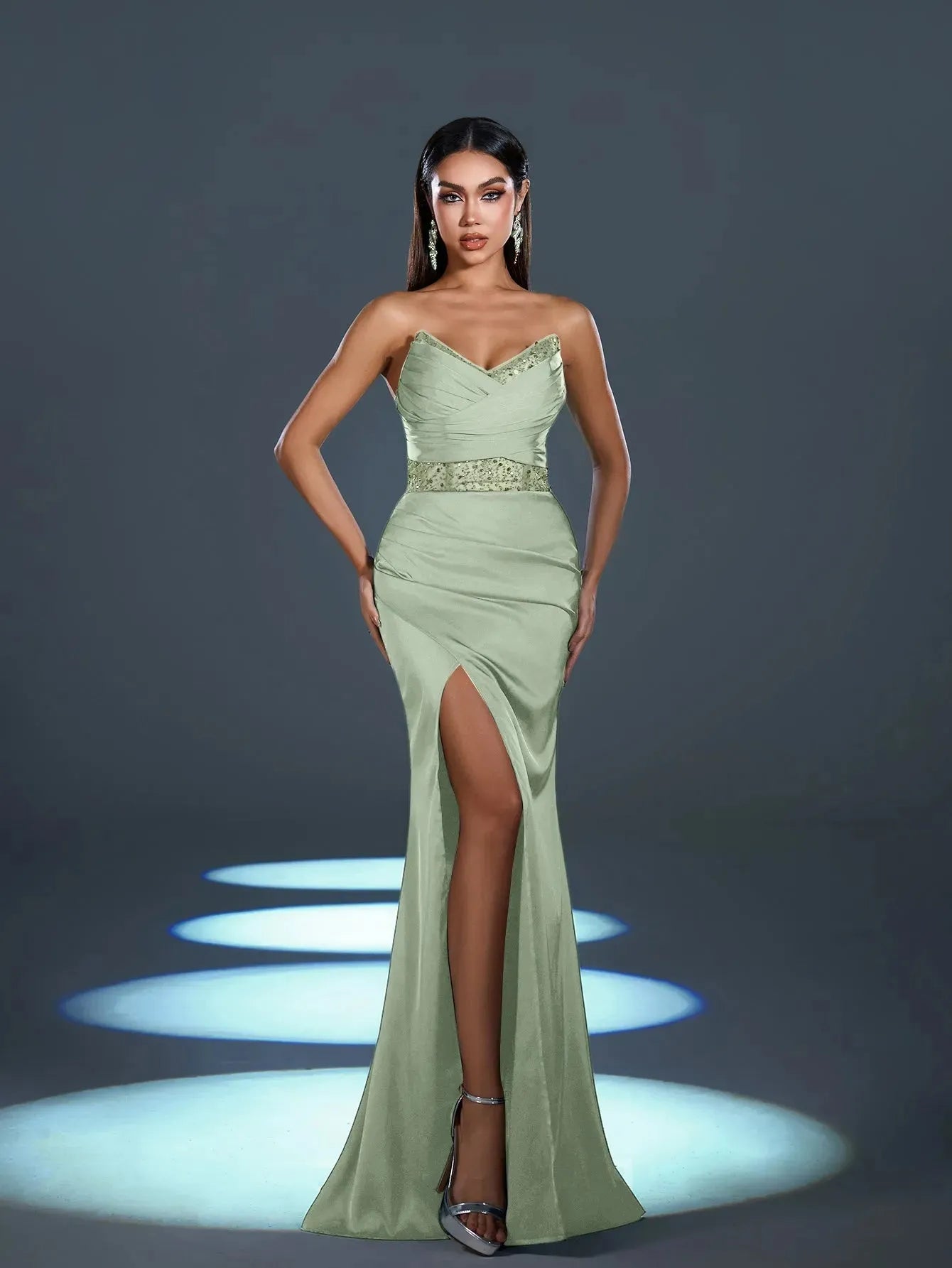 Experience elegance with our exquisite satin gown. This captivating dress features a fitted silhouette that beautifully contours your figure, while the high slit adds a touch of allure. The sweetheart neckline and ruched bodice create a sophisticated look, complemented by the intricate detailing at the waist. The lace-up back ensures a perfect fit, making you feel confident and glamorous.