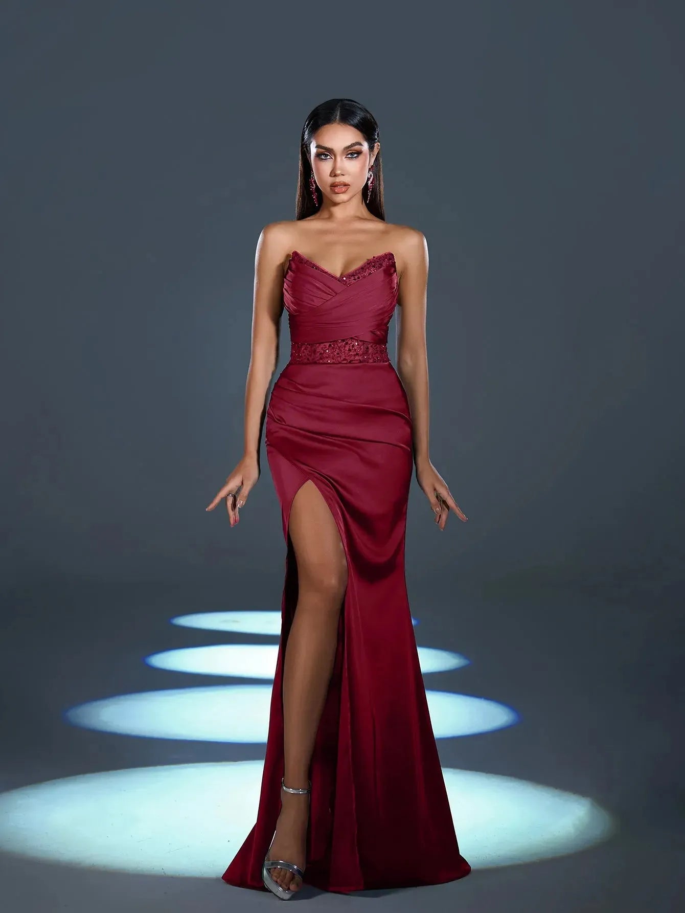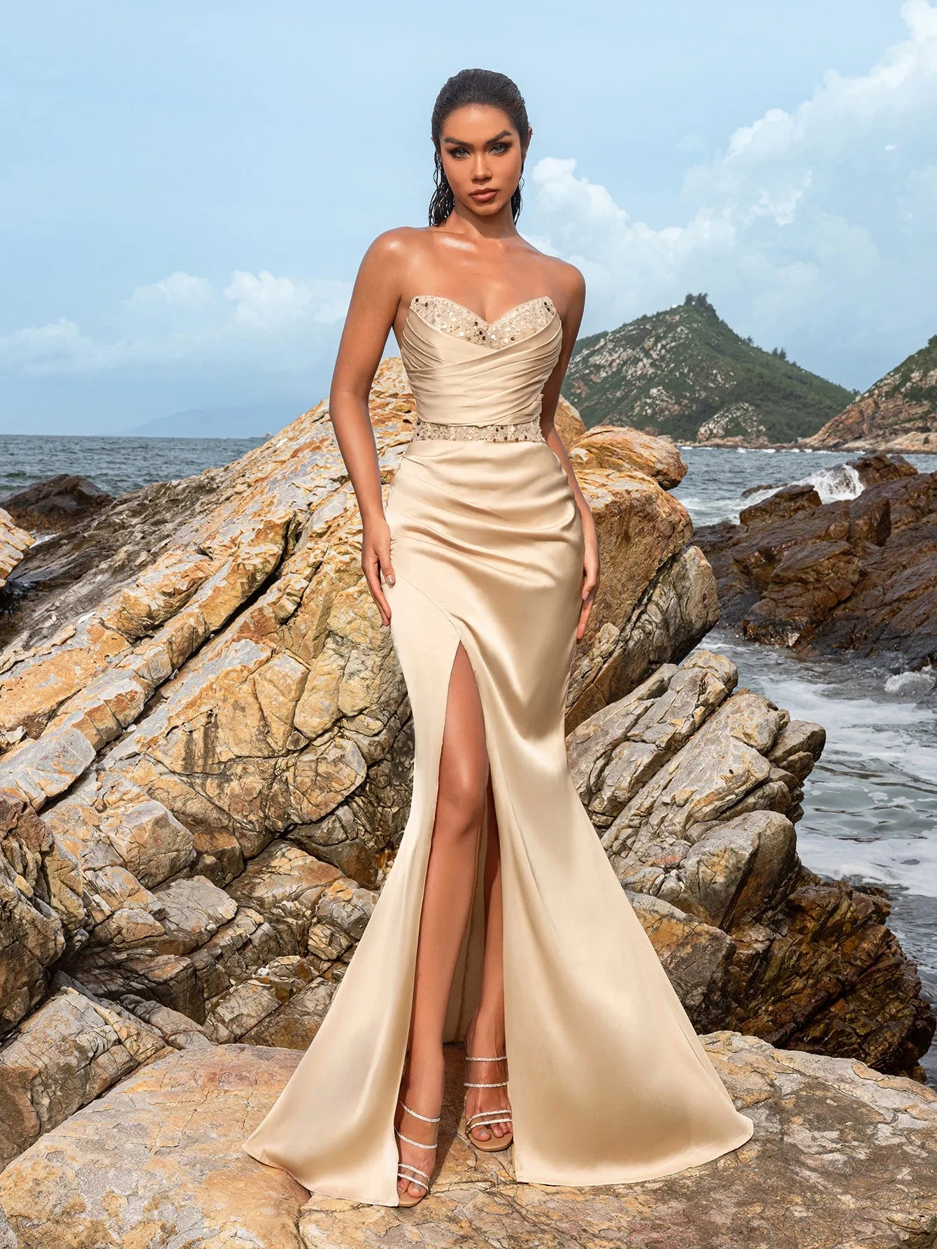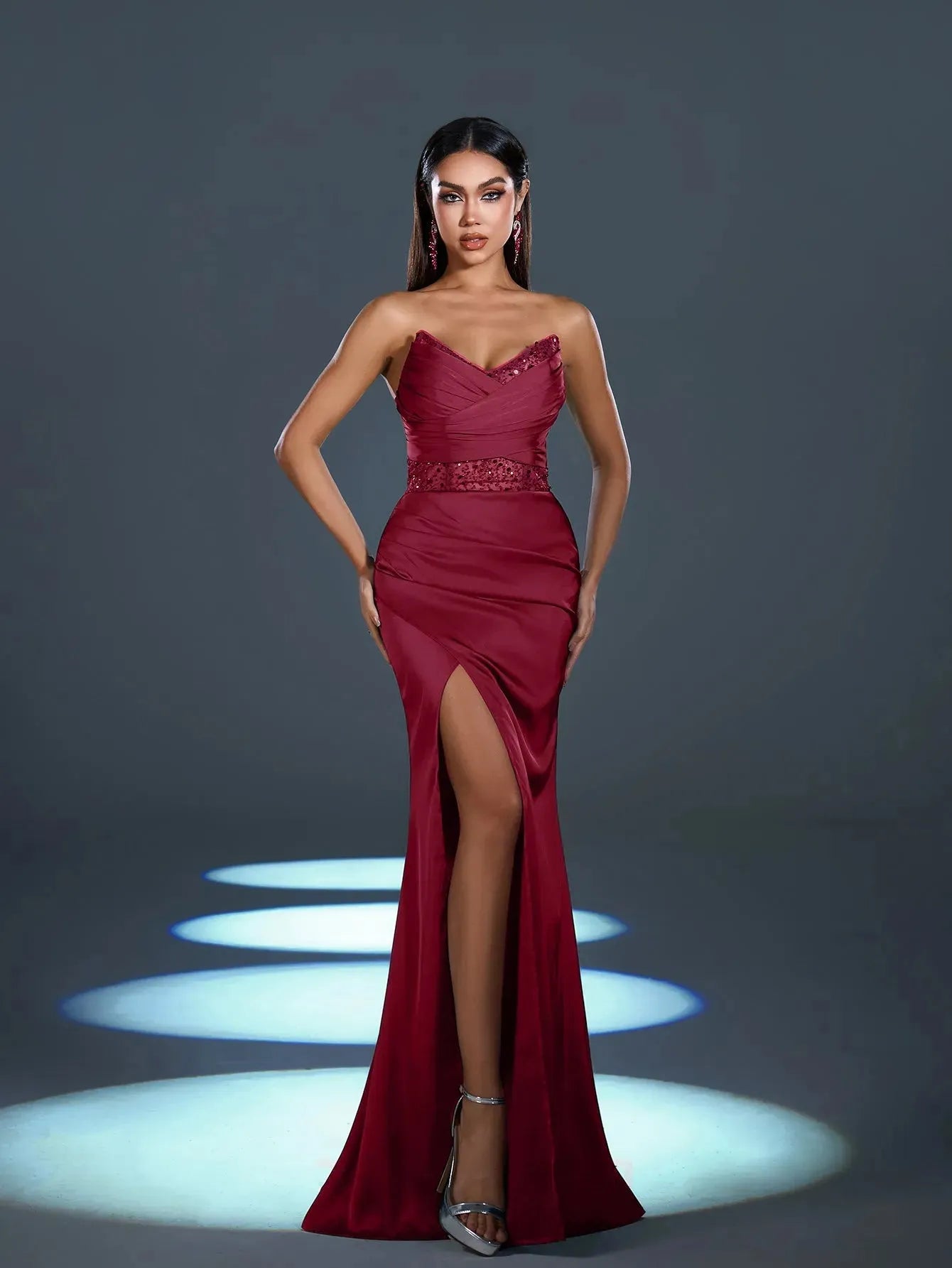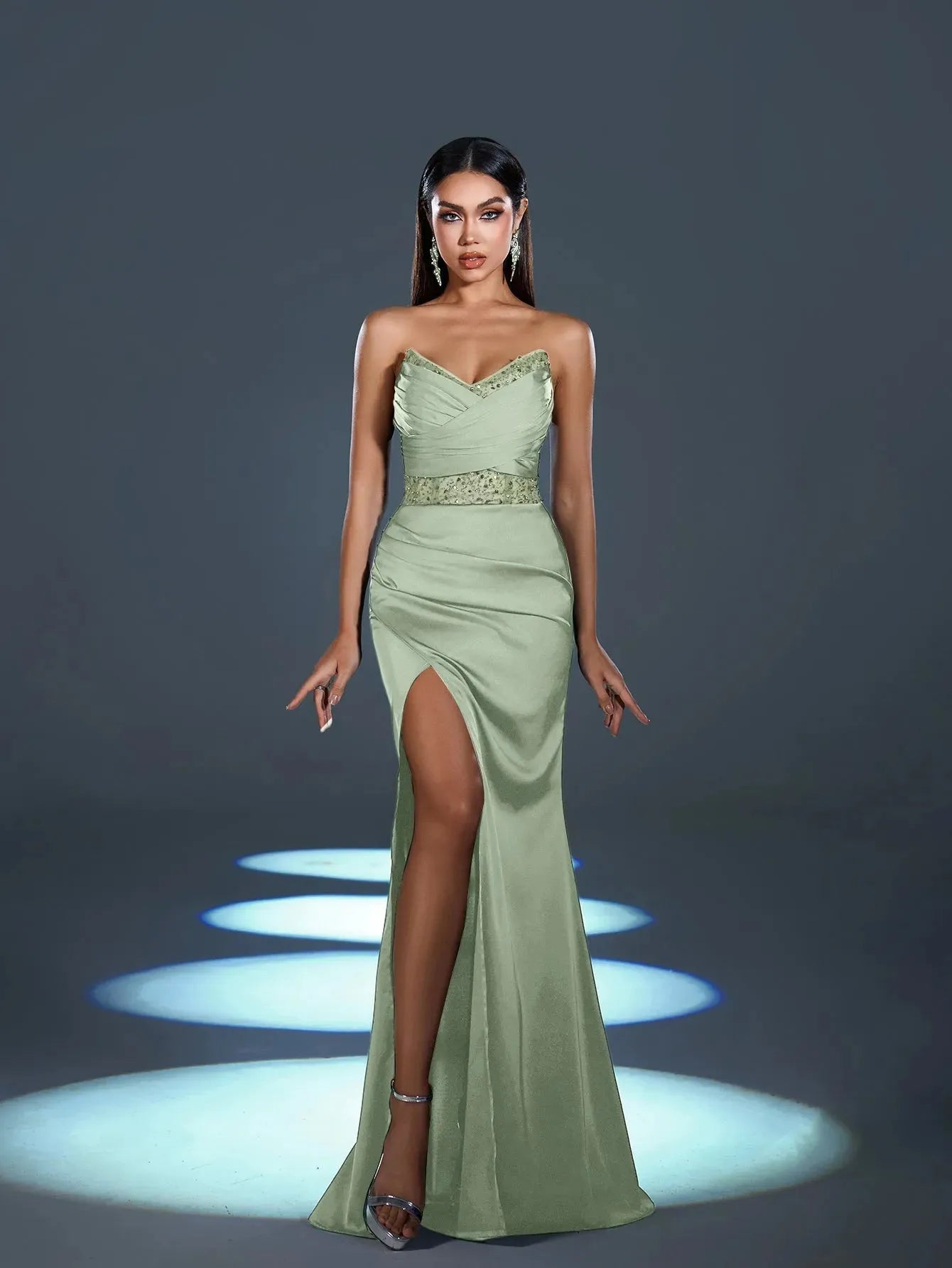 Experience elegance with our exquisite satin gown. This captivating dress features a fitted silhouette that beautifully contours your figure, while the high slit adds a touch of allure. The sweetheart neckline and ruched bodice create a sophisticated look, complemented by the intricate detailing at the waist. The lace-up back ensures a perfect fit, making you feel confident and glamorous.