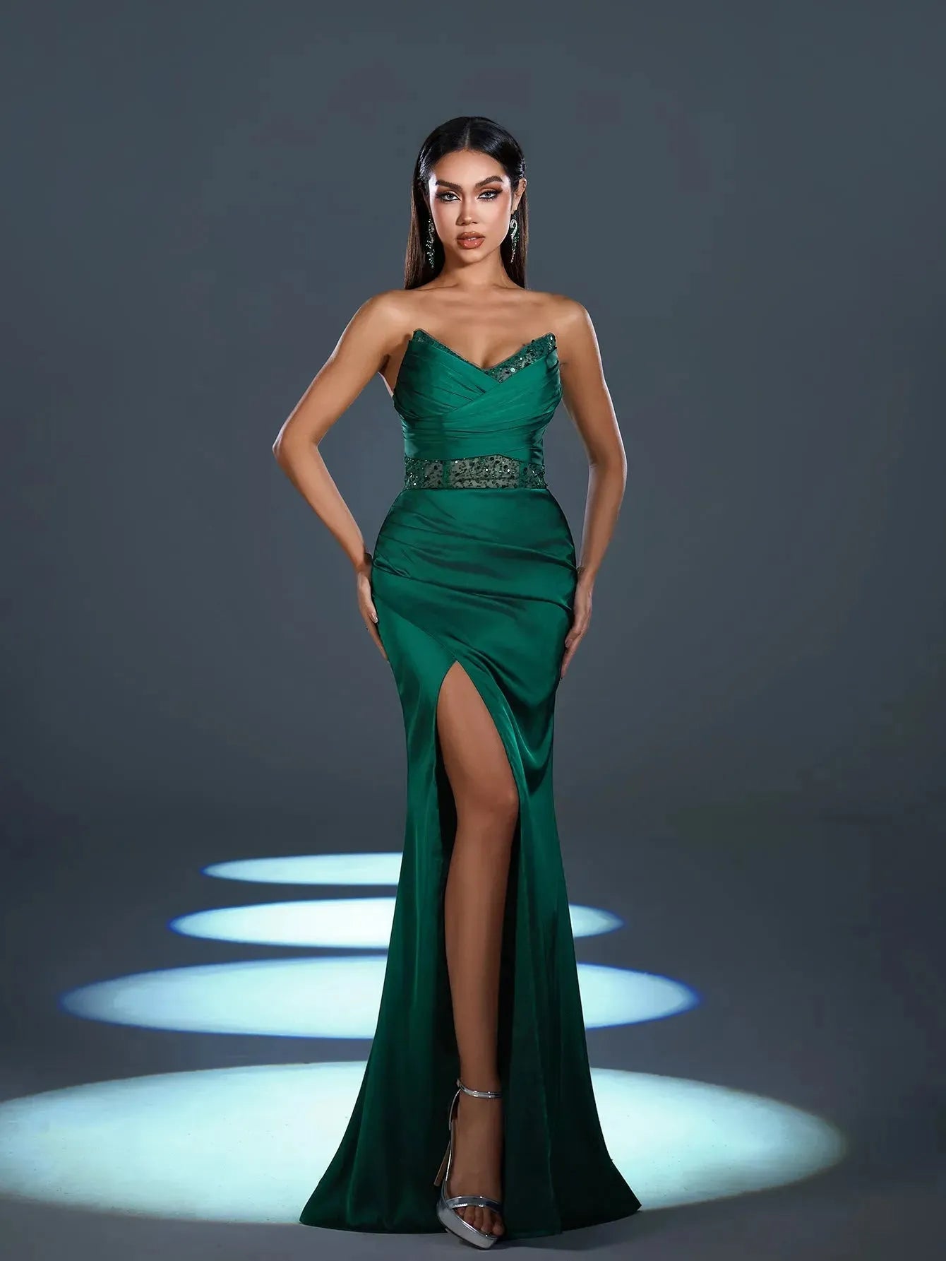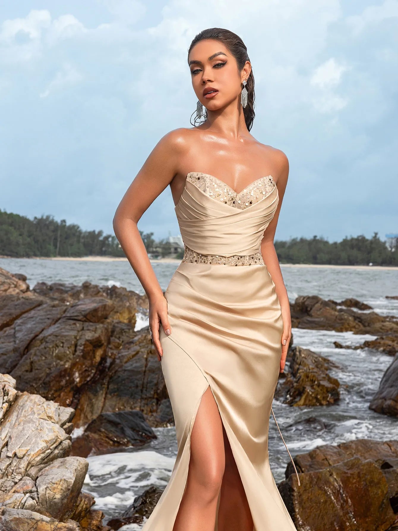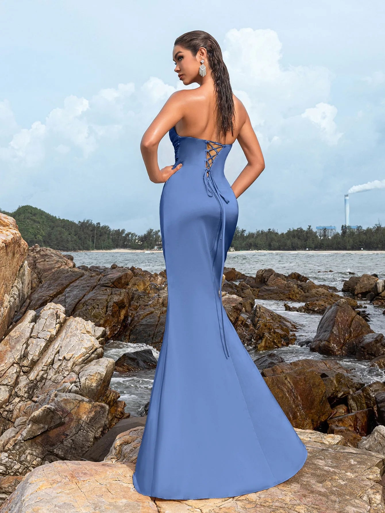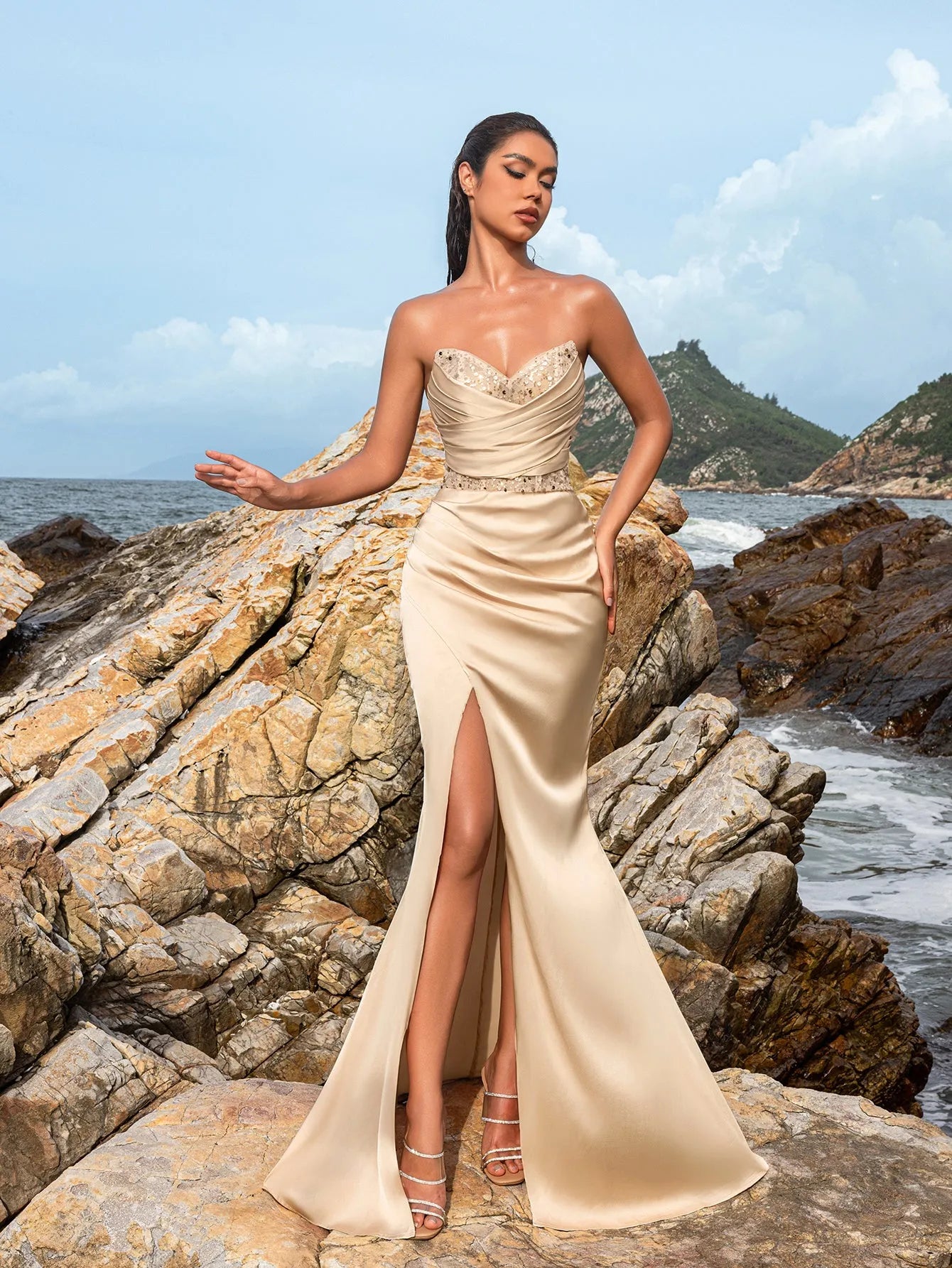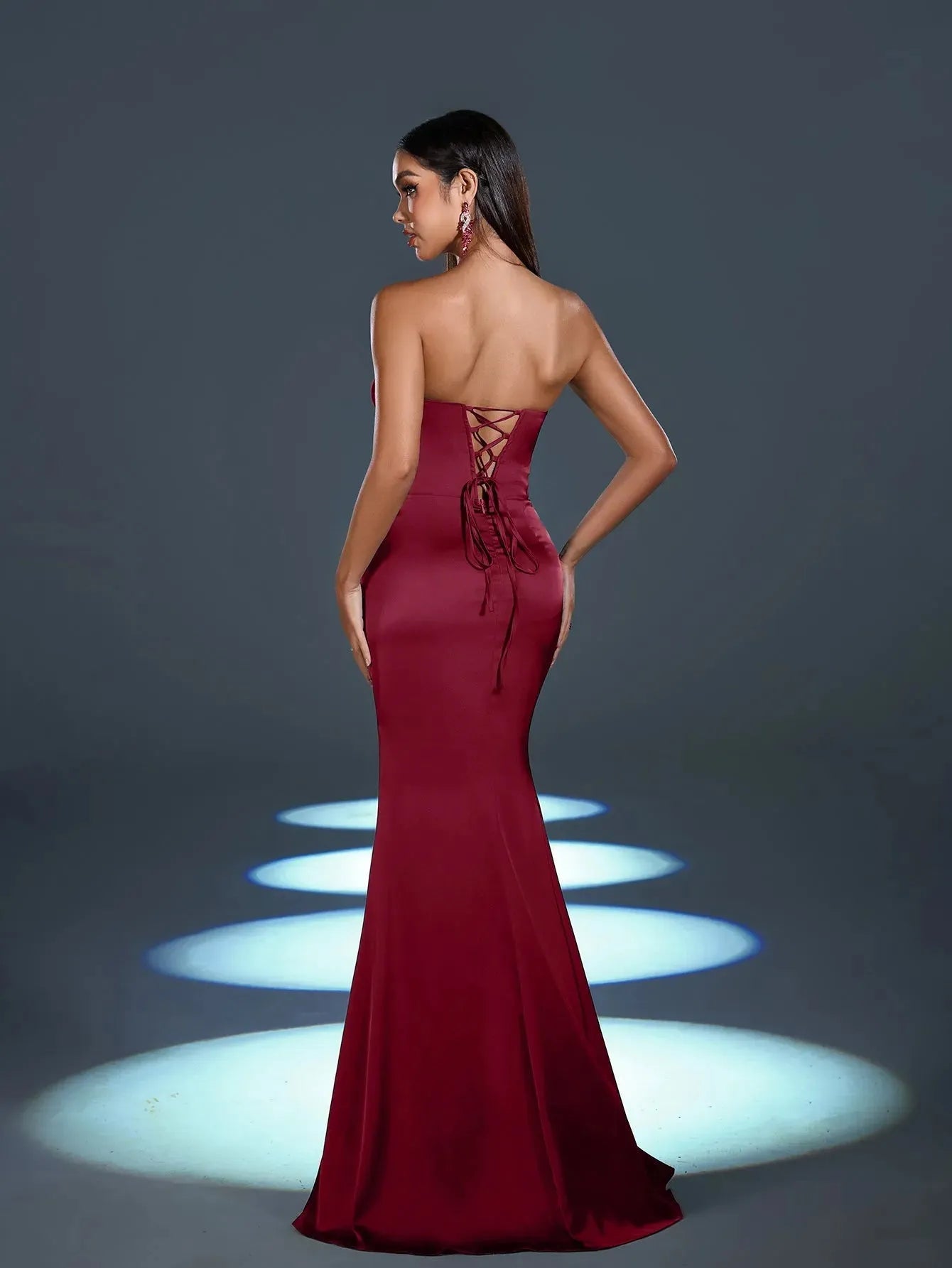 Experience elegance with our exquisite satin gown. This captivating dress features a fitted silhouette that beautifully contours your figure, while the high slit adds a touch of allure. The sweetheart neckline and ruched bodice create a sophisticated look, complemented by the intricate detailing at the waist. The lace-up back ensures a perfect fit, making you feel confident and glamorous.