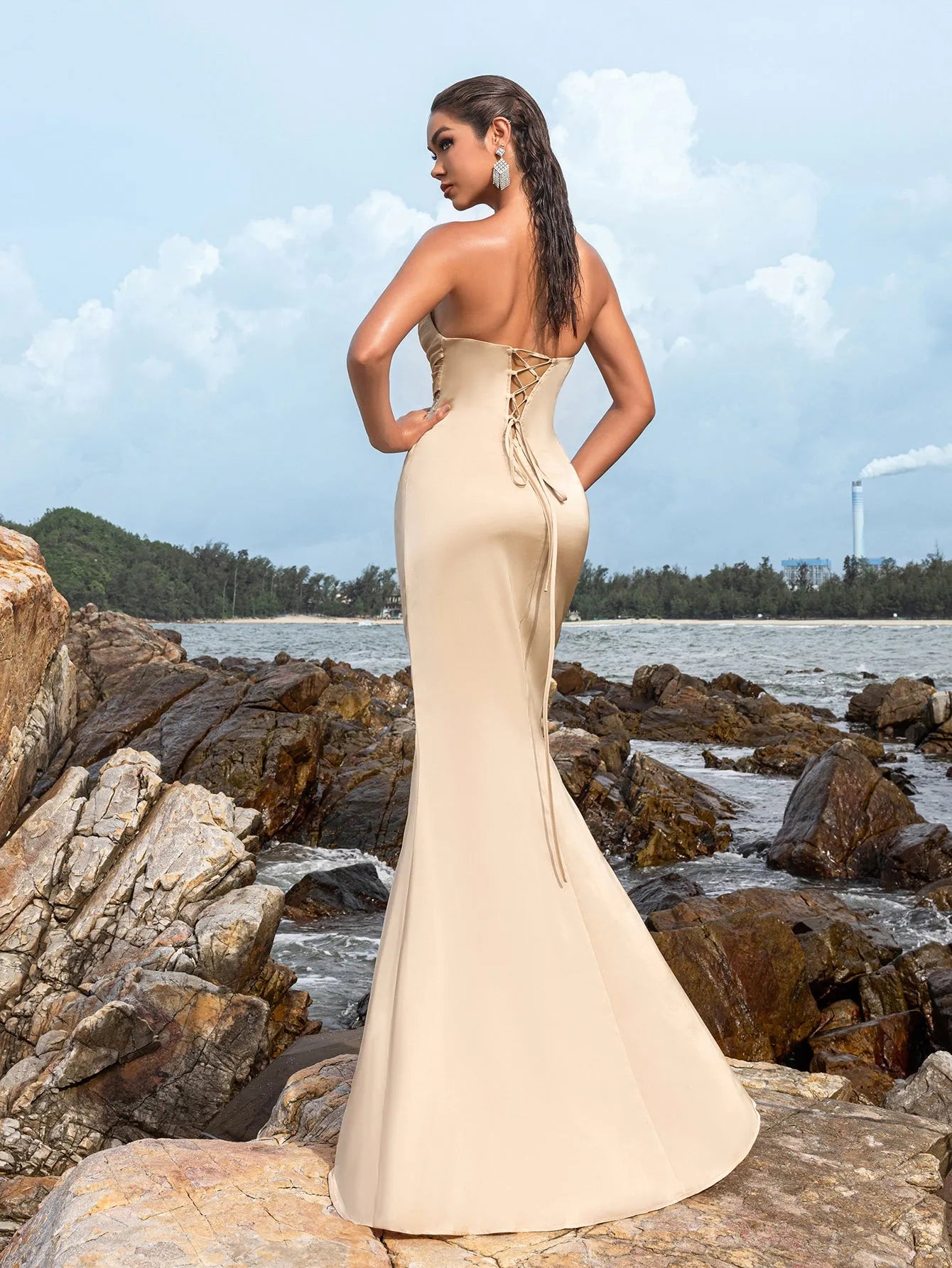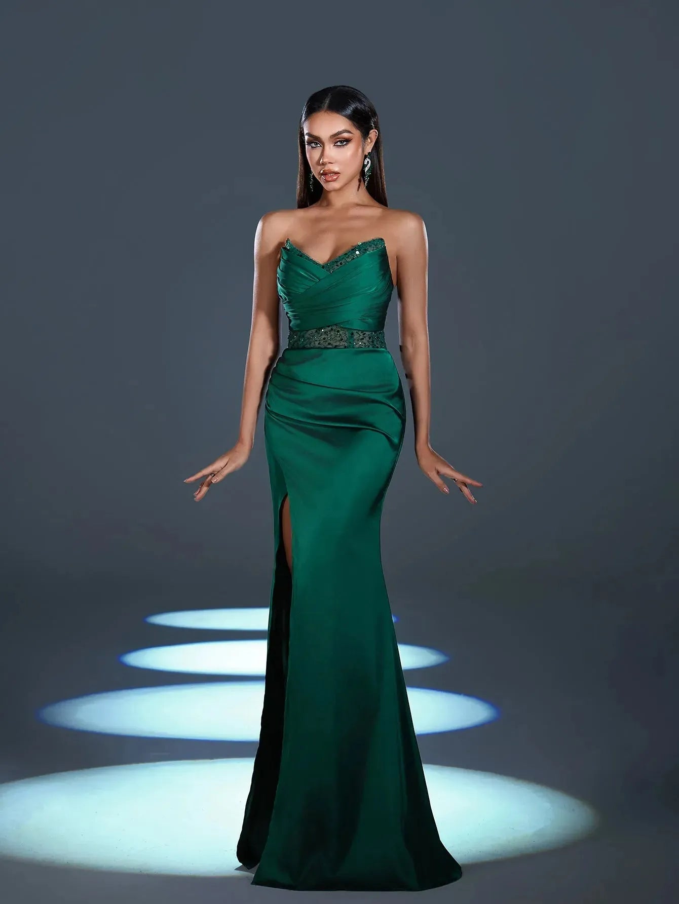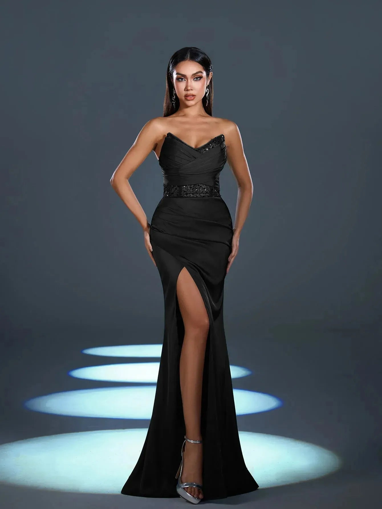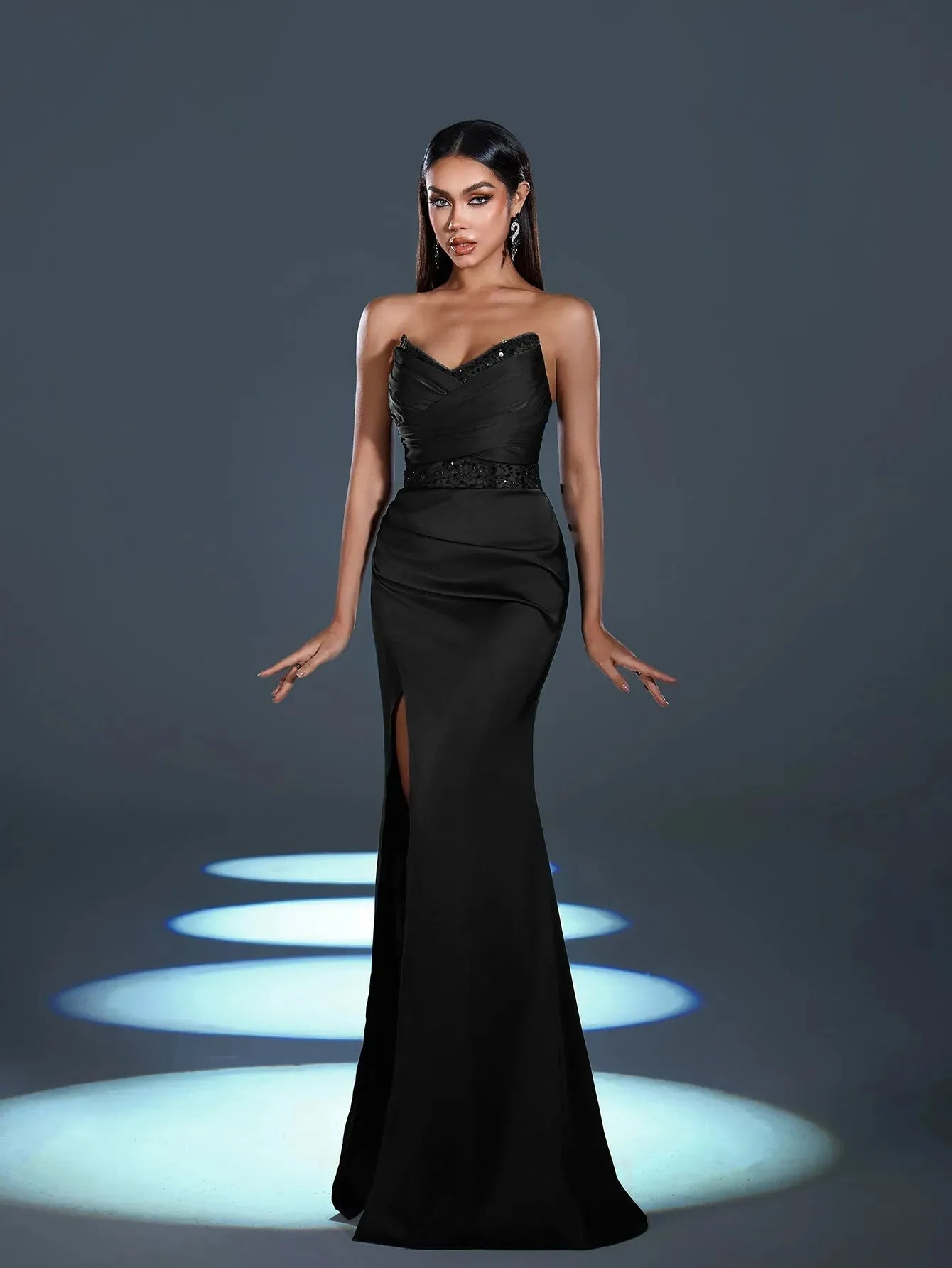 Experience elegance with our exquisite satin gown. This captivating dress features a fitted silhouette that beautifully contours your figure, while the high slit adds a touch of allure. The sweetheart neckline and ruched bodice create a sophisticated look, complemented by the intricate detailing at the waist. The lace-up back ensures a perfect fit, making you feel confident and glamorous.