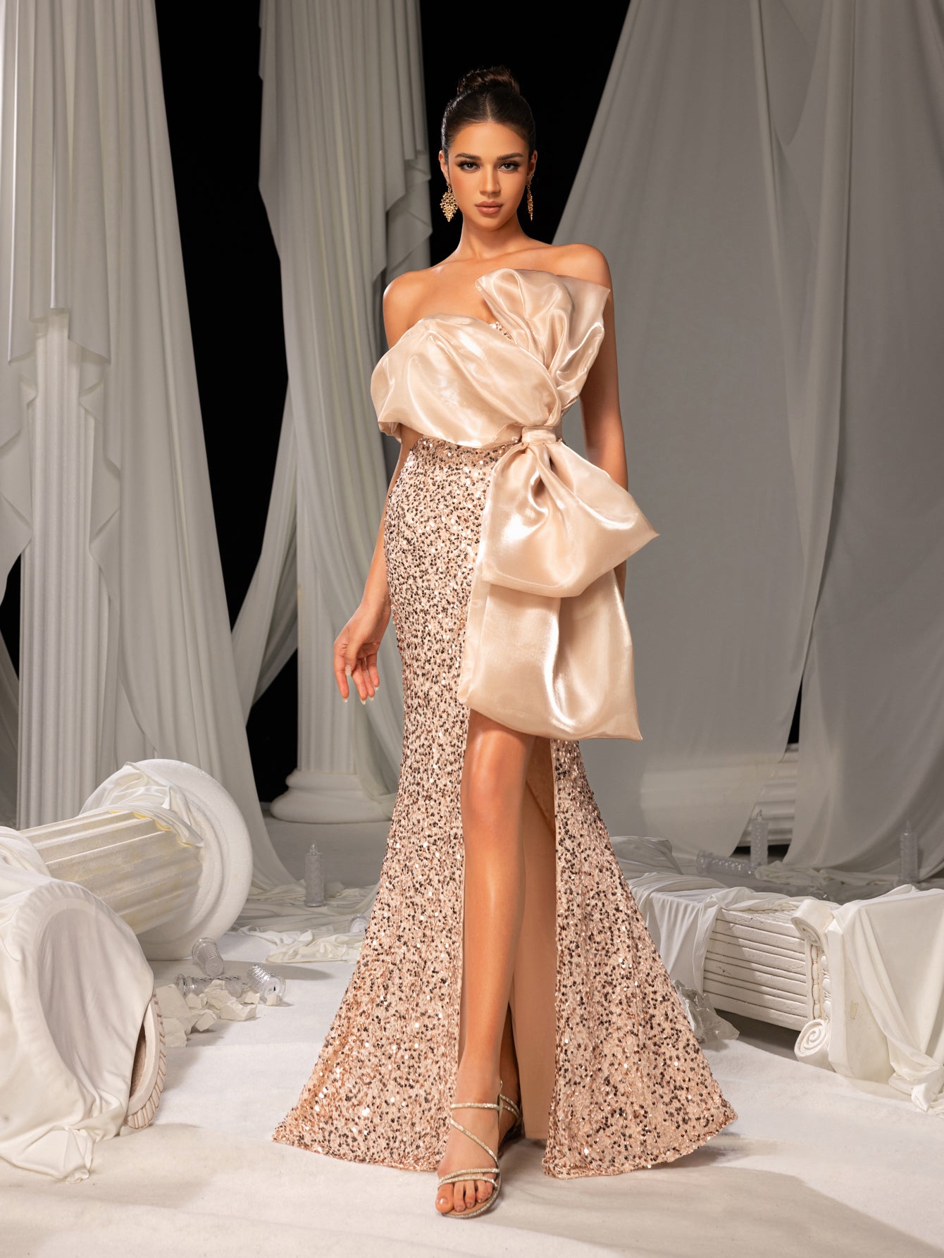 ✨ Bold Elegance Meets Sensuality: This strapless sequined gown combines a daring high slit with a graceful bow detail at the neckline, blending sophistication and allure. The cascading mermaid silhouette skims the body, while the sequin embellishments shimmer under light, ensuring you radiate confidence at any event.