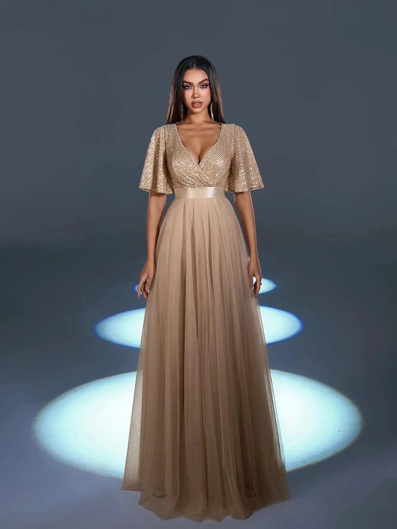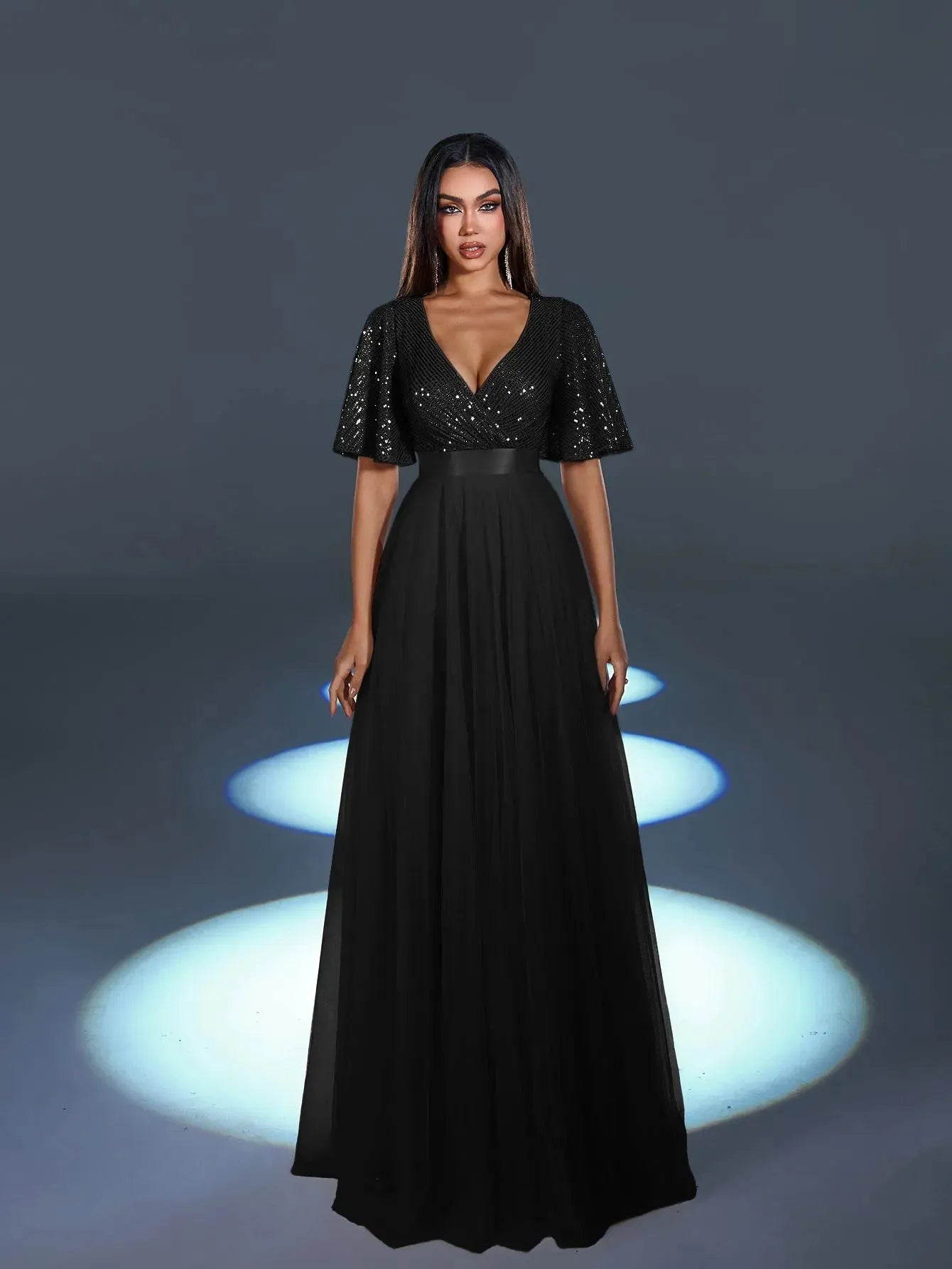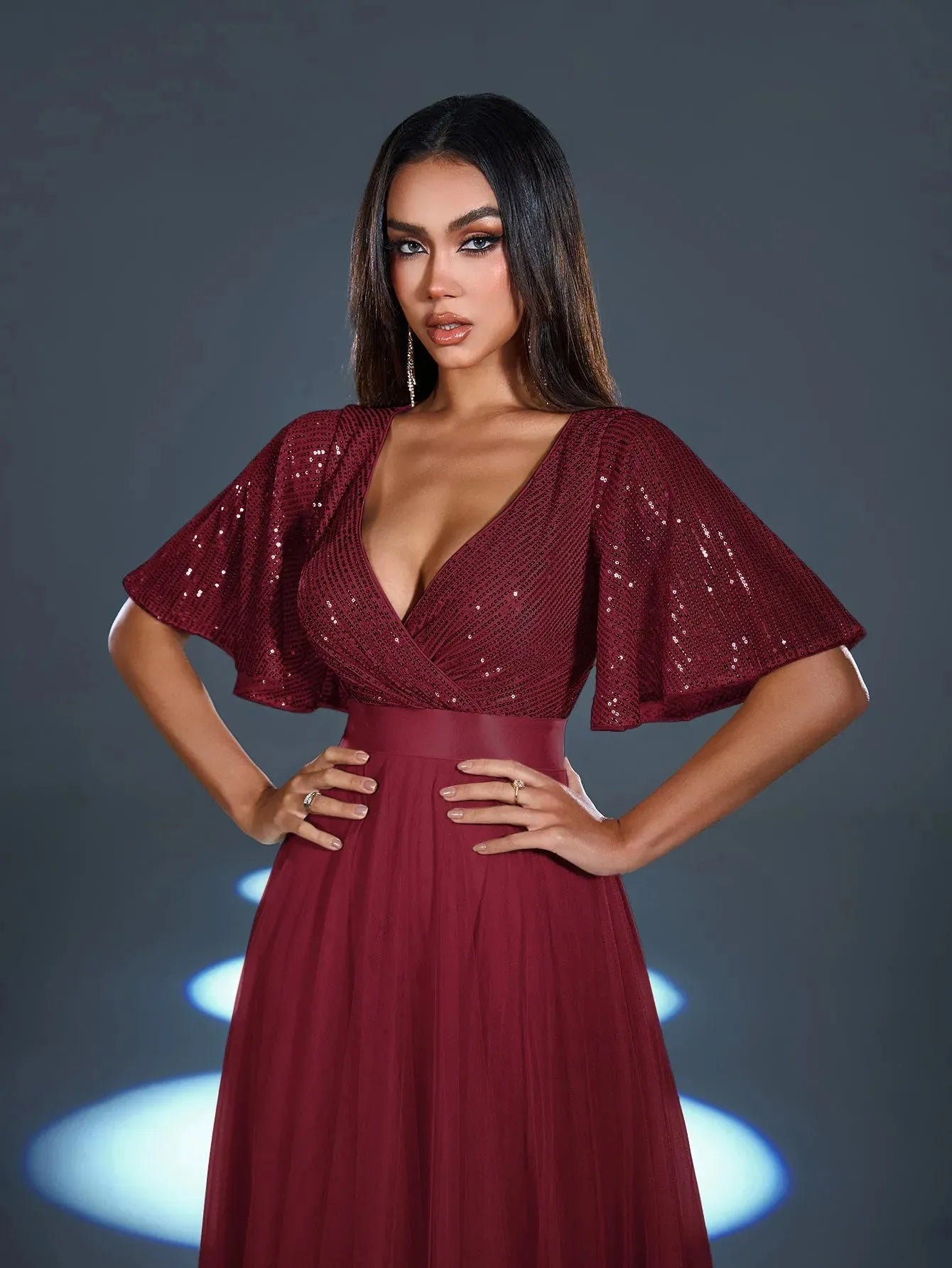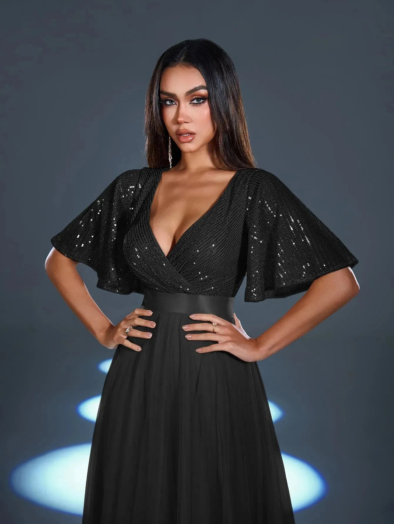 Dazzle in our luxurious evening gown, designed to make a statement. The bodice is adorned with shimmering sequins, creating a glamorous look that captures the light beautifully. The dress features elegant flutter sleeves and a deep V-neckline, adding a touch of allure. The flowing tulle skirt ensures a graceful and ethereal appearance, perfect for any formal event.