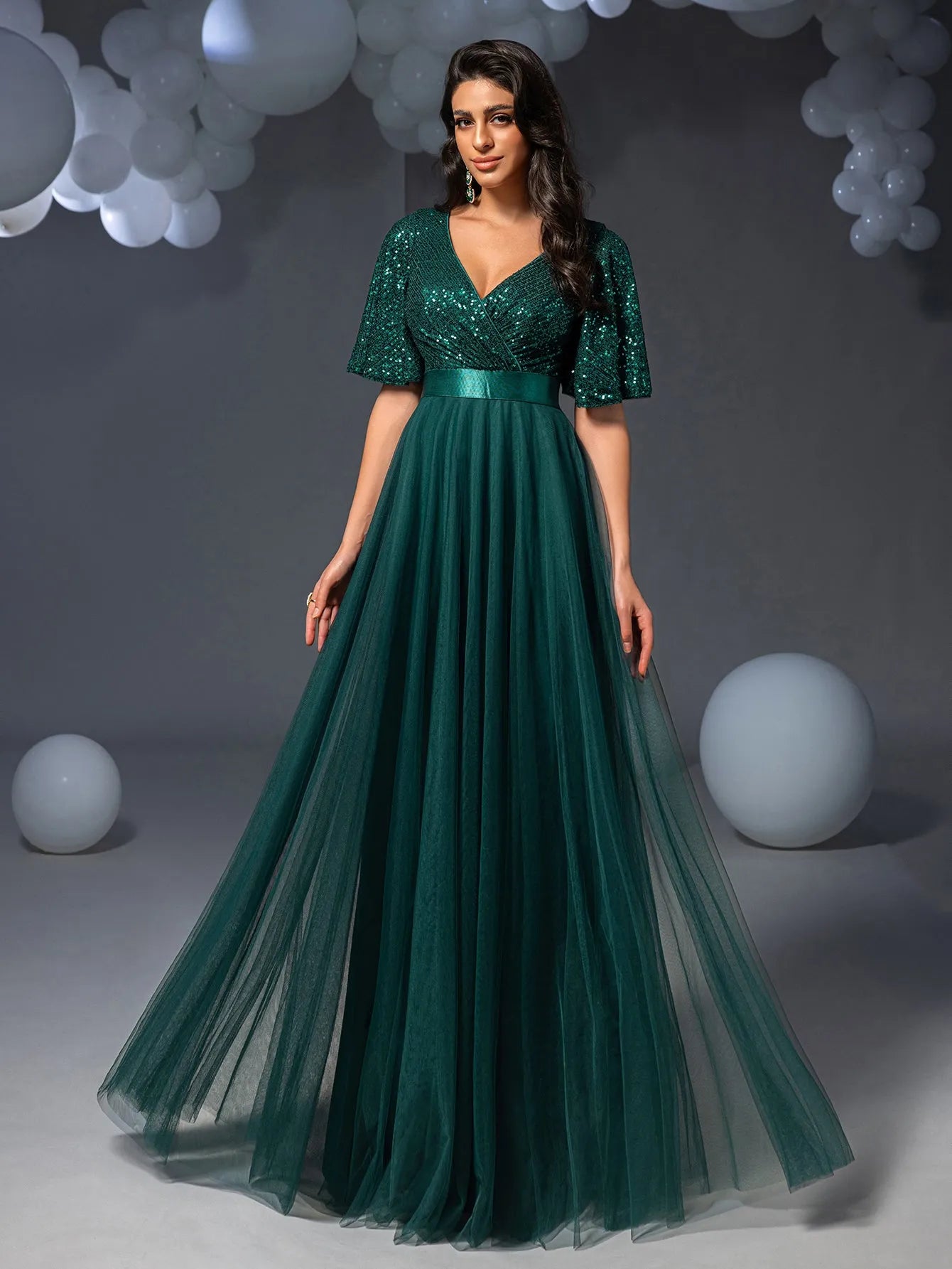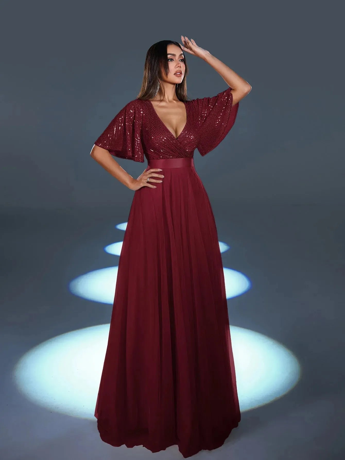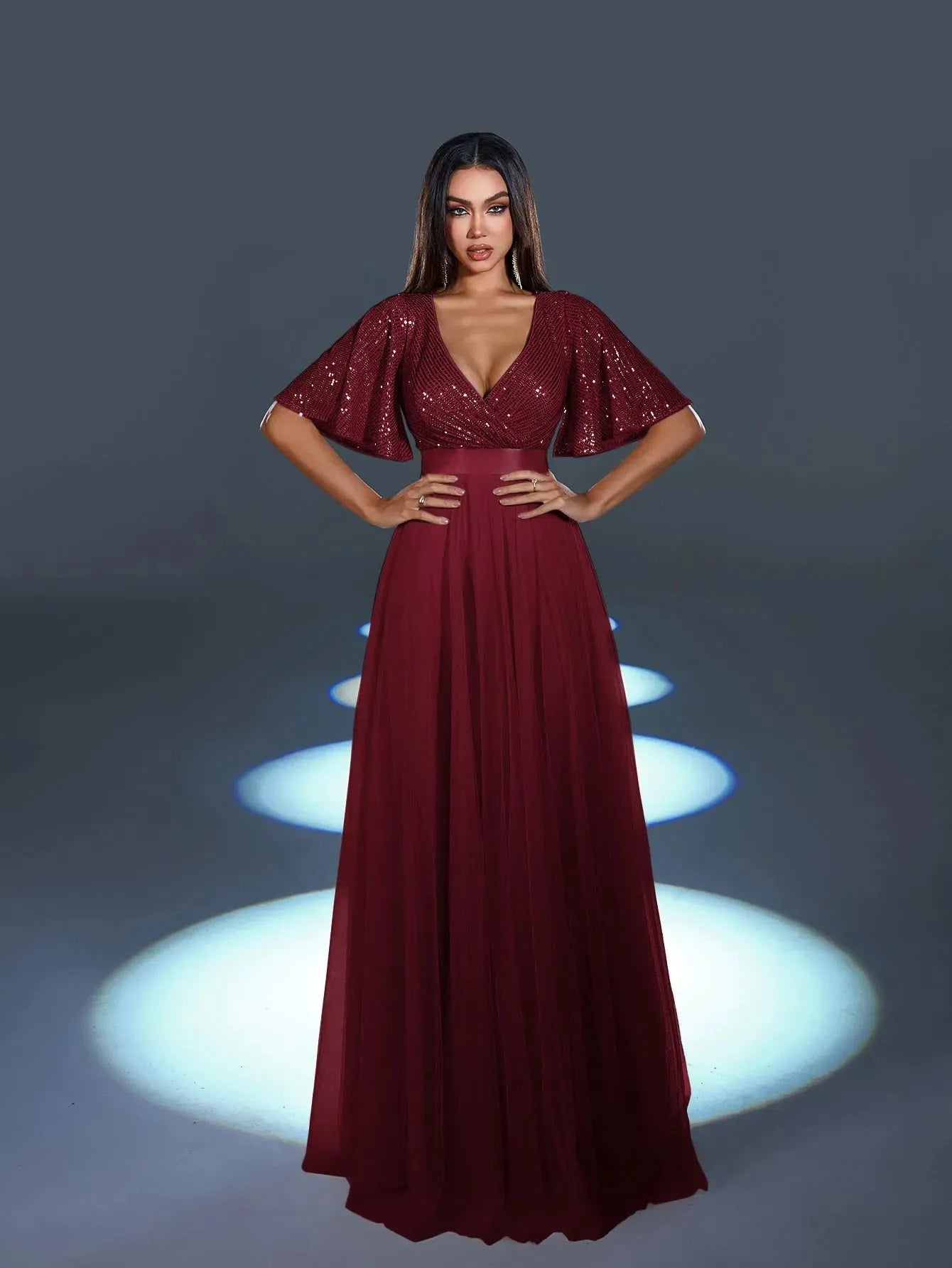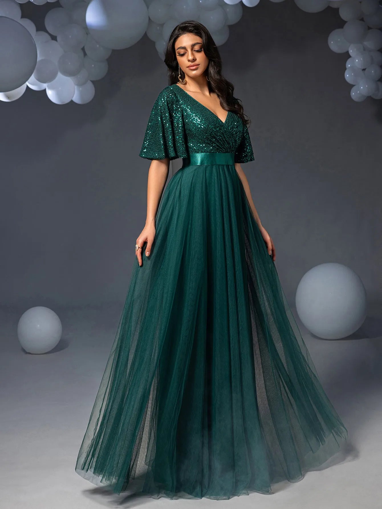Dazzle in our luxurious evening gown, designed to make a statement. The bodice is adorned with shimmering sequins, creating a glamorous look that captures the light beautifully. The dress features elegant flutter sleeves and a deep V-neckline, adding a touch of allure. The flowing tulle skirt ensures a graceful and ethereal appearance, perfect for any formal event.